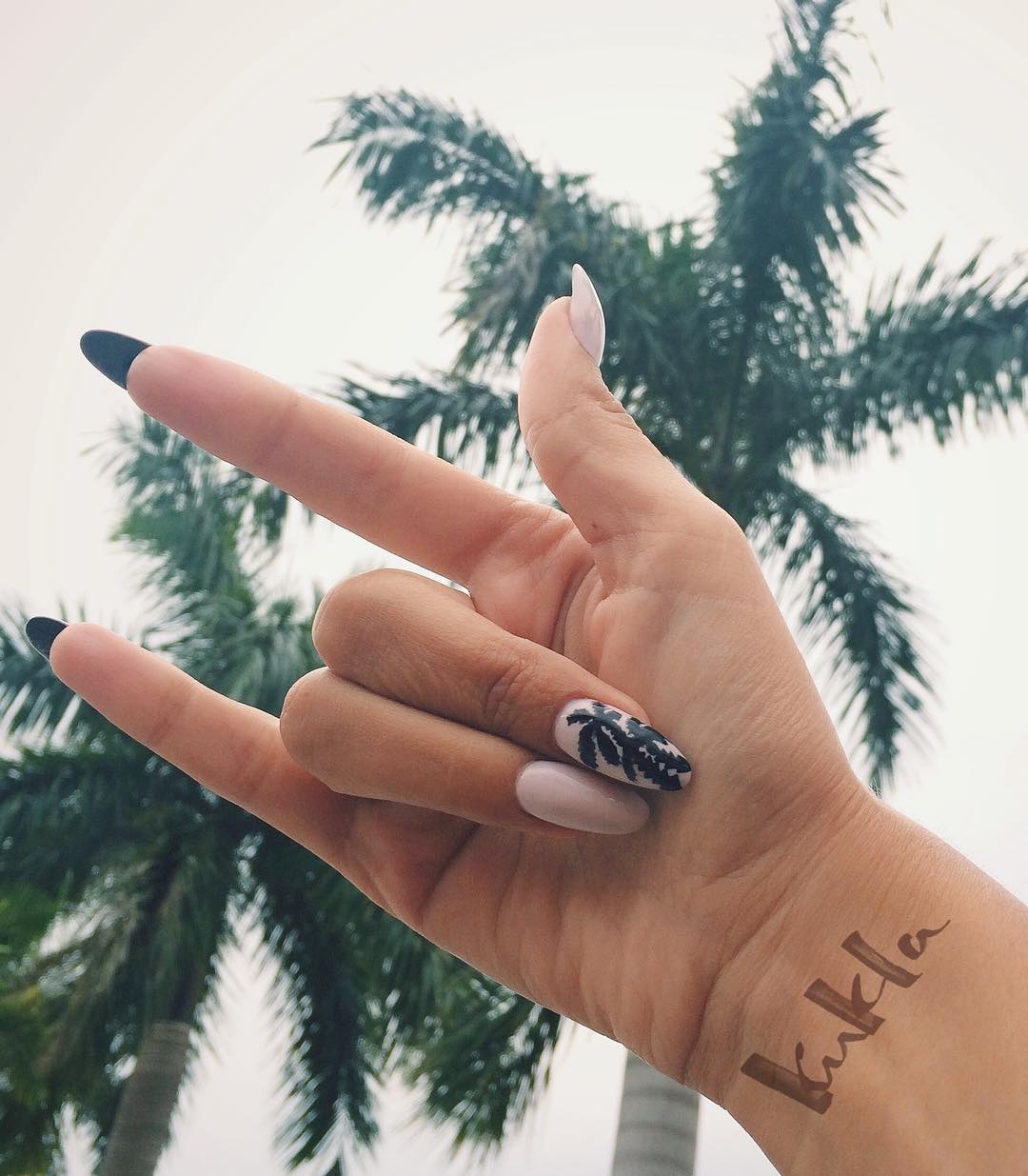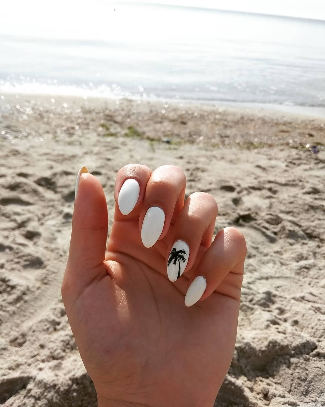 Мы уже отмечали, что пальмовый маникюр — универсальный. Он отлично смотрится как на длинных, так и коротких ноготках. А форма пластины вообще не имеет значения.