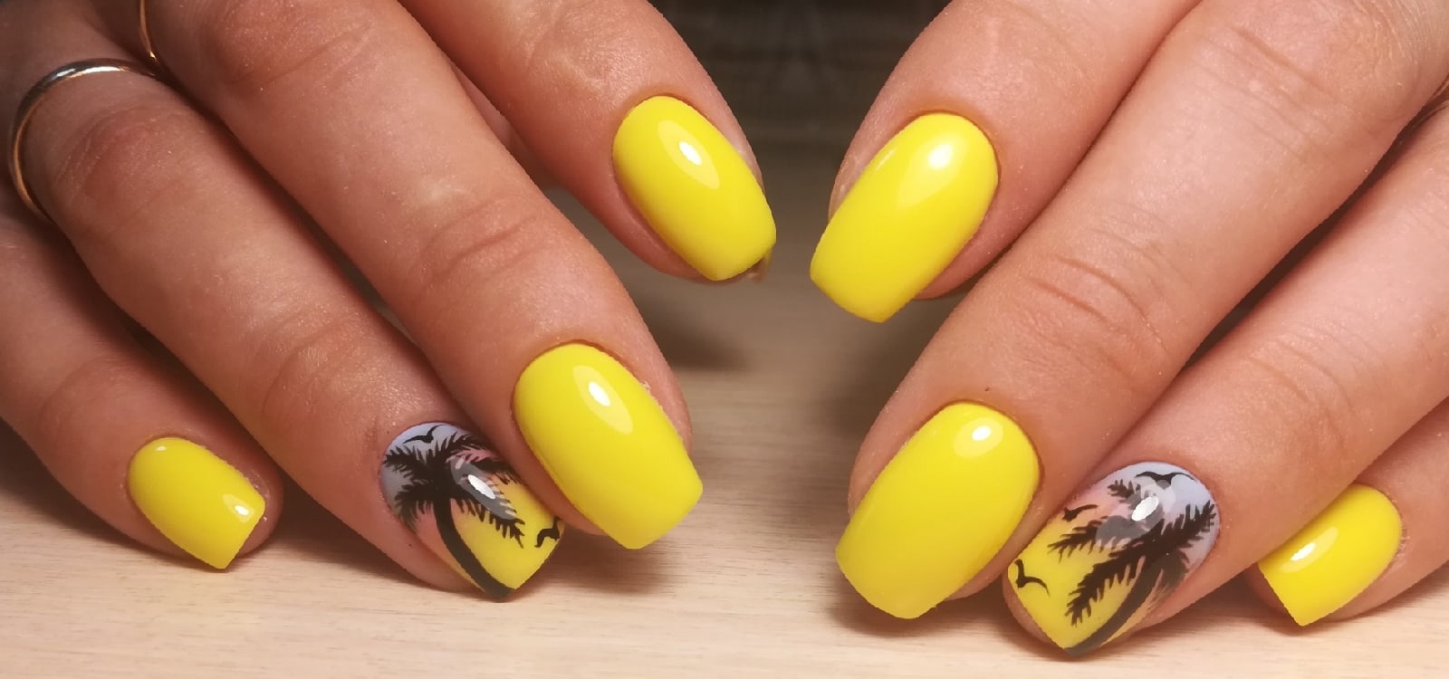 - Подготовка материалов. Мы предлагаем взять два оттенка лака для основы — желтый (банановый или пастельный) и оранжево-коралловый. Кроме того, понадобится еще и черный лак для прорисовки пальм. И не забывайте о том, что нужна хорошая база и топ для закрепления дизайна. Но вы можете выбрать любые другие оттенки лака для создания своего варианта трудового нейл-арта.