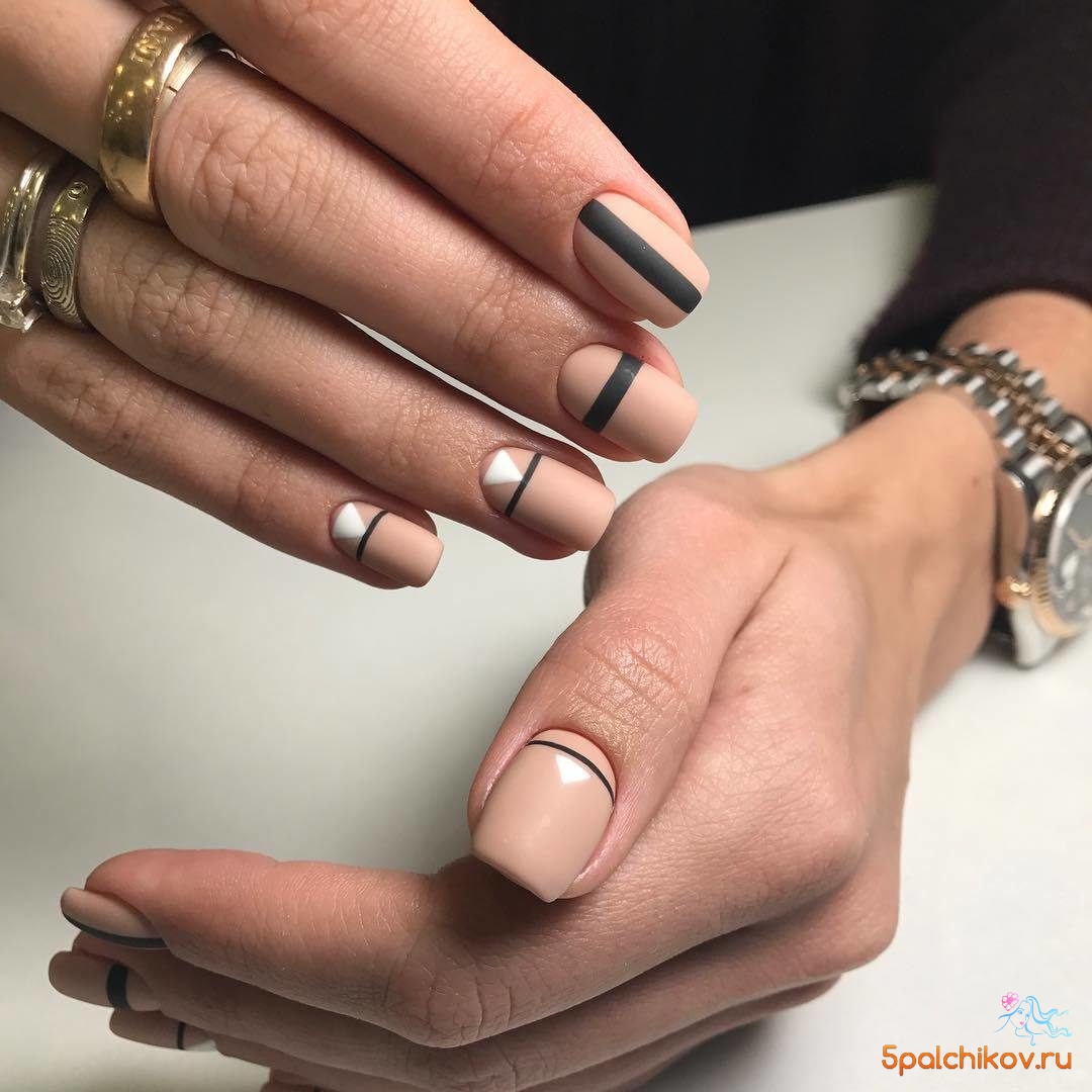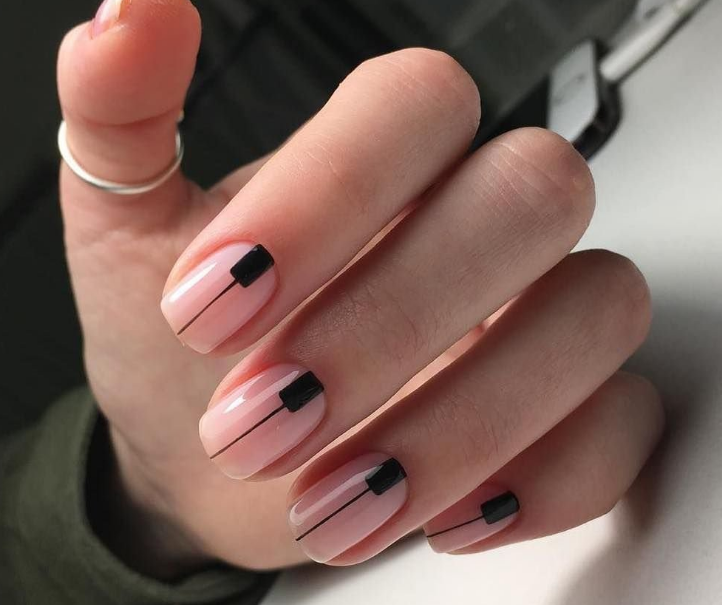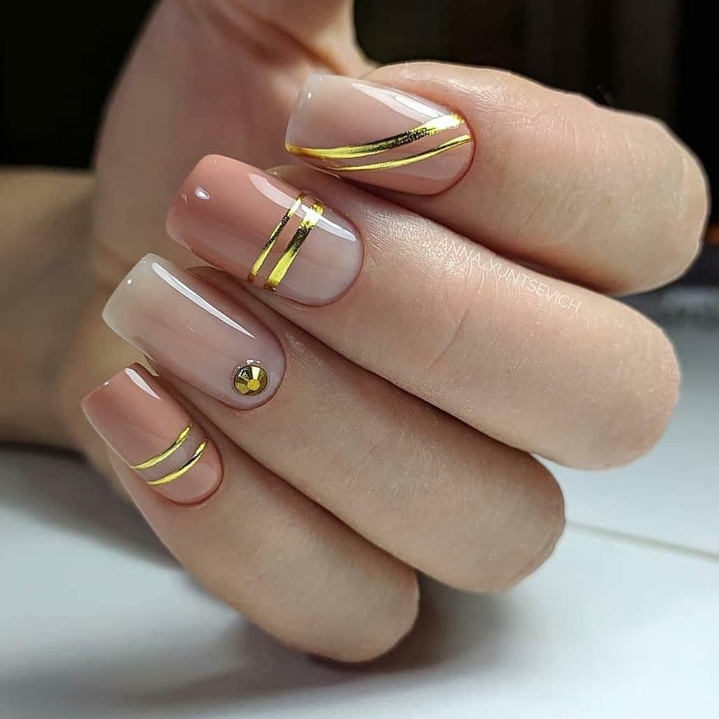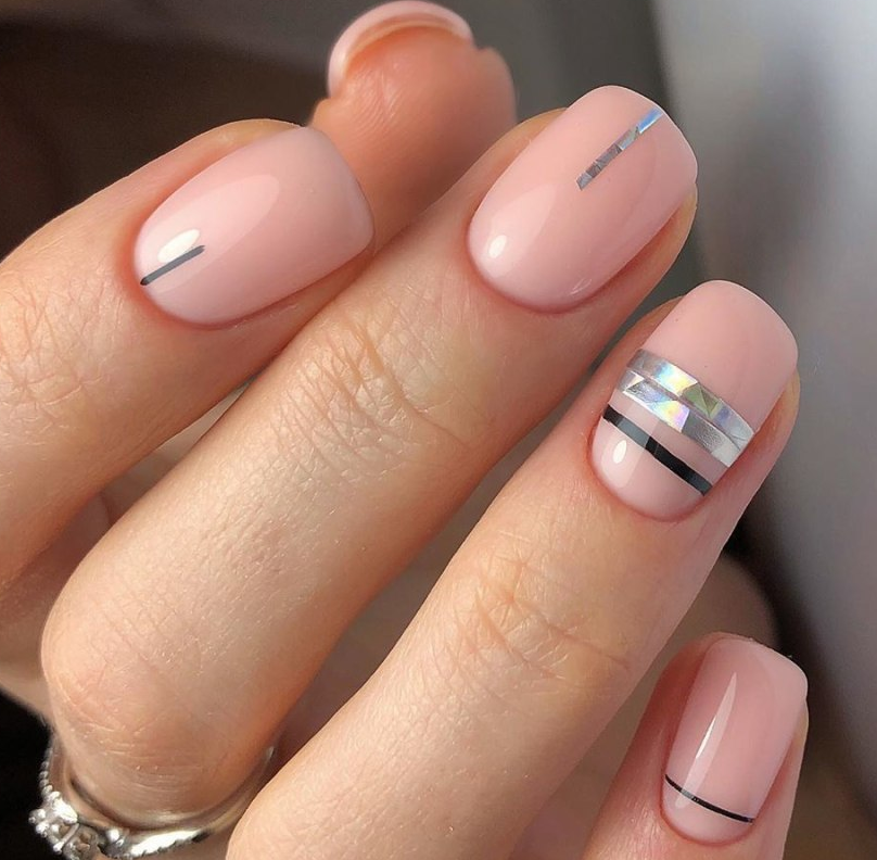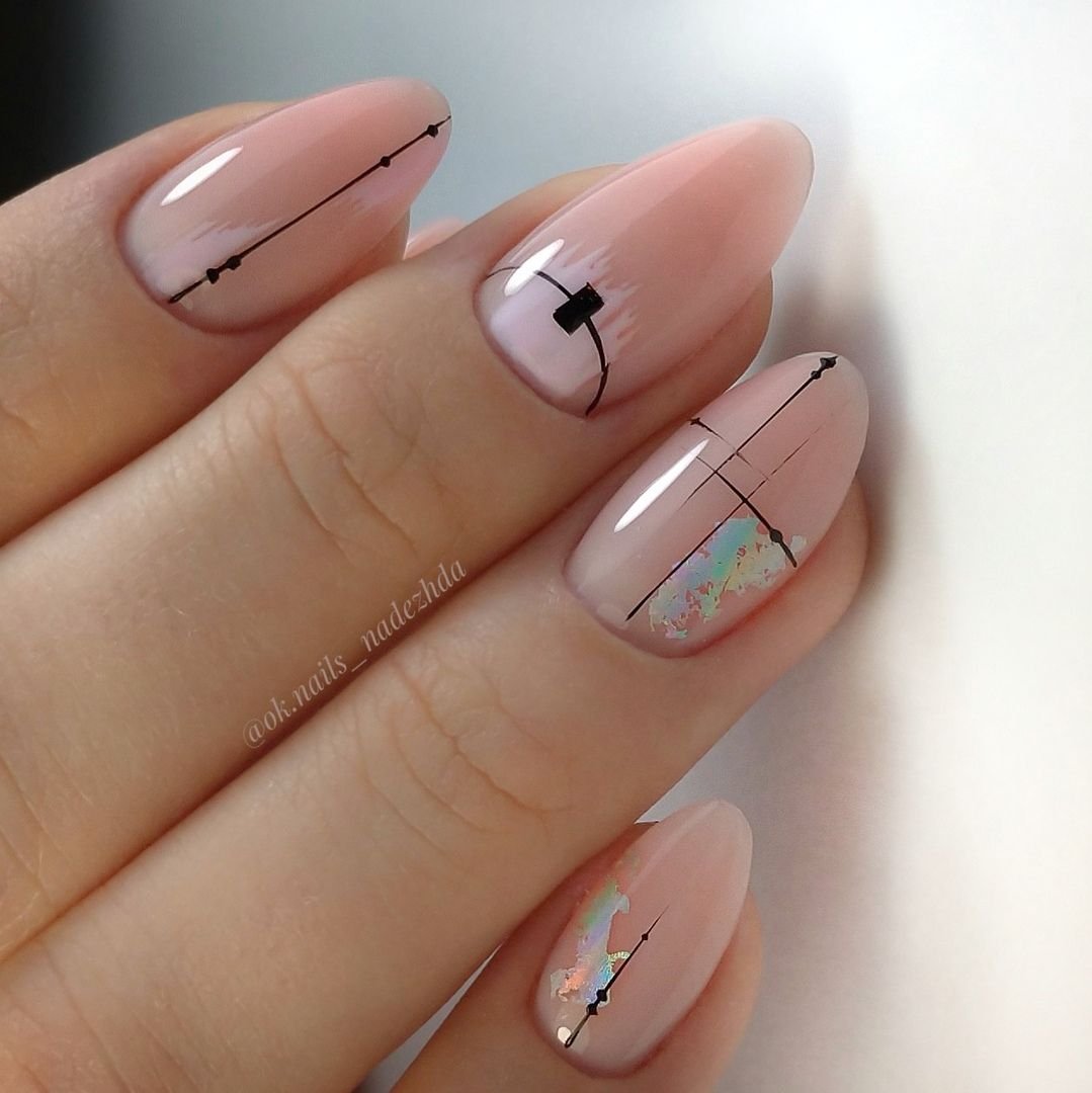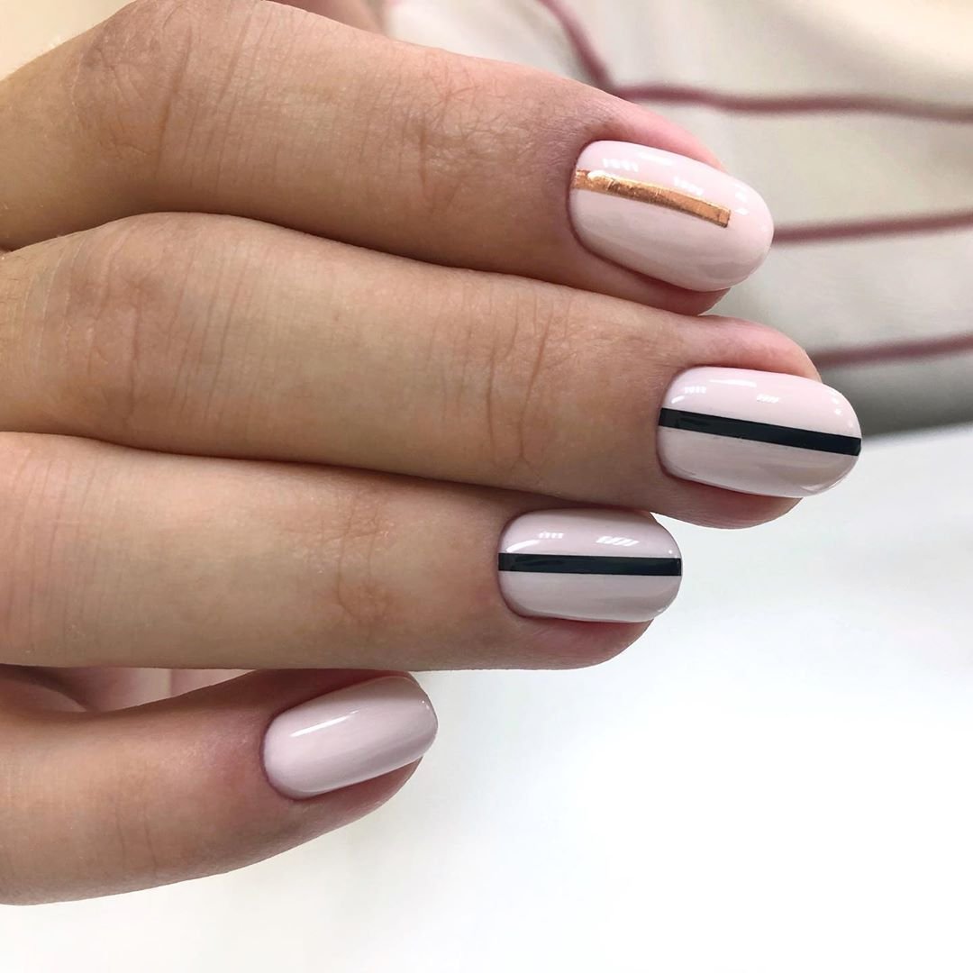 Нюдовый маникюр — это отличная база на каждый день. При желании ее можно будет дополнить дизайном с яркими деталями. Или простыми полосками, которые вы можете нарисовать самостоятельно. Линии могут быть контрастными или пастельными. Выбирать только вам.