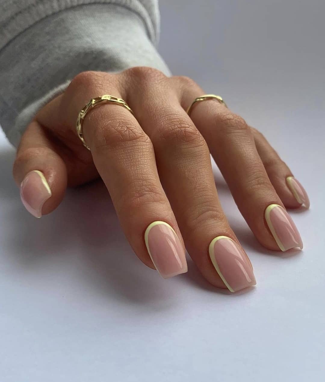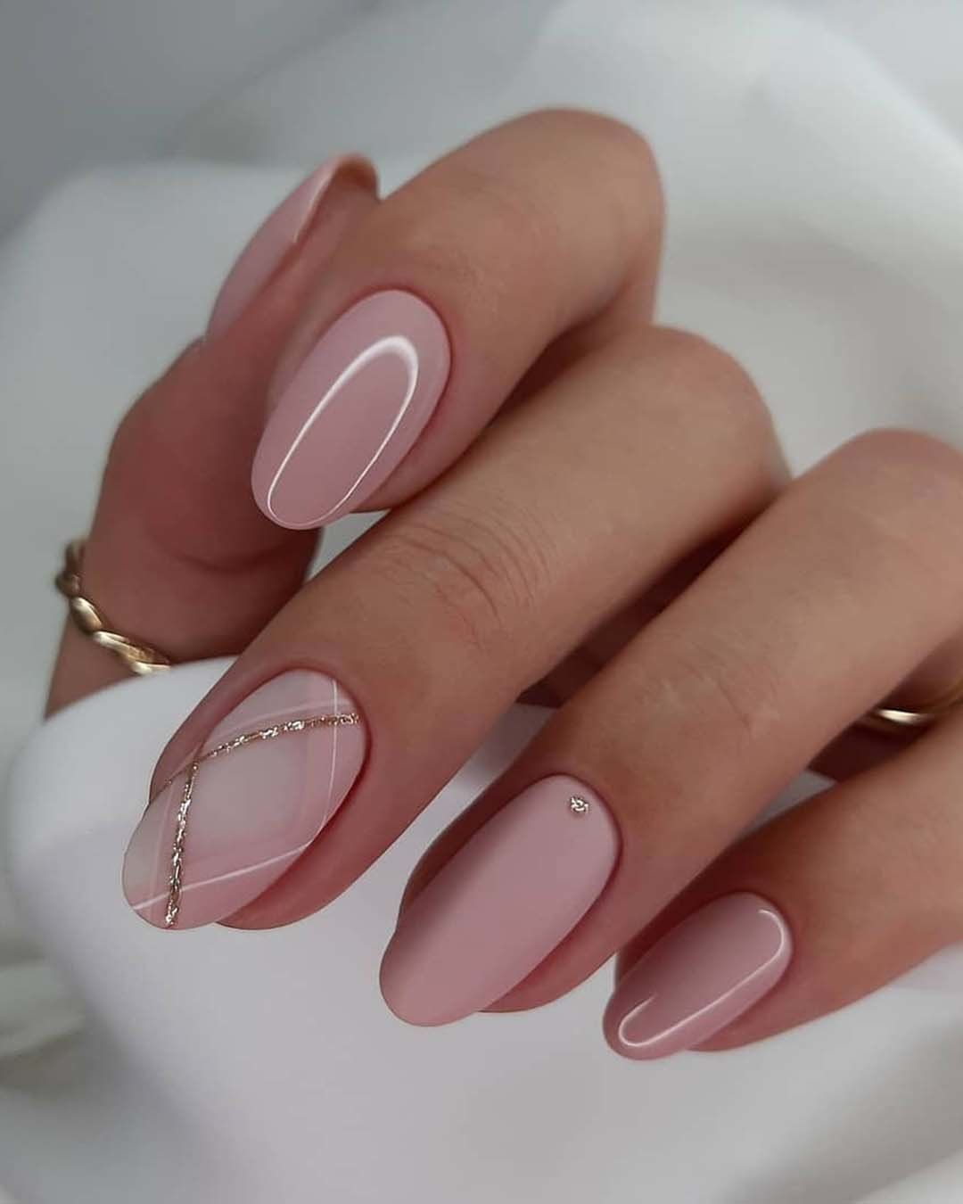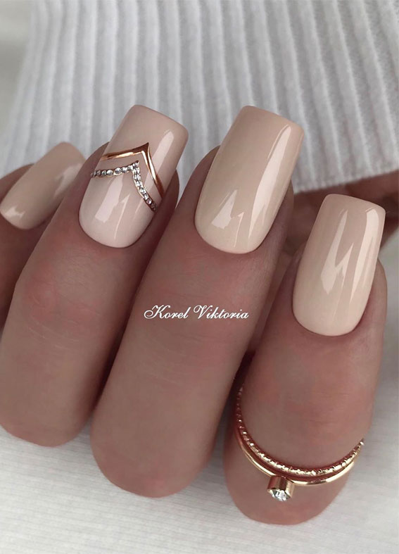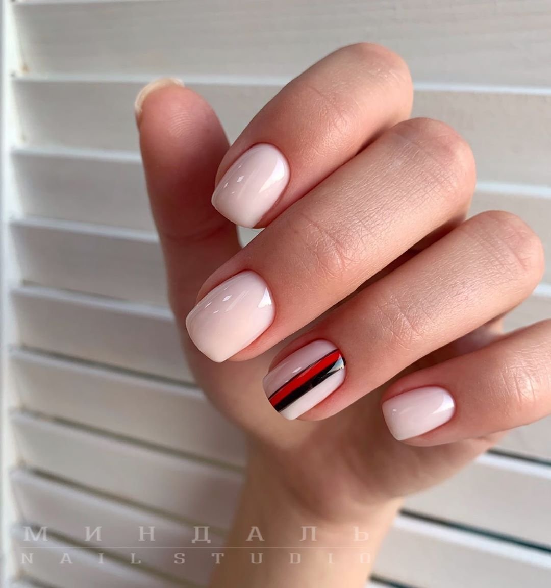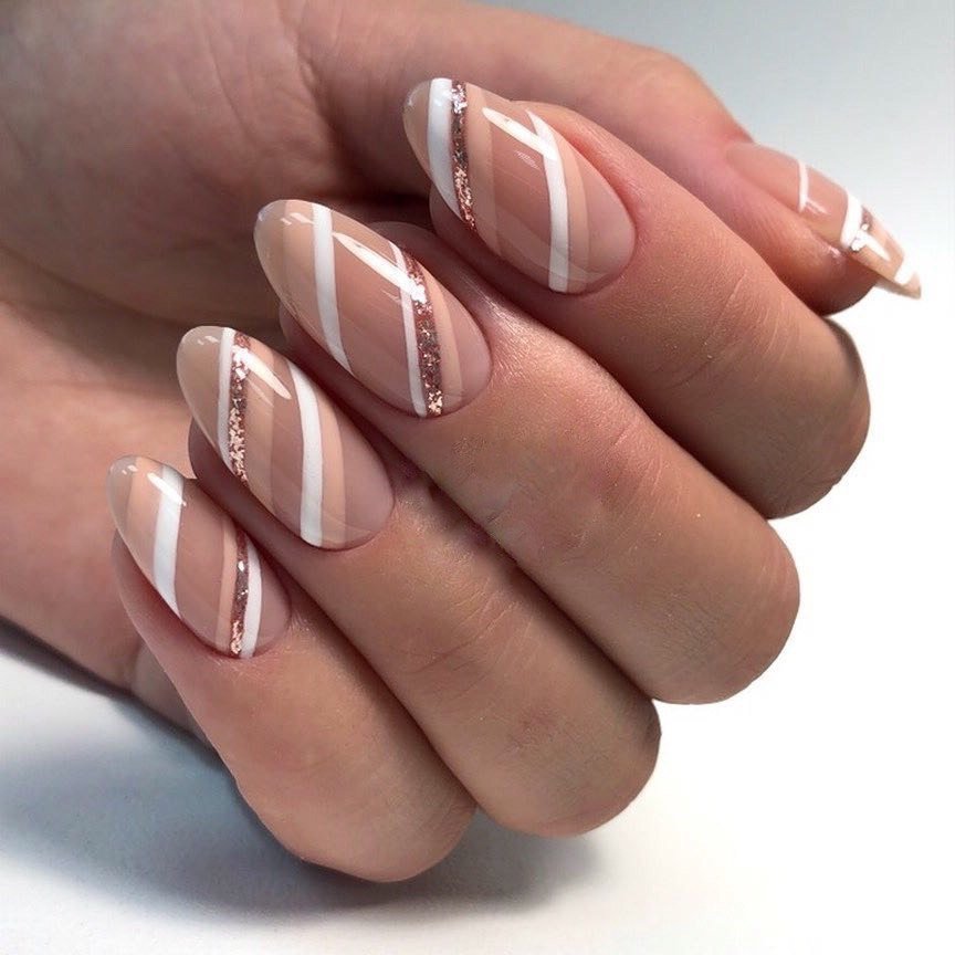 Нюдовый маникюр — это отличная база на каждый день. При желании ее можно будет дополнить дизайном с яркими деталями. Или простыми полосками, которые вы можете нарисовать самостоятельно. Линии могут быть контрастными или пастельными. Выбирать только вам.
