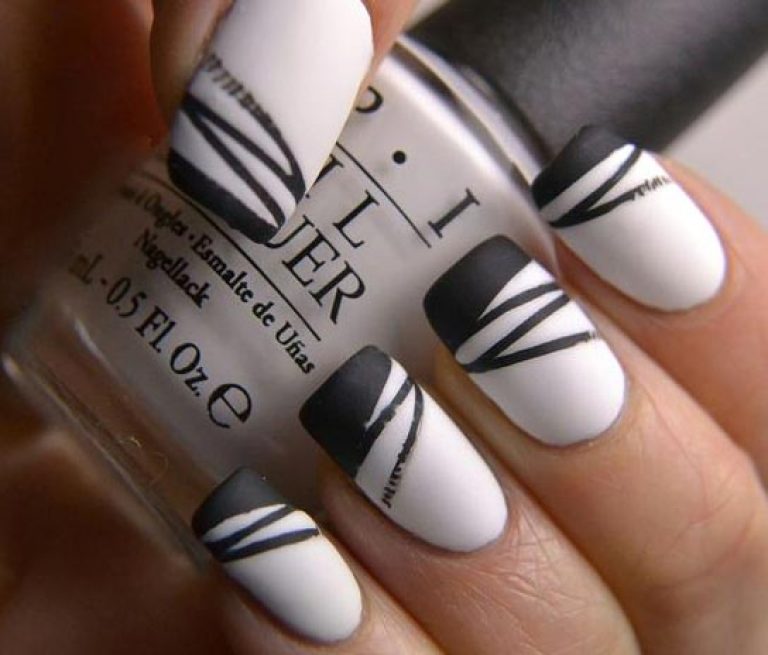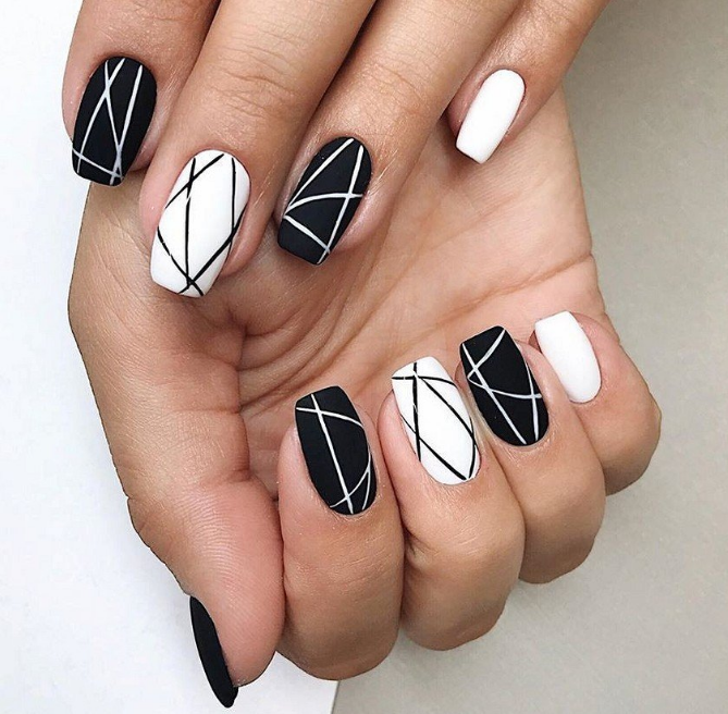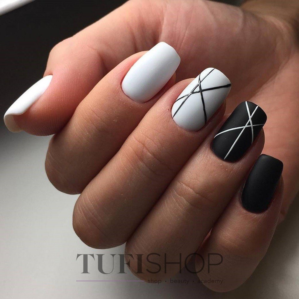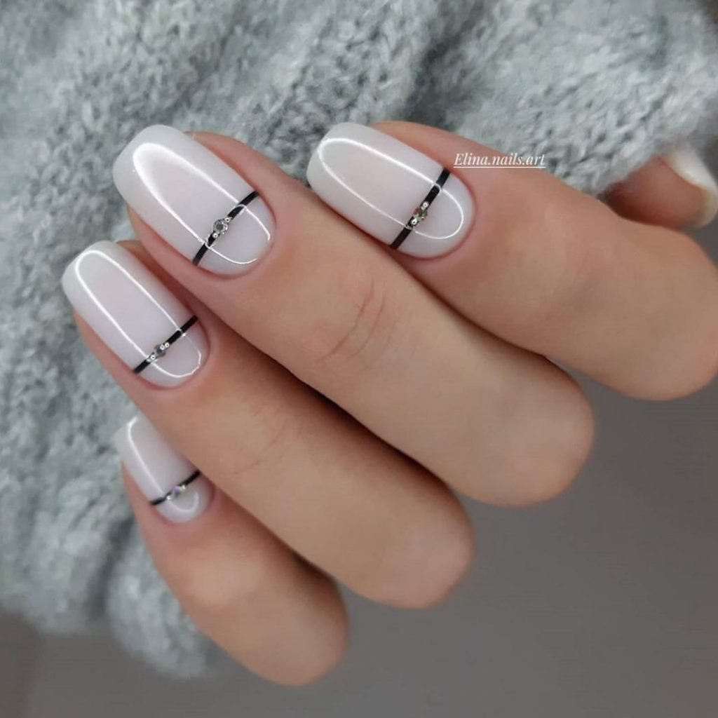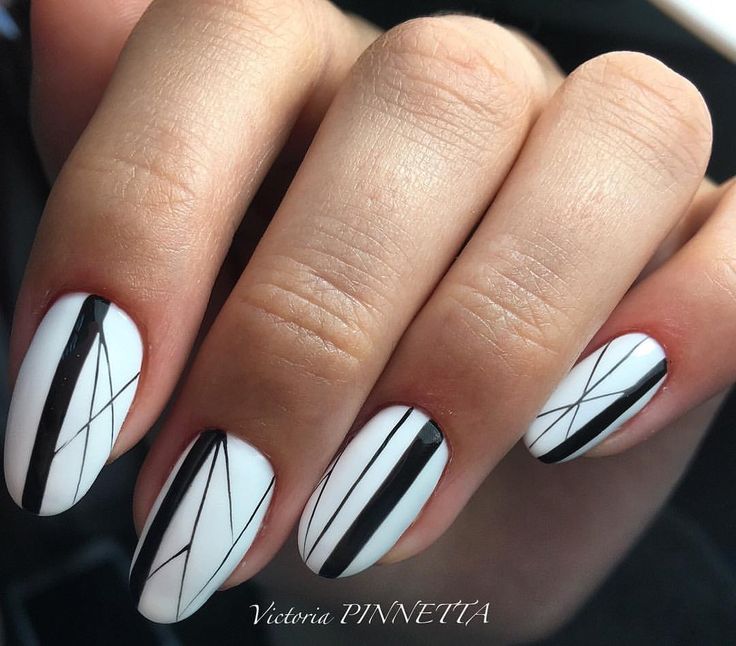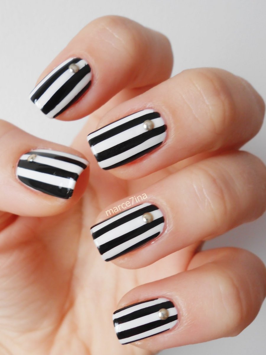 - Белый маникюр с черными полосками