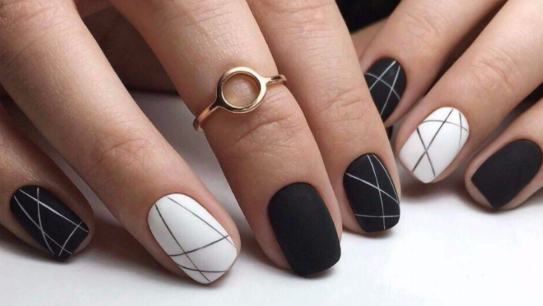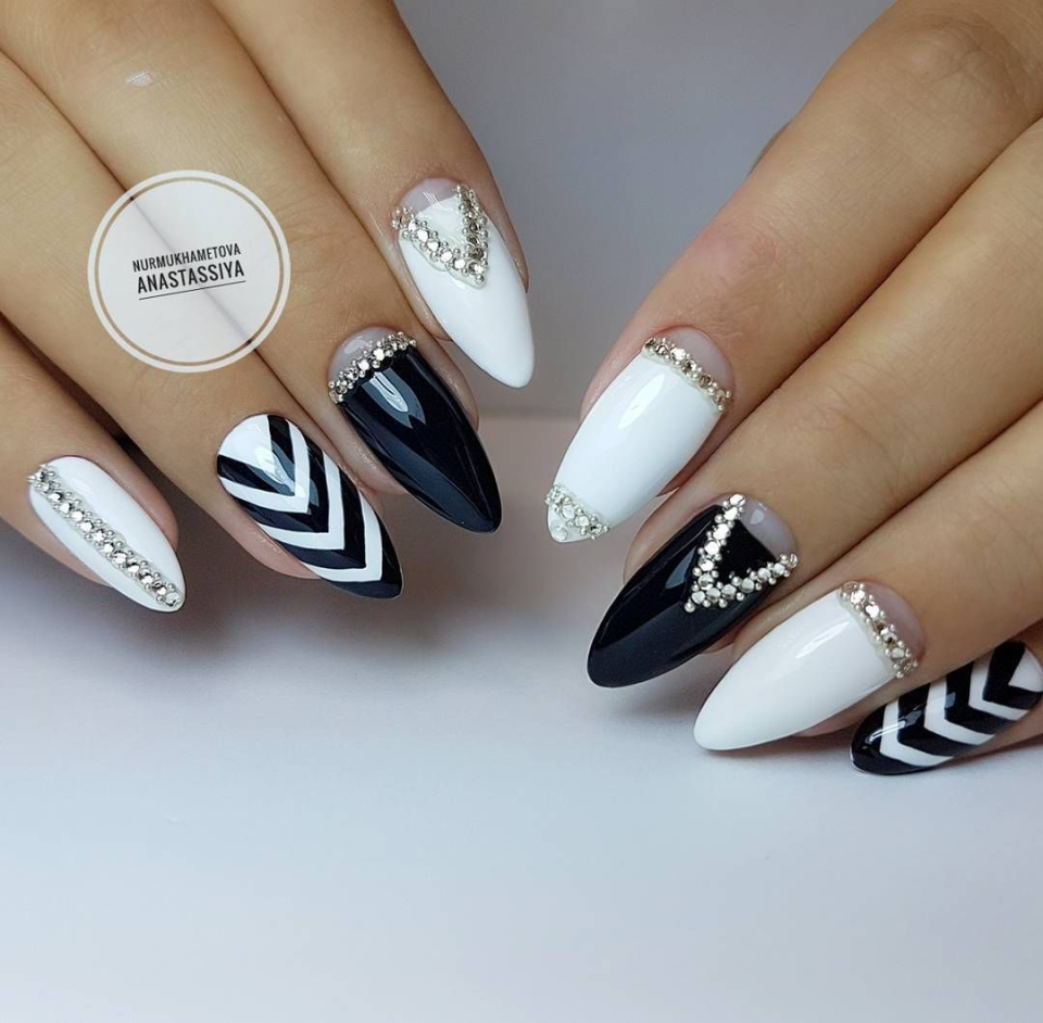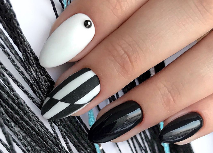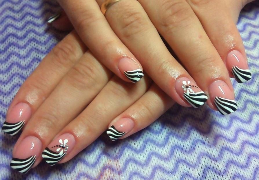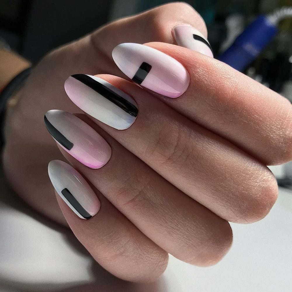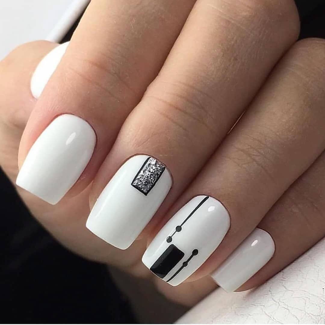 - Белый маникюр с черными полосками