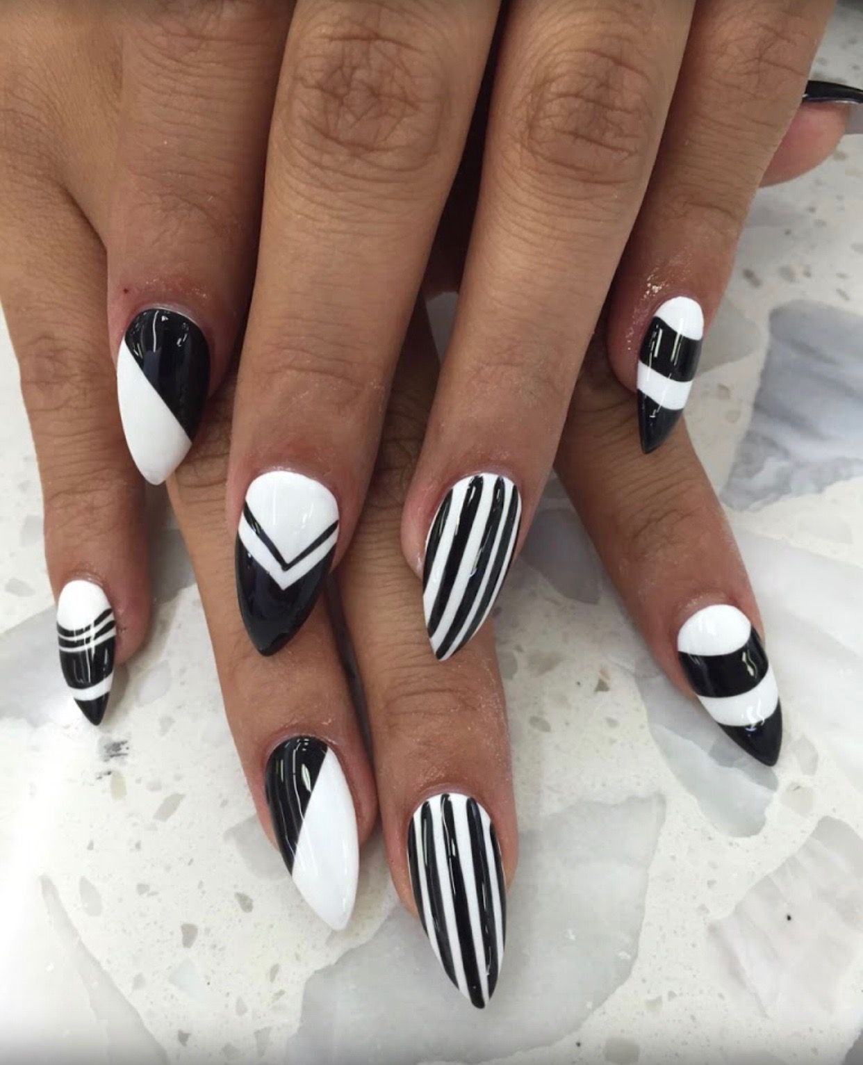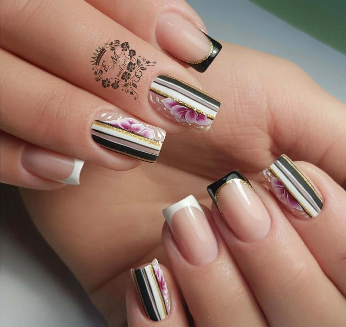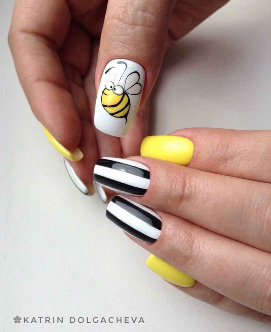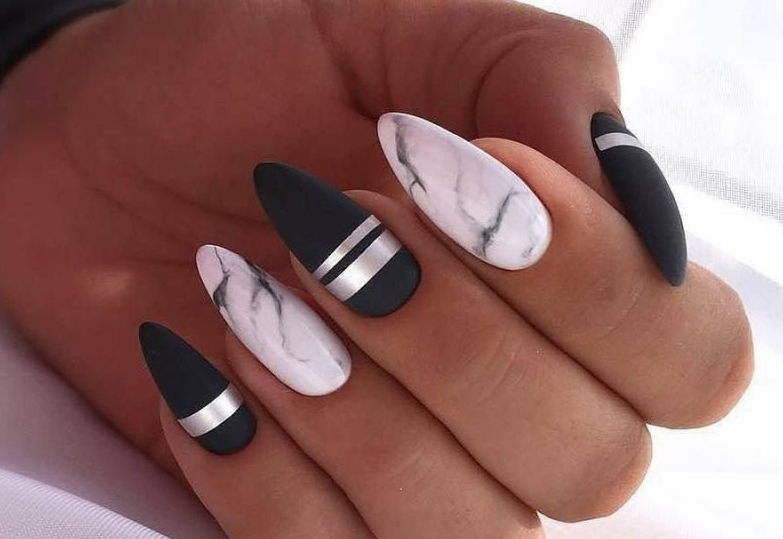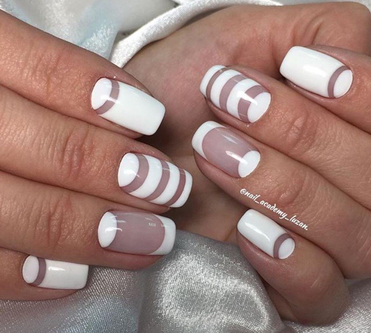 - Белый маникюр с черными полосками