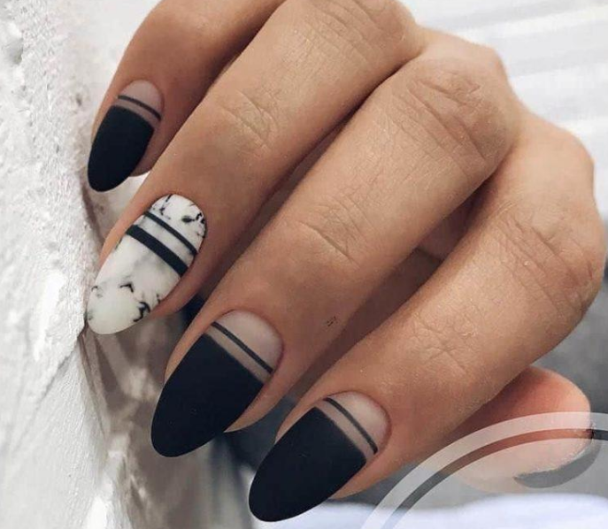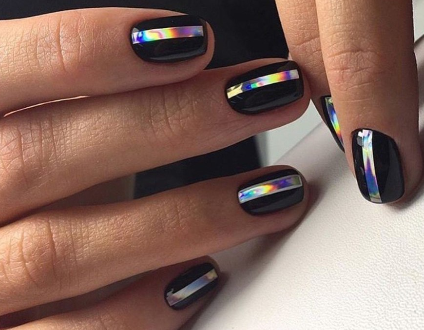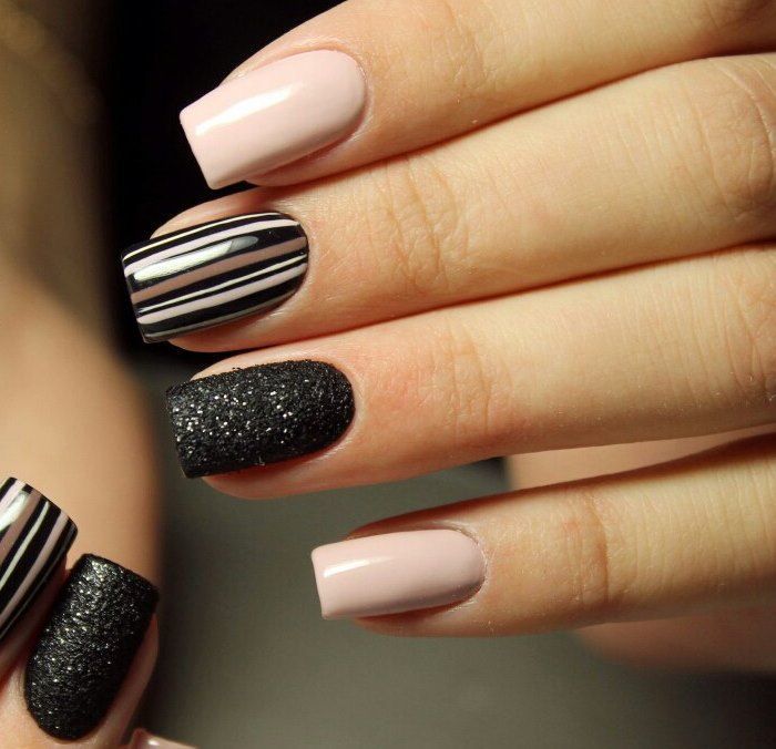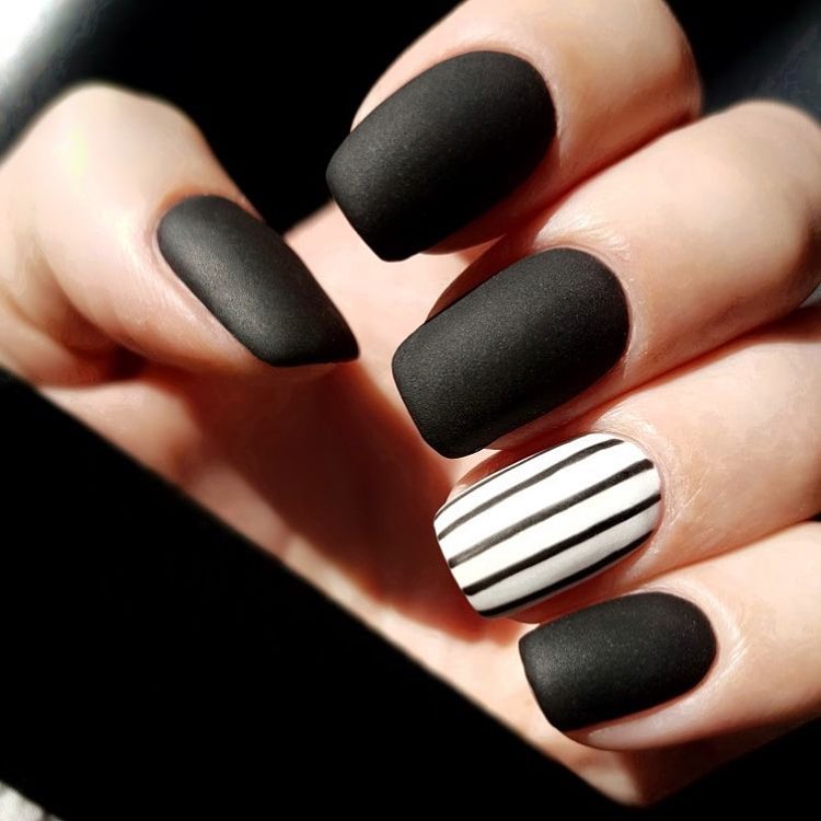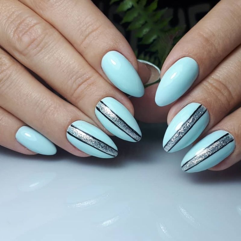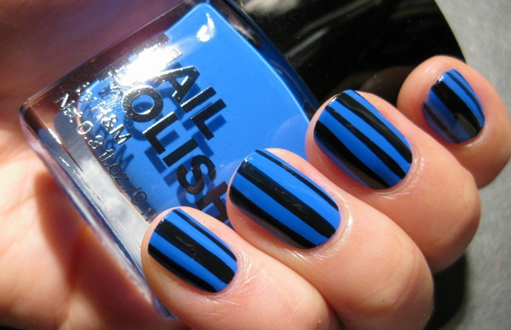 Еще один интересный и актуальный вариант полосатого маникюра. Вместо белой базы вы можете выбрать голубую. Палитра последней очень разнообразна — от холодного ледяного до электрик. И все они прекрасно сочетаются с черными акцентами.