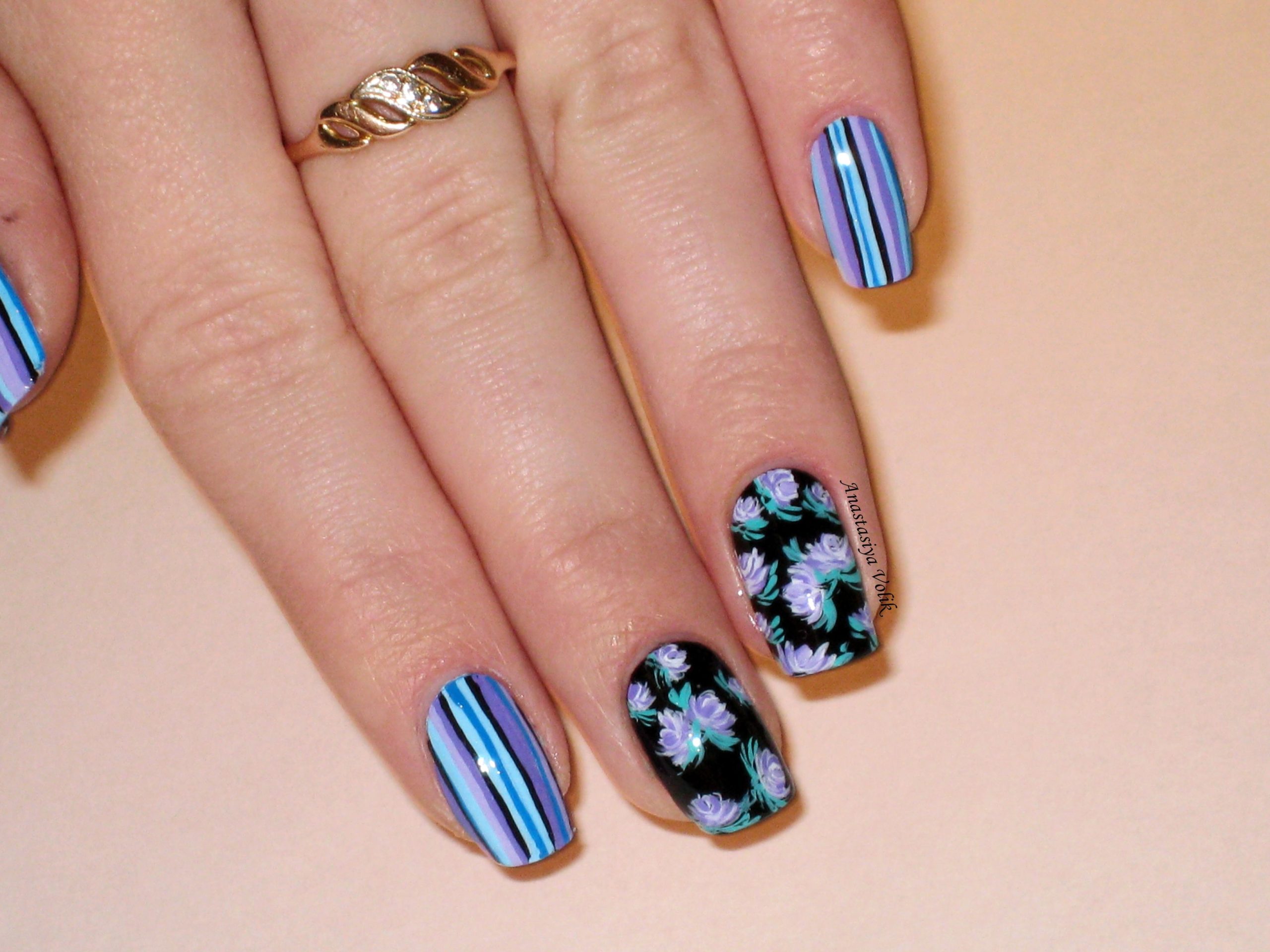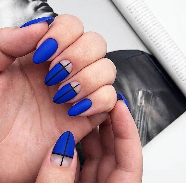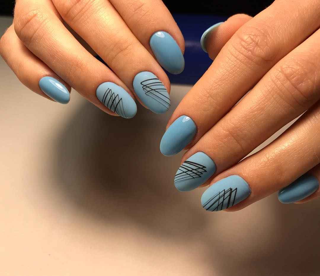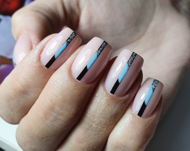 - Голубой и синий маникюр с черными полосками