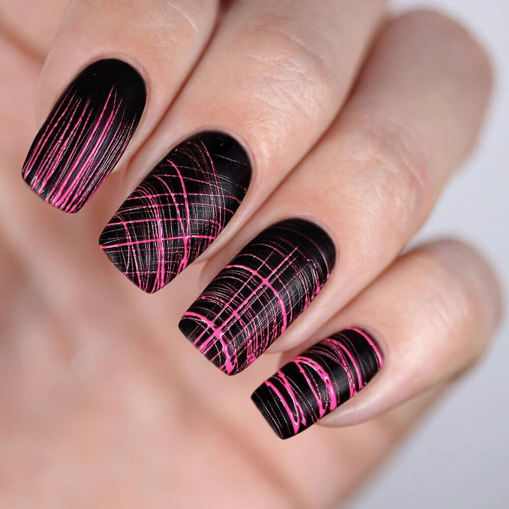 Как уже отмечалось, полоски могут быть не только строгими, но и волнистыми. И не обязательно четкими. В моде размытые волны, волнистая абстракция и самые причудливые переплетения линий. Представьте себе запутанный клубок нитей контрастных оттенков — вот креативная идея для рисунка в маникюре.