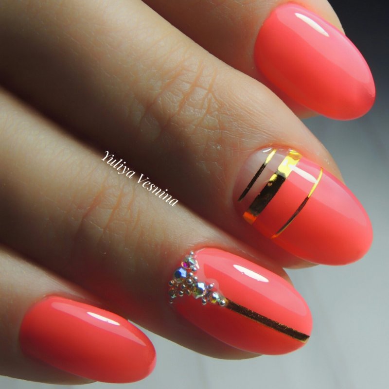 Неоновые лаки — это летний вариант нейл арта. Если не хотите покрывать пластину столь едким оттенком полностью, просто сделайте полосатые акценты. Для базы выбирайте спокойные тона — нюдовые, прозрачные или те же оттенки, но без неона в составе.