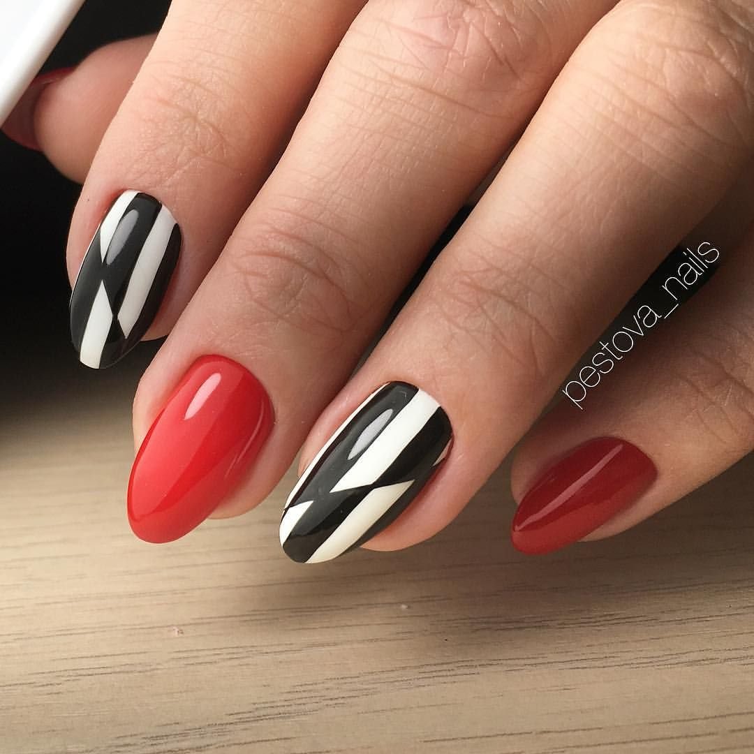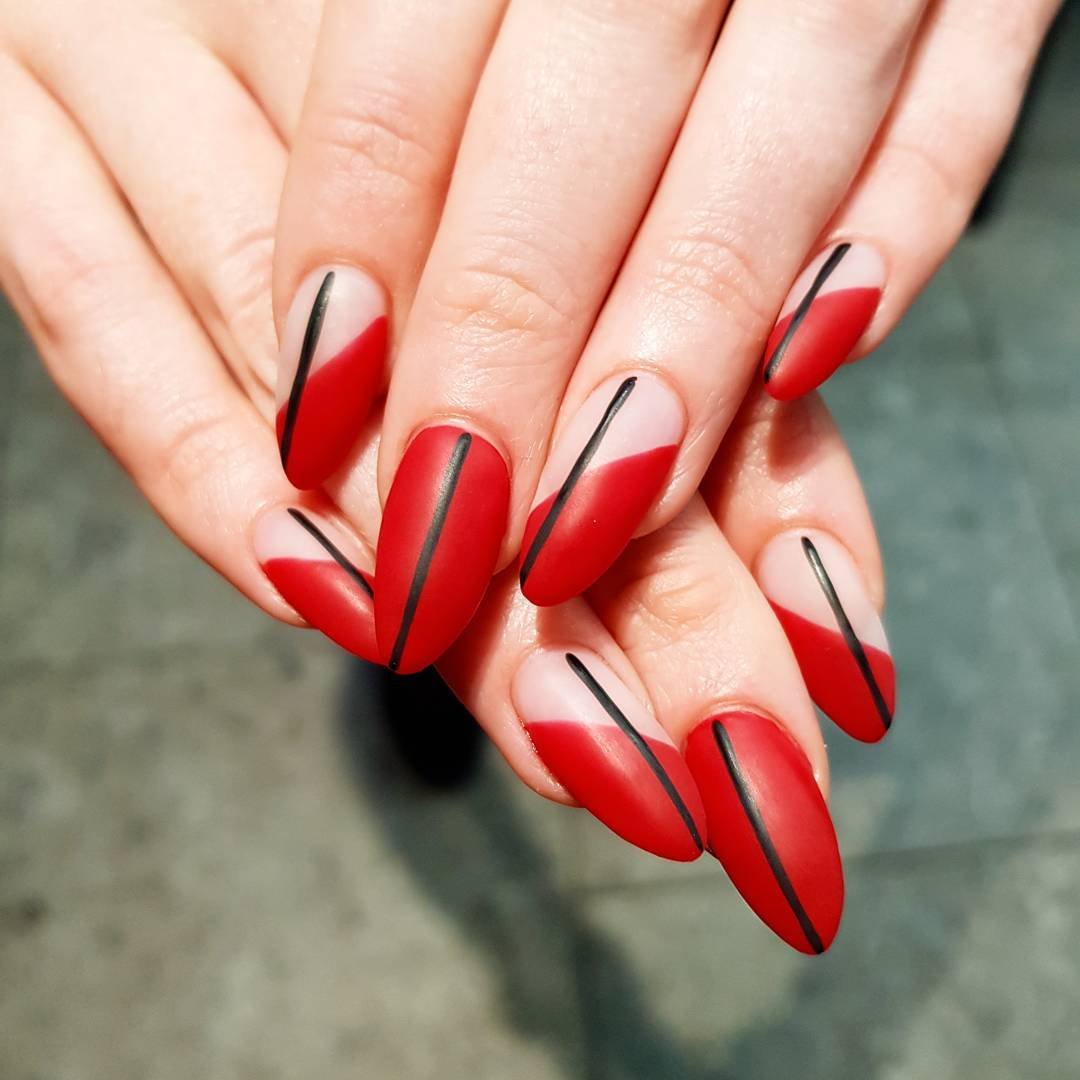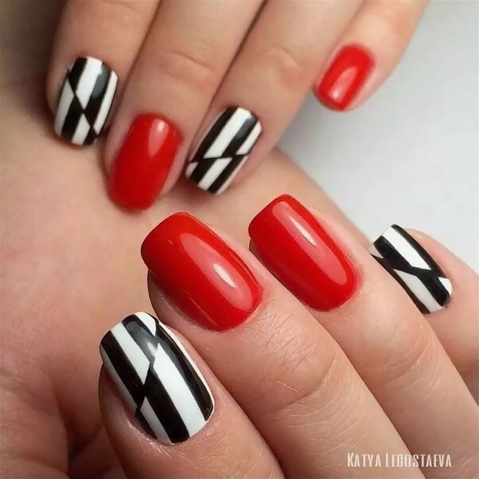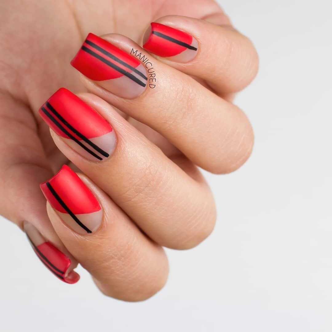 Сочетание красного с черным — классика. Выбирайте густую плотную базу (например, матовую) и добавляйте черные полоски — вертикальные, горизонтальные или волнистые.