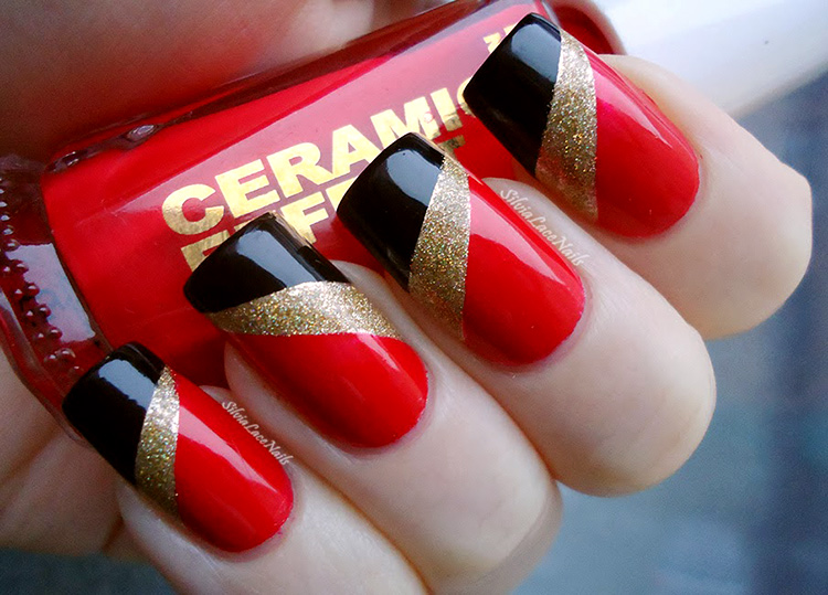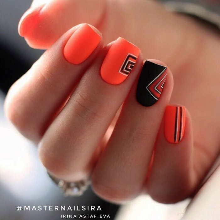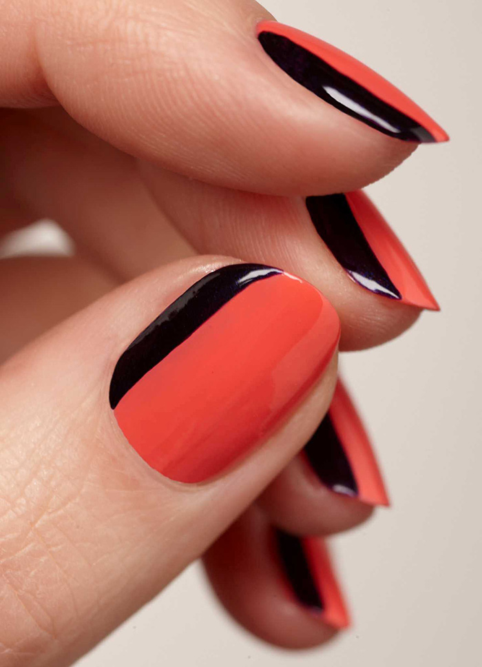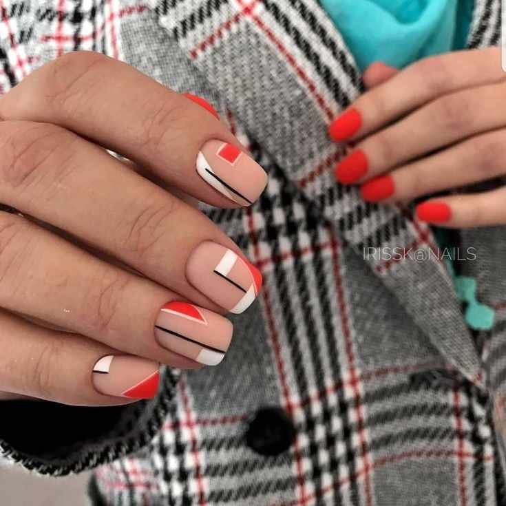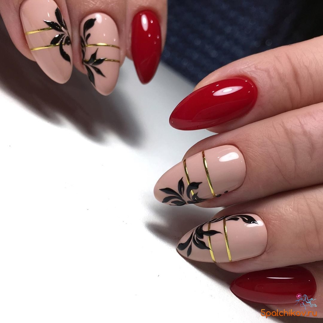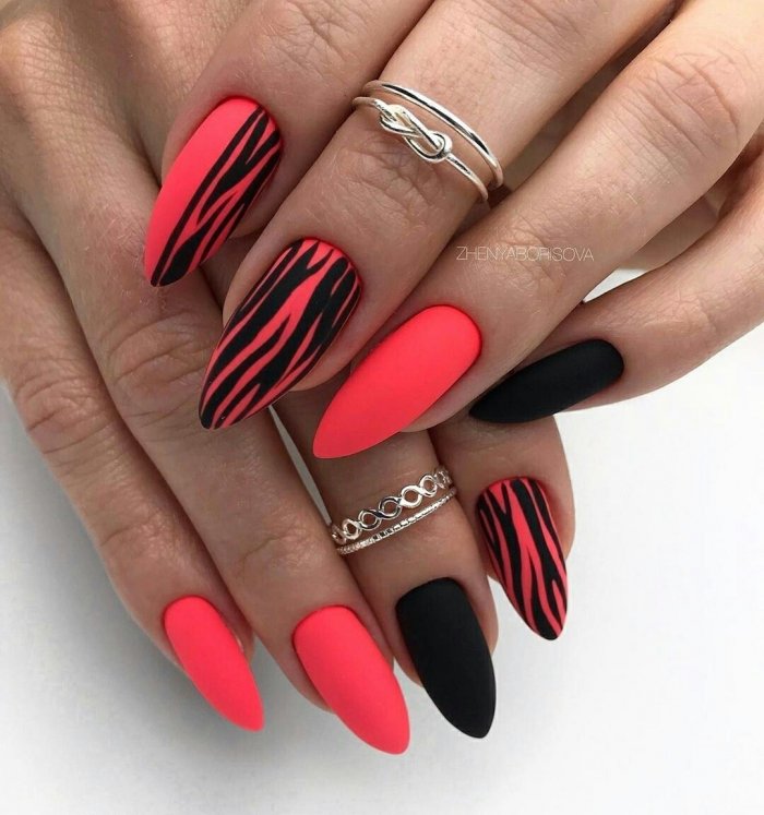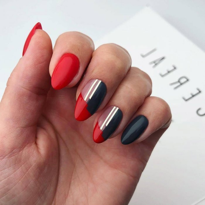 Сочетание красного с черным — классика. Выбирайте густую плотную базу (например, матовую) и добавляйте черные полоски — вертикальные, горизонтальные или волнистые.