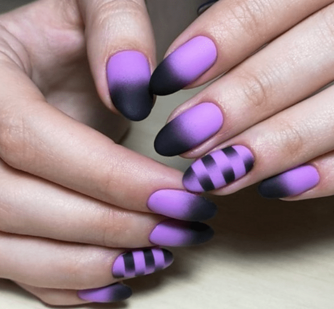 Омбре или градиент по сути своей полосатый дизайн. Просто границы цветов более размыты и четко не обозначены. Для так называемого полосатого омбре выбирайте максимально контрастные оттенки лака и старайтесь не слишком растушевывать границы переходов цвета.