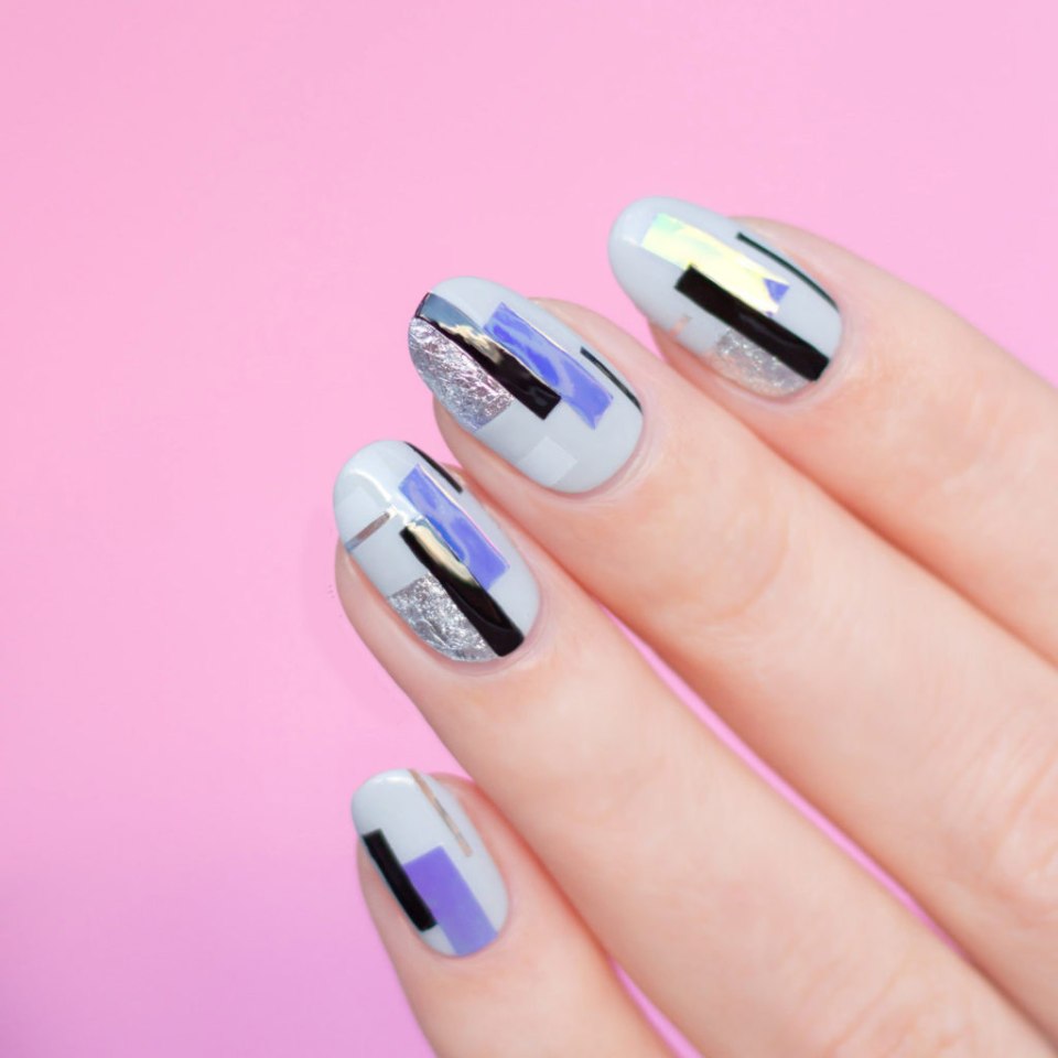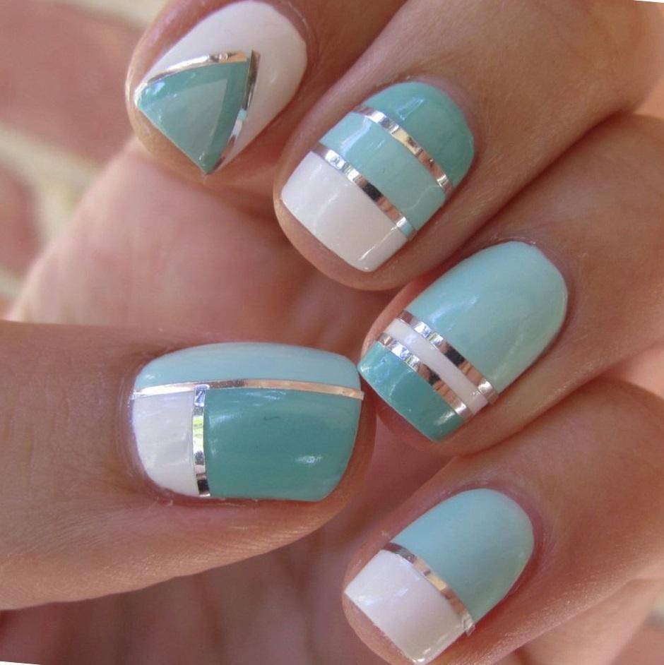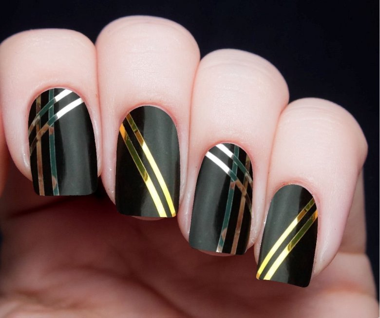 Вам хочется строгости и блеска одновременно? Выбирайте фольгированные полоски. Они имеют клеевую основу и наносить их очень просто. Вертикаль, горизонталь, ромбы — варианты любые. Фольгированные полоски бывают разных оттенков. Они отлично смотрятся на контрастной базе или, наоборот, на близкой по тону.