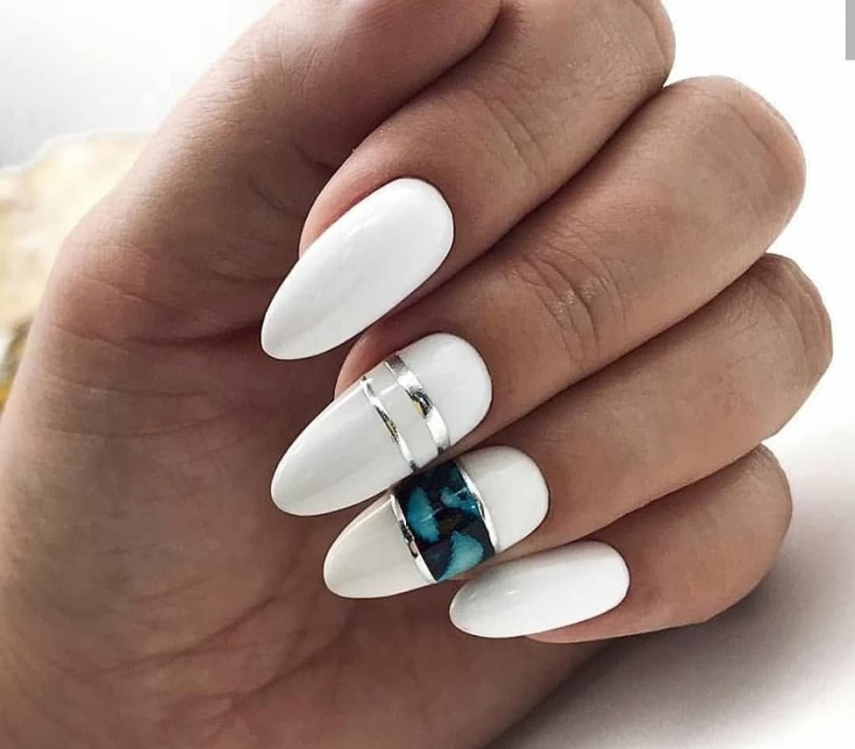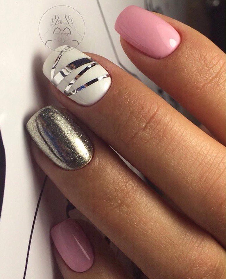 Серебро подходит для случаев, когда база окрашена лаком холодного оттенка. Вы можете сделать серебристый френч, стильную геометрию или фантазийные полосы — все будет модно.