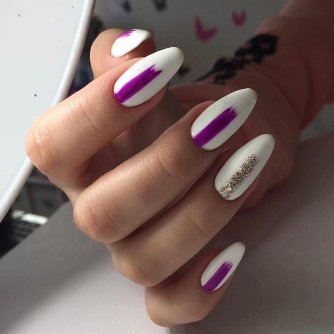 Если говорить о полосках, стоит упомянуть, что в маникюре вы можете использовать любую их форму Для овальных ногтей стоит использовать и волнистые линии. Просто проявите фантазию и рисуйте на ногтях любые дизайны. Для овала очень эффективно смотрится полоска разделитель — вертикальная и тонкая. Кончик ноготка можно увенчать бульонкой или одиночной стразинкой. Разместить ее рекомендуется на кончике полоски.