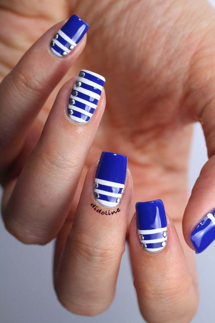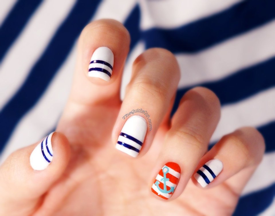 Горизонтальные линии — классика. С их помощью можно создать морской маникюр, сделать дизайн строгим и четким. Но, как и одежной моде, не стоит выбирать поперечные полоски в том случае, если длина ноготка короткая. Так они будут выглядеть более широкими, а руки потеряют долю изящества.