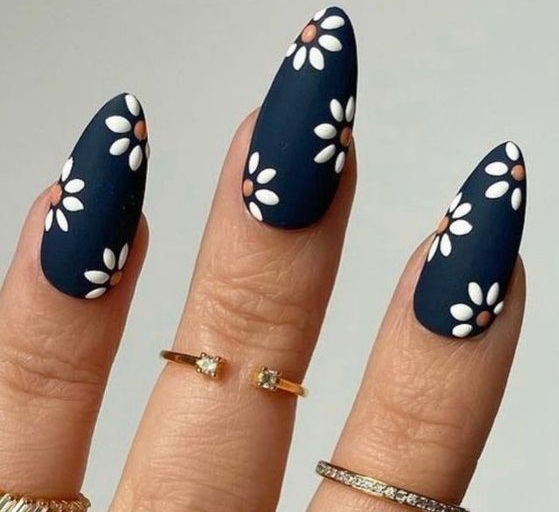 Большая длина — всегда удачное решение, если вы планируете сделать цветочный маникюр. Вы можете выбрать абсолютно любой вариант дизайна — от большого цветка на акцентом ногте, до ромашкового поля на всех. Выбирайте любой и проявлять фантазию — у вас все получится.