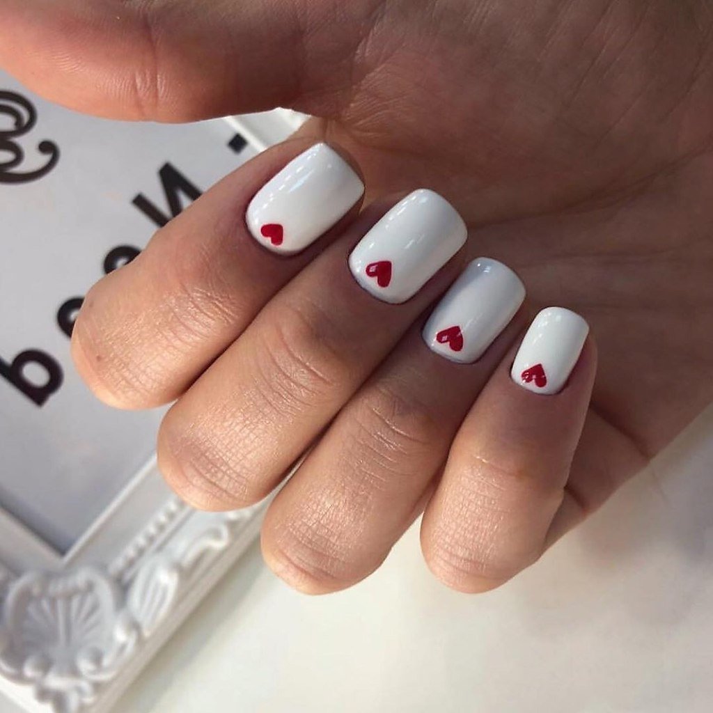 Совет: минималистичный дизайн не означает, что на ногтях нужно нарисовать одно или два сердечка. Вы можете выбрать один ноготок и покрыть его сплошным ковром из простых сердечек. Остальные ноготки оставьте в одноцветном исполнении.