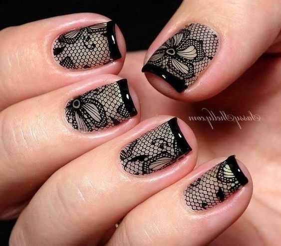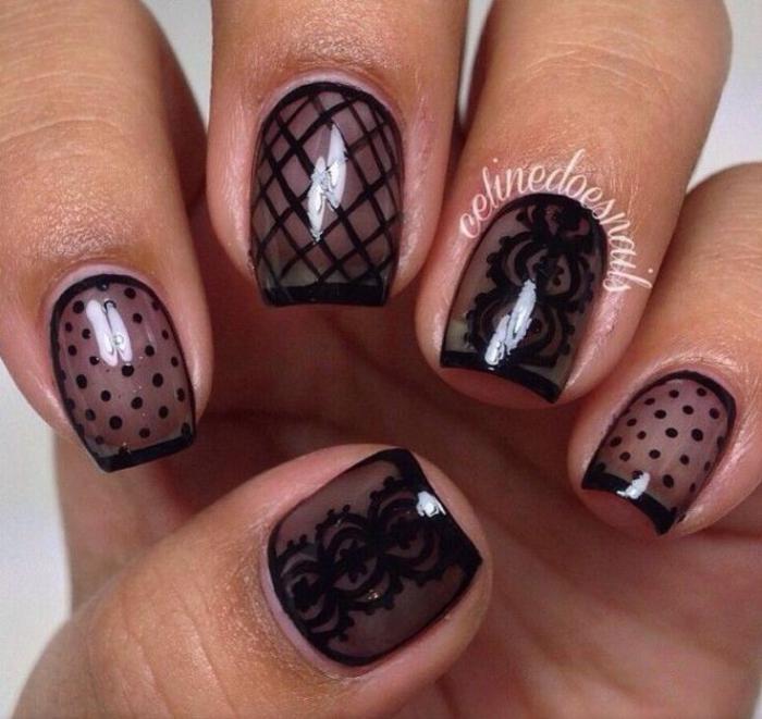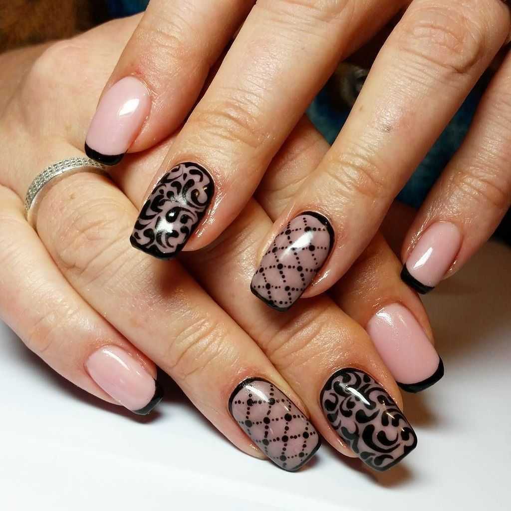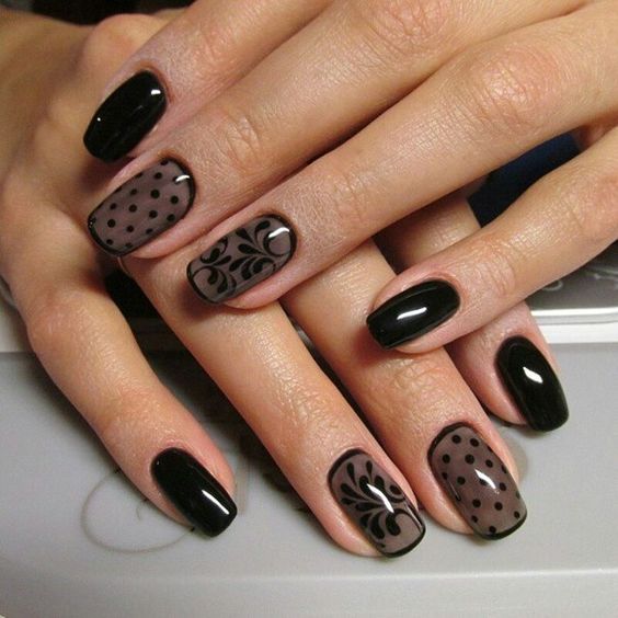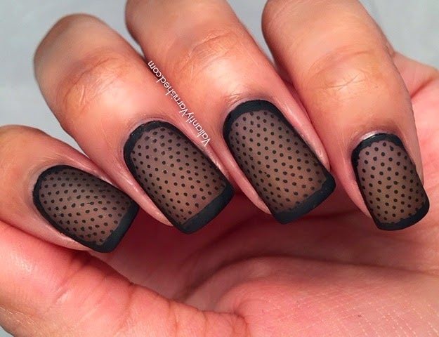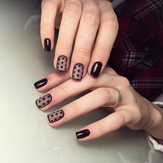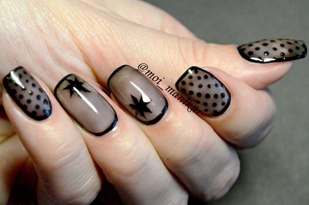 Еще один стильный и очень женственный вариант маникюра с точками. Для создания эффекта вуали используют полупрозрачную основу (серную или белую) и аккуратные точки-горошинки, расположенные в геометрическом порядке, словно это не лаковое покрытие ногтя, а ткань. Рисунок можно дополнить каемкой по форме ноготка или добавить нежный рисунок. В зависимости от выбранной палитры такой дизайн можно вписать в вечерний образ или дополнить романтичный дневной.