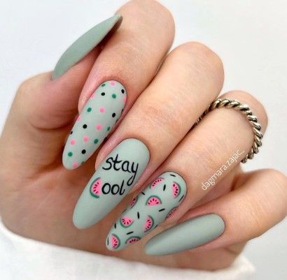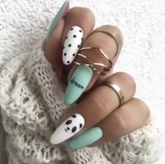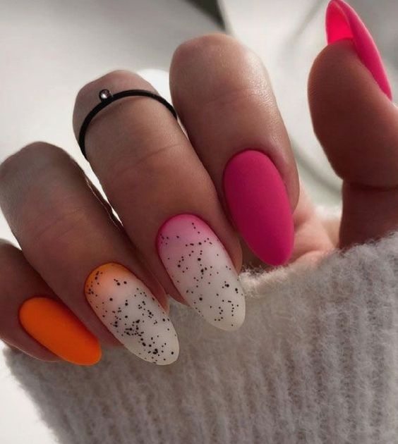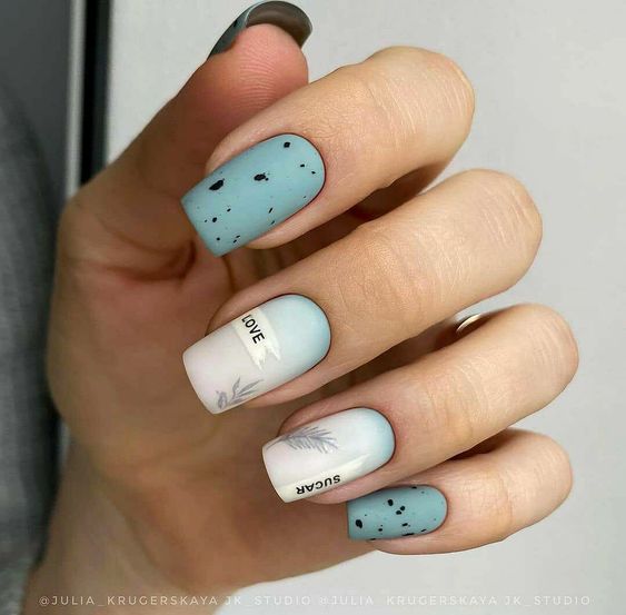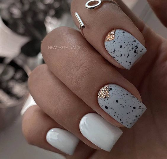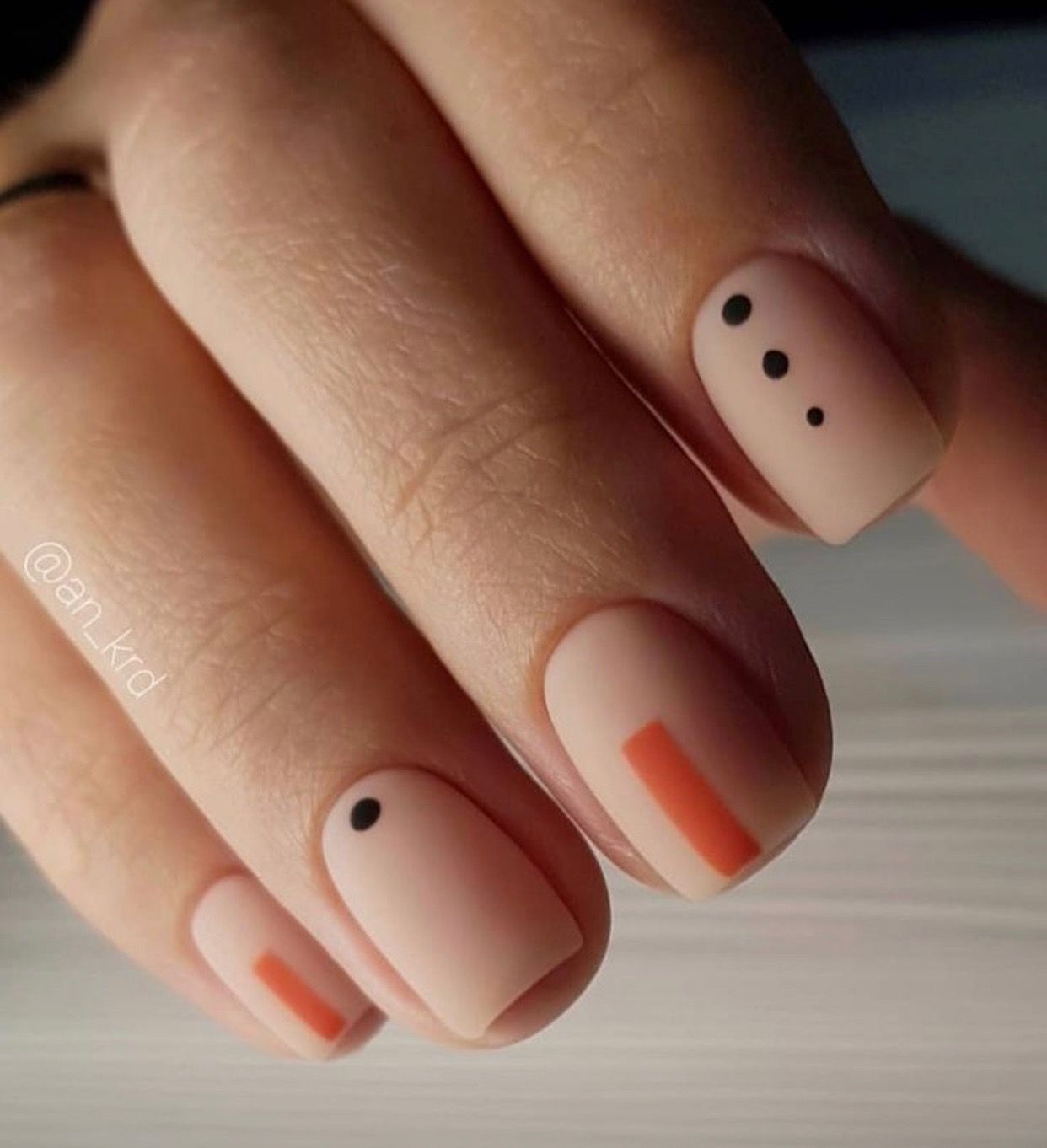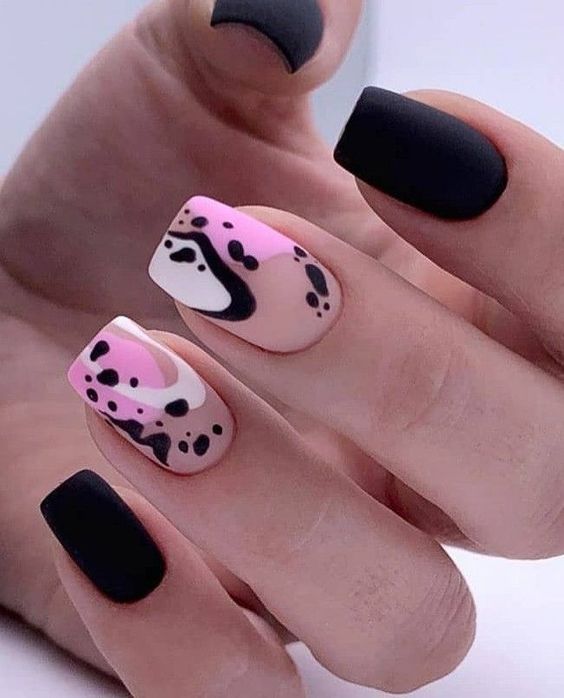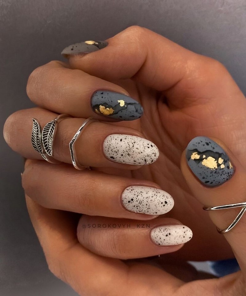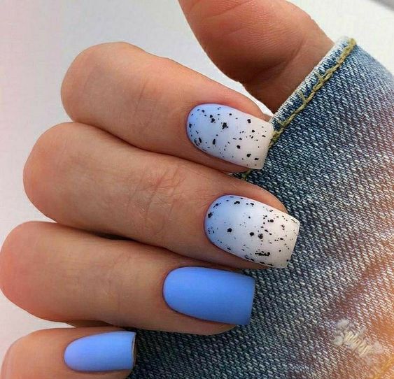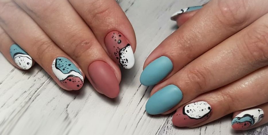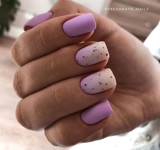 Отдельно стоит сказать и о точечном дизайне, который совмещают с матовой текстурой ногтей. На ней точки смотрятся строго и стильно. Мы рекомендуем выбирать контрастные оттенки при создании точечного дизайна с матовой основой.