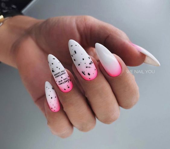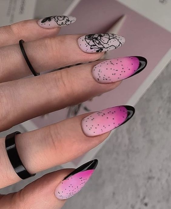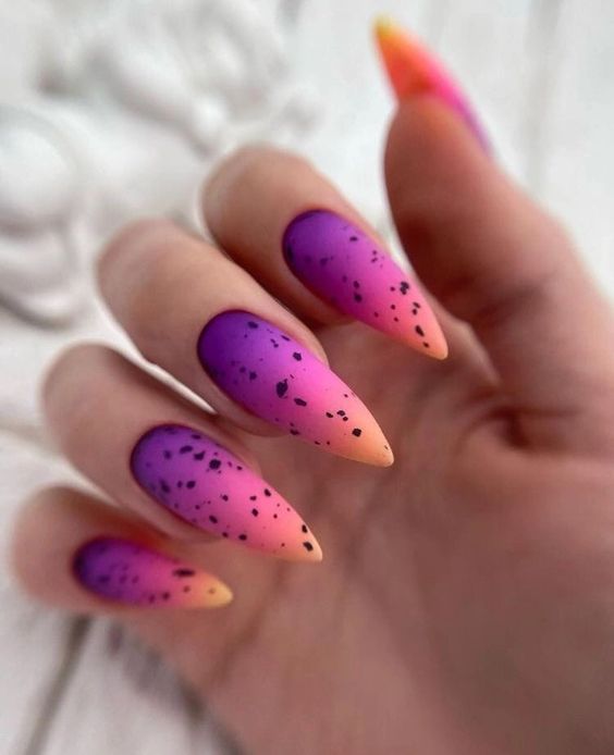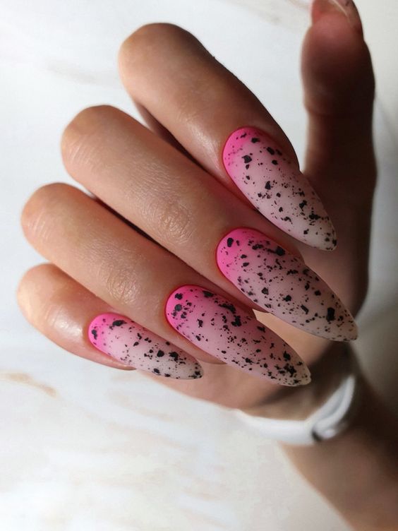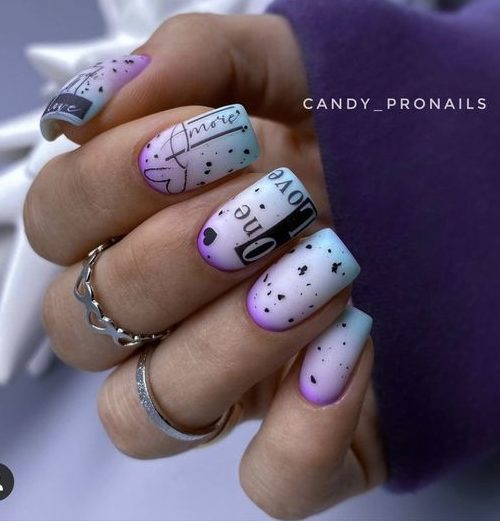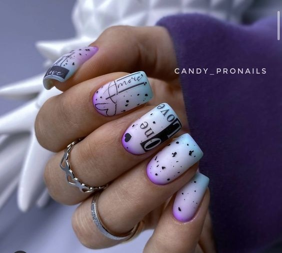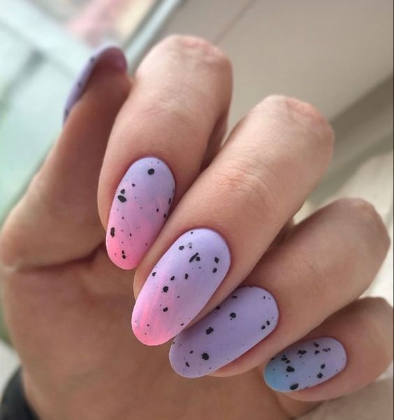 До сих пор мы говорили о точечном маникюре, который использует однотонную основу. А почему бы не совместить его с градиентом или омбре? Получится необычный и интересный дизайн. Обратите внимание — чтобы точки и рисунок из них четко просматривался и не терялся на фоне плавных цветовых переходов, стоит выбрать контрастные оттенки лаков.