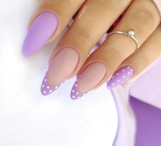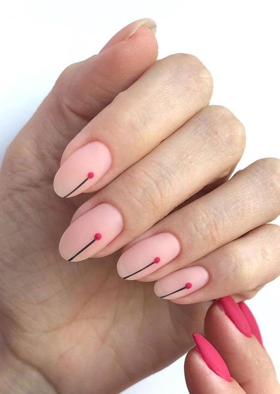 Интересно, что чаще всего на первом месте в подборках дизайнов стоит френч. Это действительно универсальный и вневременной дизайн ногтей. Но в данном случае мастера выдвигают на первое место лунный маникюр. Именно он лучше всего сочетается с точками. Вариаций исполнения лунного paintpoint немало. Например, вы можете выбрать базу в любимом цвете с матовым топом. Подобную текстуру можно сочетать с негатив спейс в области лунки и дополнить дизайн вертикальной линией их точек — посередине пластины. Кстати, точки могут быть разного размера.