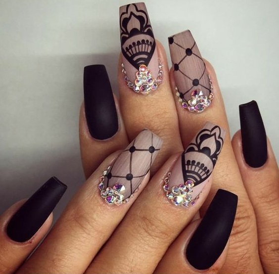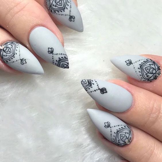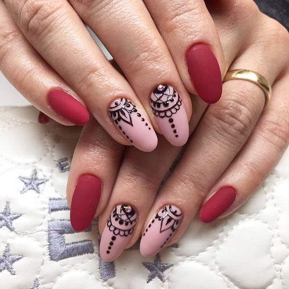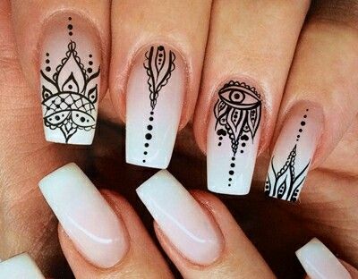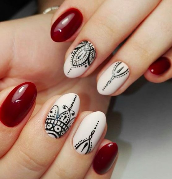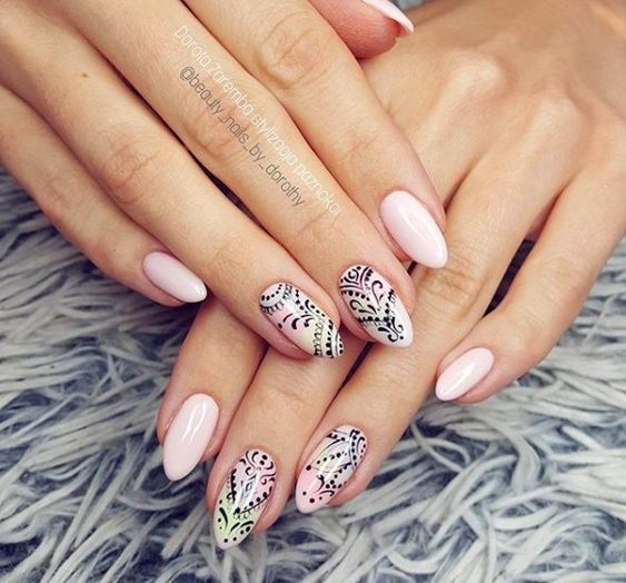 Вам знакома роспись кожи хной — мехенди? Предлагаем сделать маникюр в таком стиле. Чаще всего мастер мехенди использует не только точки, но еще и плавные линии. Но вы вполне можете обойтись без них. Маникюр в восточном стиле может быть однотонным или ярким разноцветным. Выбирайте трафарет с рисунком или придумывайте мотивы сами. Разноцветный дизайн отлично подойдет к летнему однотонному платью. И, наоборот, однотонный отлично впишется в образ с ярким цветным нарядом.