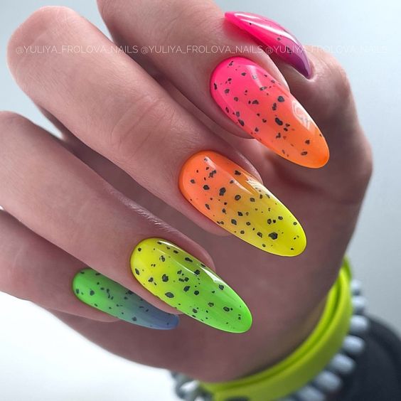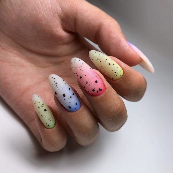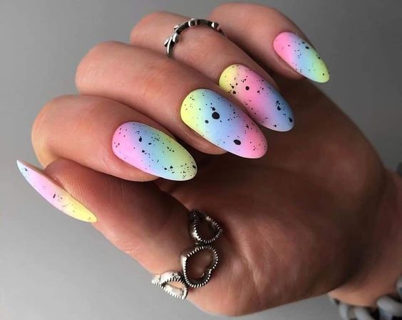 Что касается оттенков лака в точечном маникюре, здесь все зависит исключительно от вашей фантазии. Никаких ограничений просто нет. Используйте минималистичную палитру, если вам необходимо создать маникюр, который подходит к деловому или офисному образу и не отказывайте себе в удовольствии добавить массу красок, если хотите дополнить яркий летний образ.