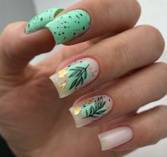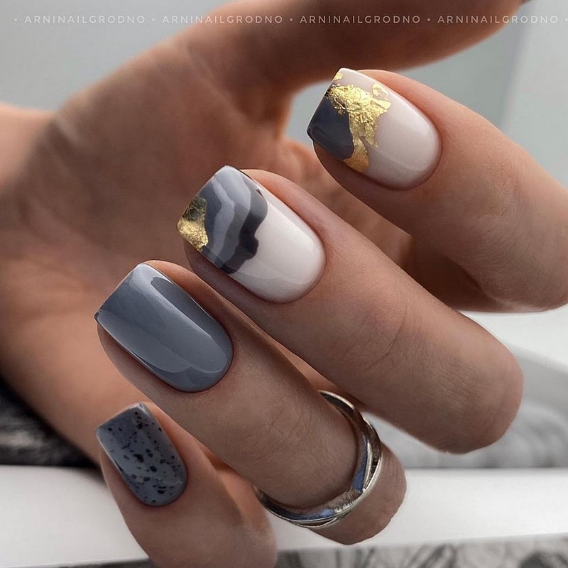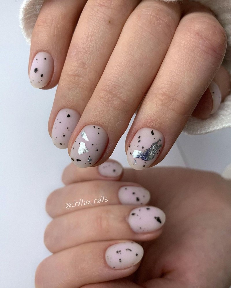 Добавить немного сдержанного блеска в маникюр с точками можно с помощью фольги. Чаще всего ее используют как дополнительный фон, особенно, если база нейтральная. Но мы рекомендуем отойти от строгих форм — пусть кусочки фольги располагаются на пластине хаотично и будут максимально «рваными». Сделать их таковыми можно с помощью обычной апельсиновой палочки. Она не повредит пластину и аккуратно позволит разделить тонкий декоративный материал.