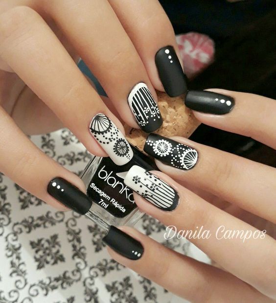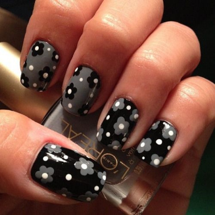- добавить контрастности. Теперь снова берем черный лак и дотс меньшего диаметра и наносим точки по получившимся цветкам;