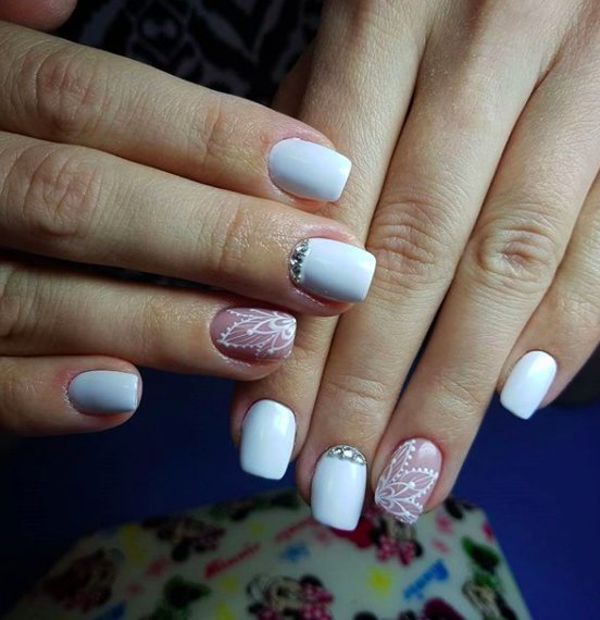 Совет: если вы любите все необычное, выбирайте маникюр с точками в стилистике нежного узора для свадебного маникюра. Он подходит к любому платью, но особенно стильно будет смотреться с нарядом в стиле бохо.