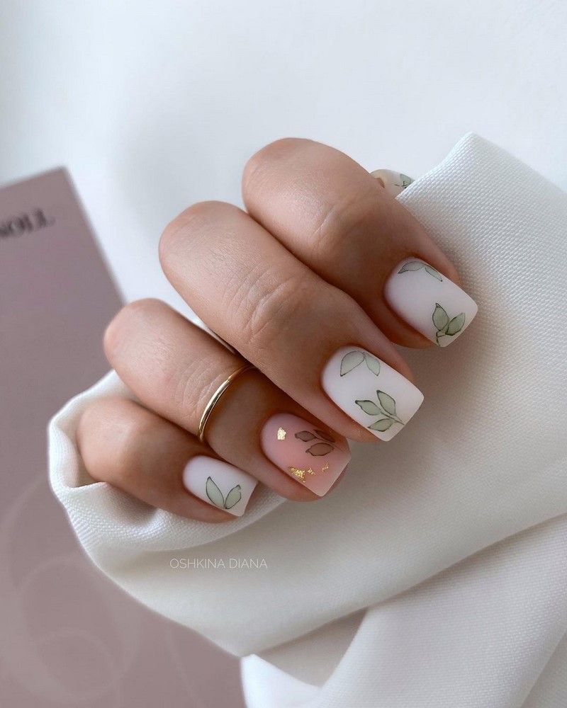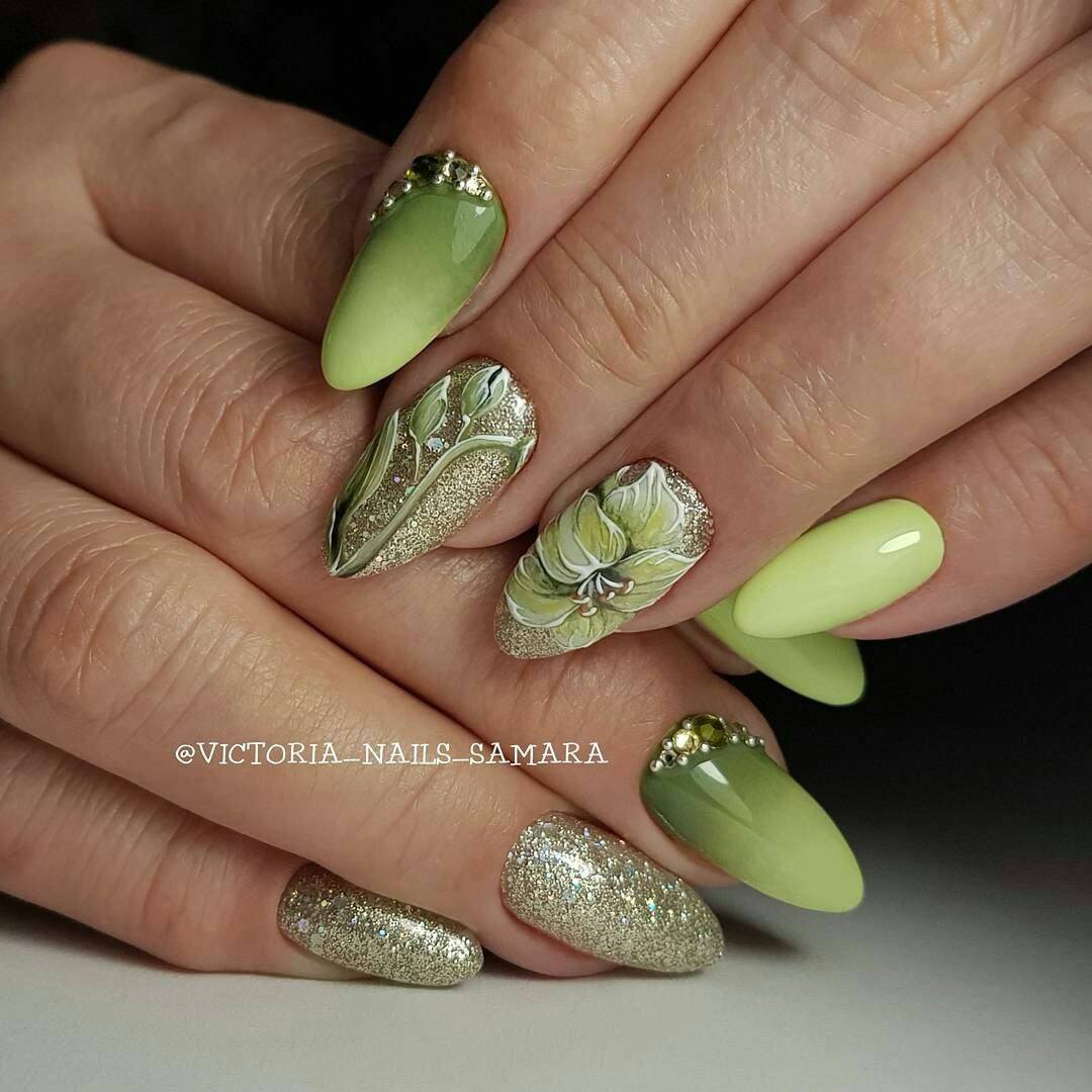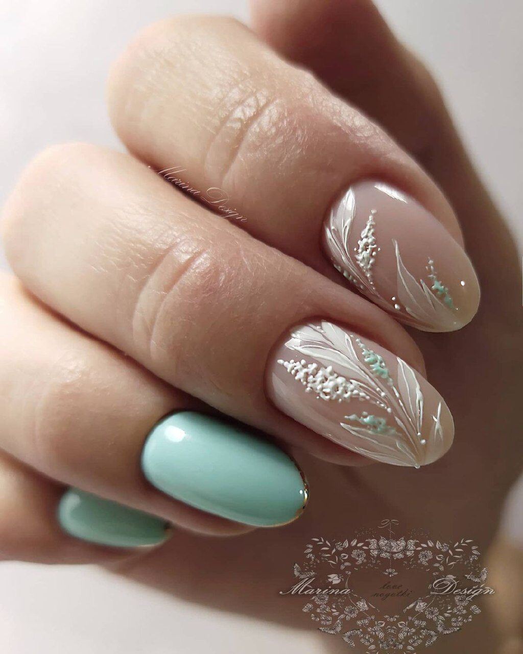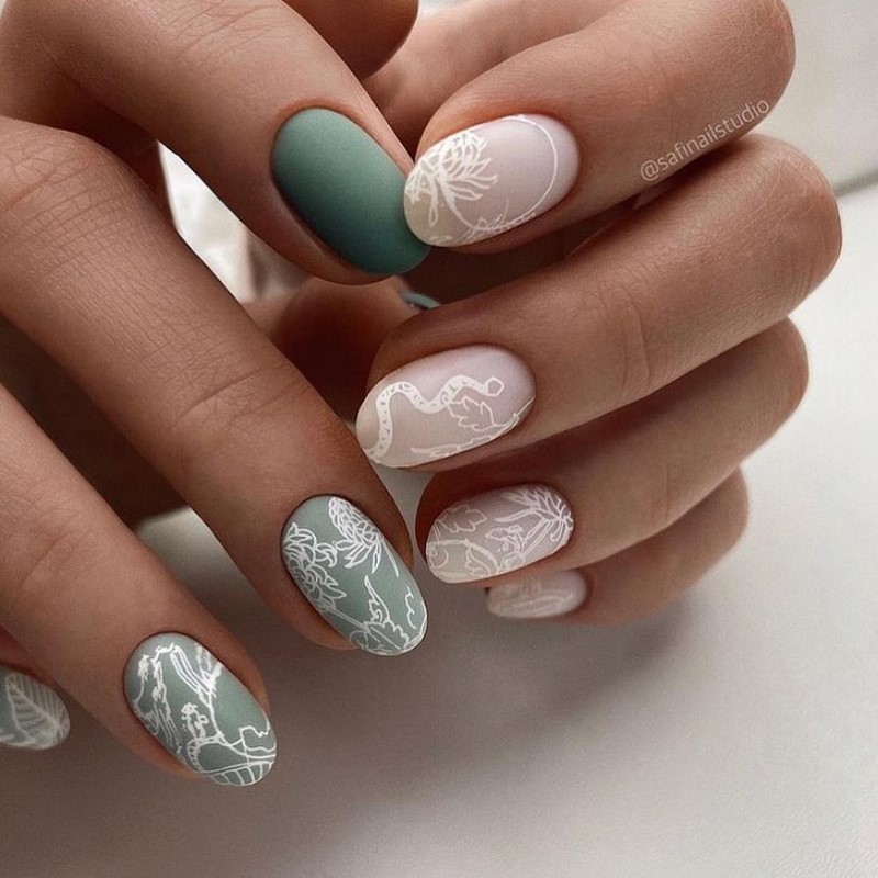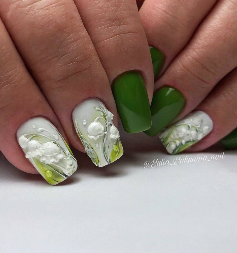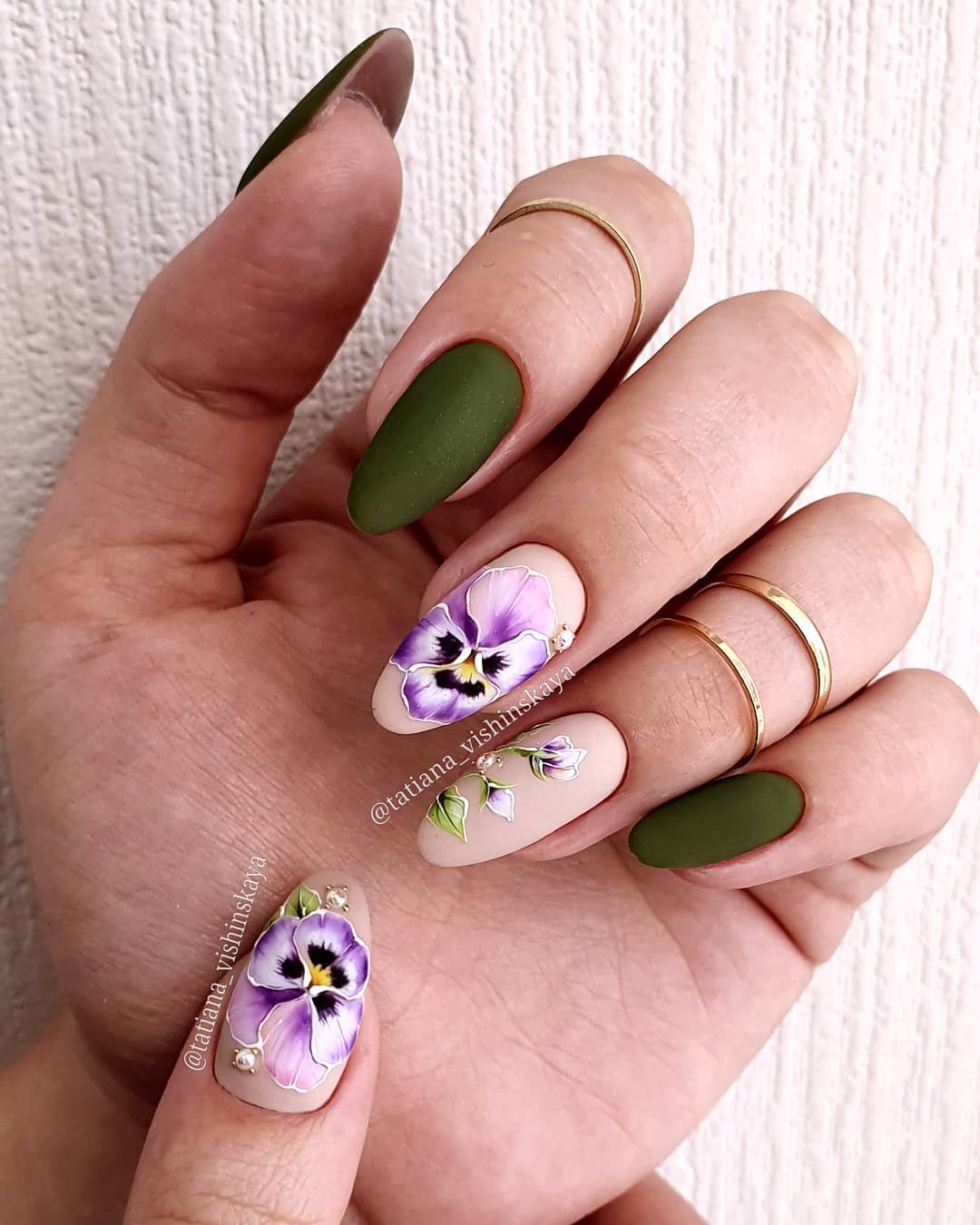 Разве можно обойтись без зеленого в цветочном маникюре? Конечно же, нет.НО зеленый можно использовать не только для декора, но и для базы. Отлично смотрится нежная зелень или техника омбре — от белого к нежному мятному. Обратите внимание на тенденцию сезона к естественности. Для базы можно выбрать оттенок хаки или оливковый. Они очень эффектно смотрятся в матовом исполнении. Для рисунка можно выбрать веточки и цветы оливы, листья клевера или нежные розовые цветы.