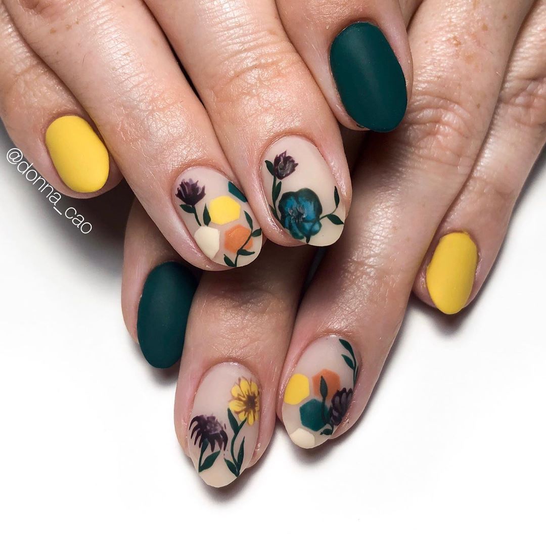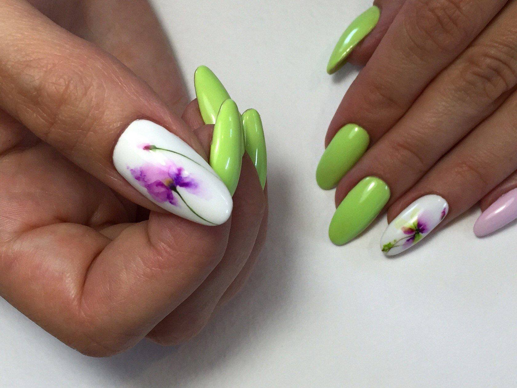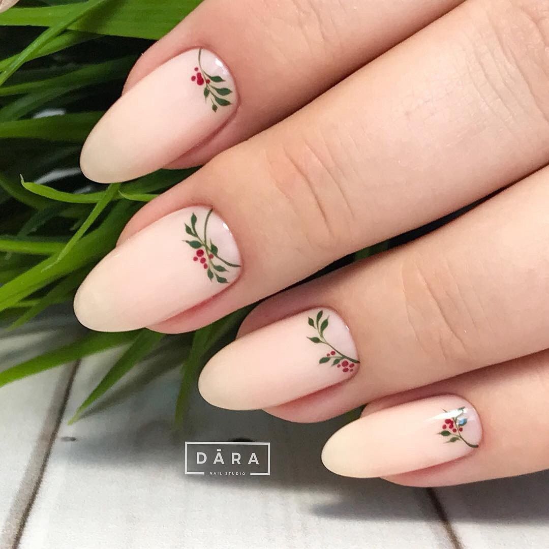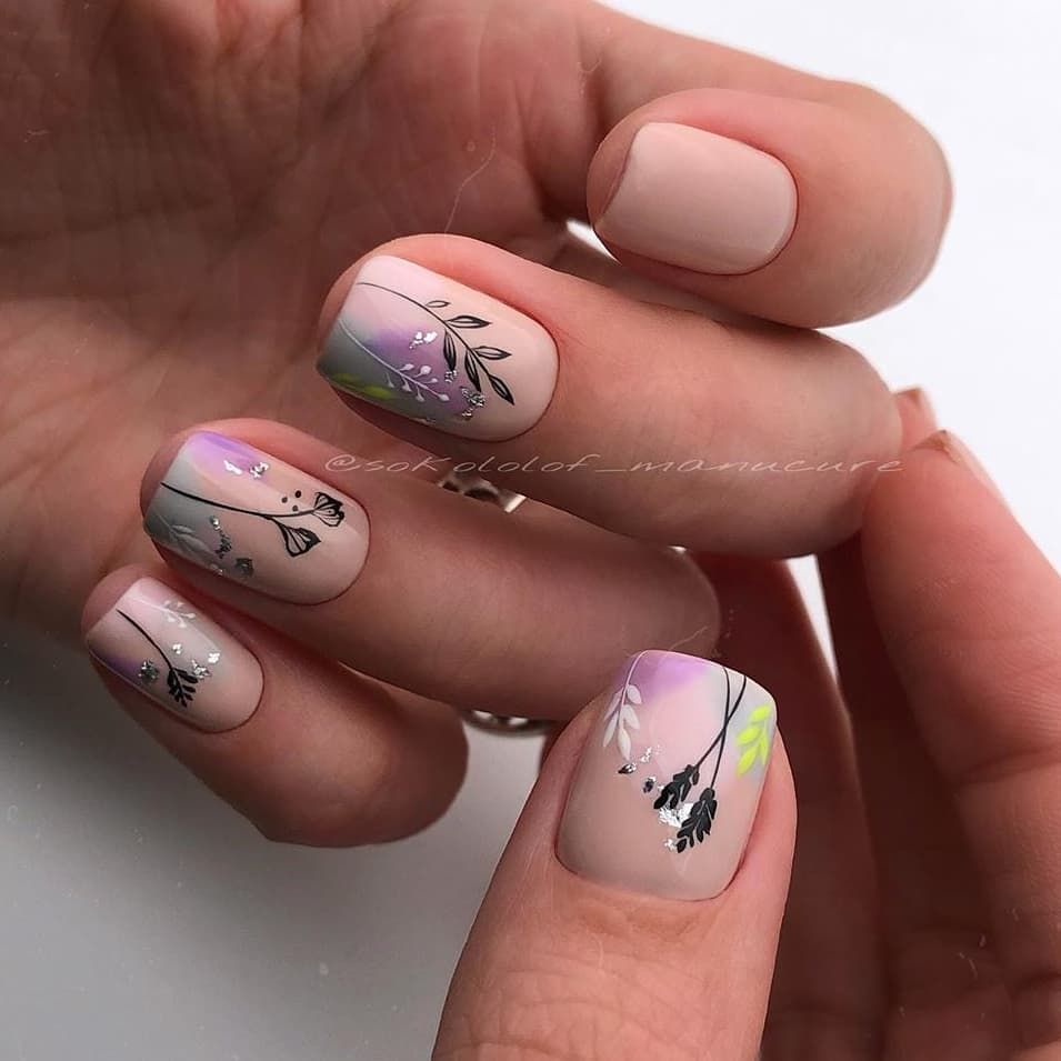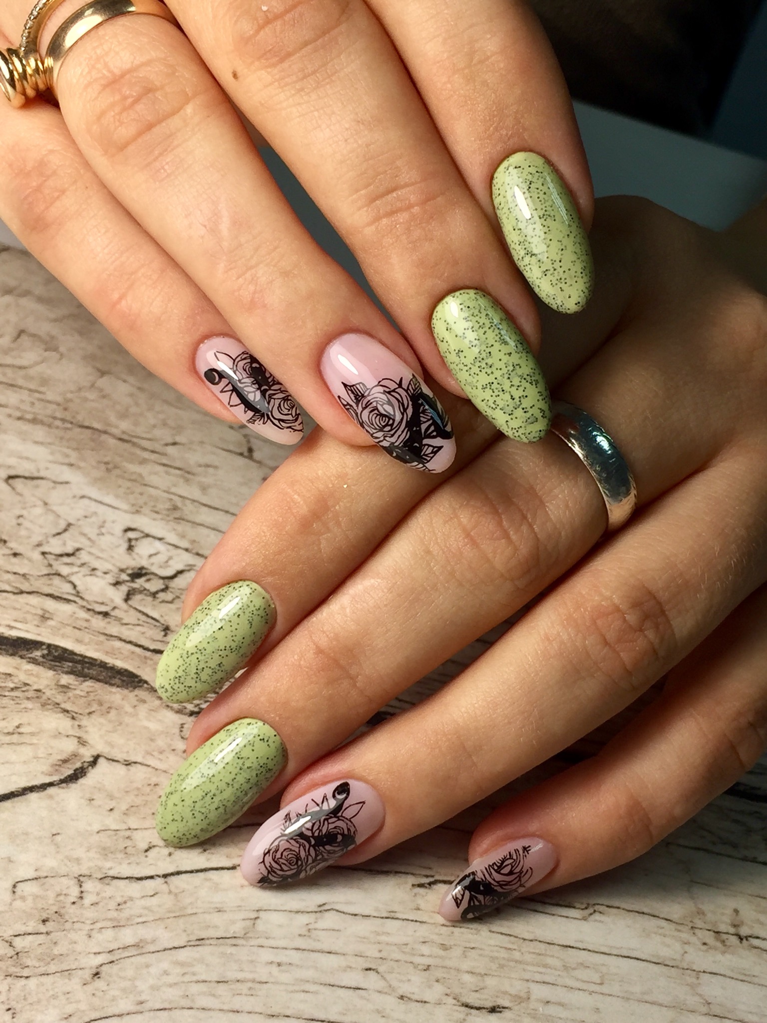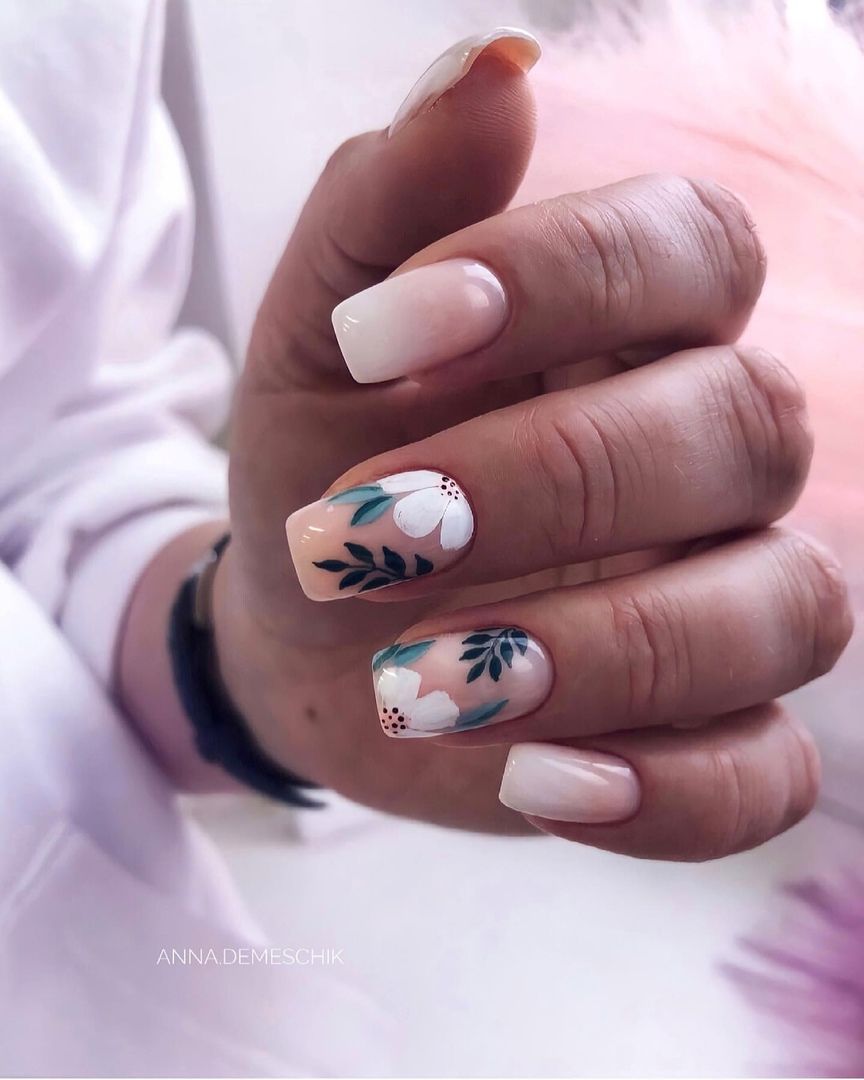 Разве можно обойтись без зеленого в цветочном маникюре? Конечно же, нет.НО зеленый можно использовать не только для декора, но и для базы. Отлично смотрится нежная зелень или техника омбре — от белого к нежному мятному. Обратите внимание на тенденцию сезона к естественности. Для базы можно выбрать оттенок хаки или оливковый. Они очень эффектно смотрятся в матовом исполнении. Для рисунка можно выбрать веточки и цветы оливы, листья клевера или нежные розовые цветы.