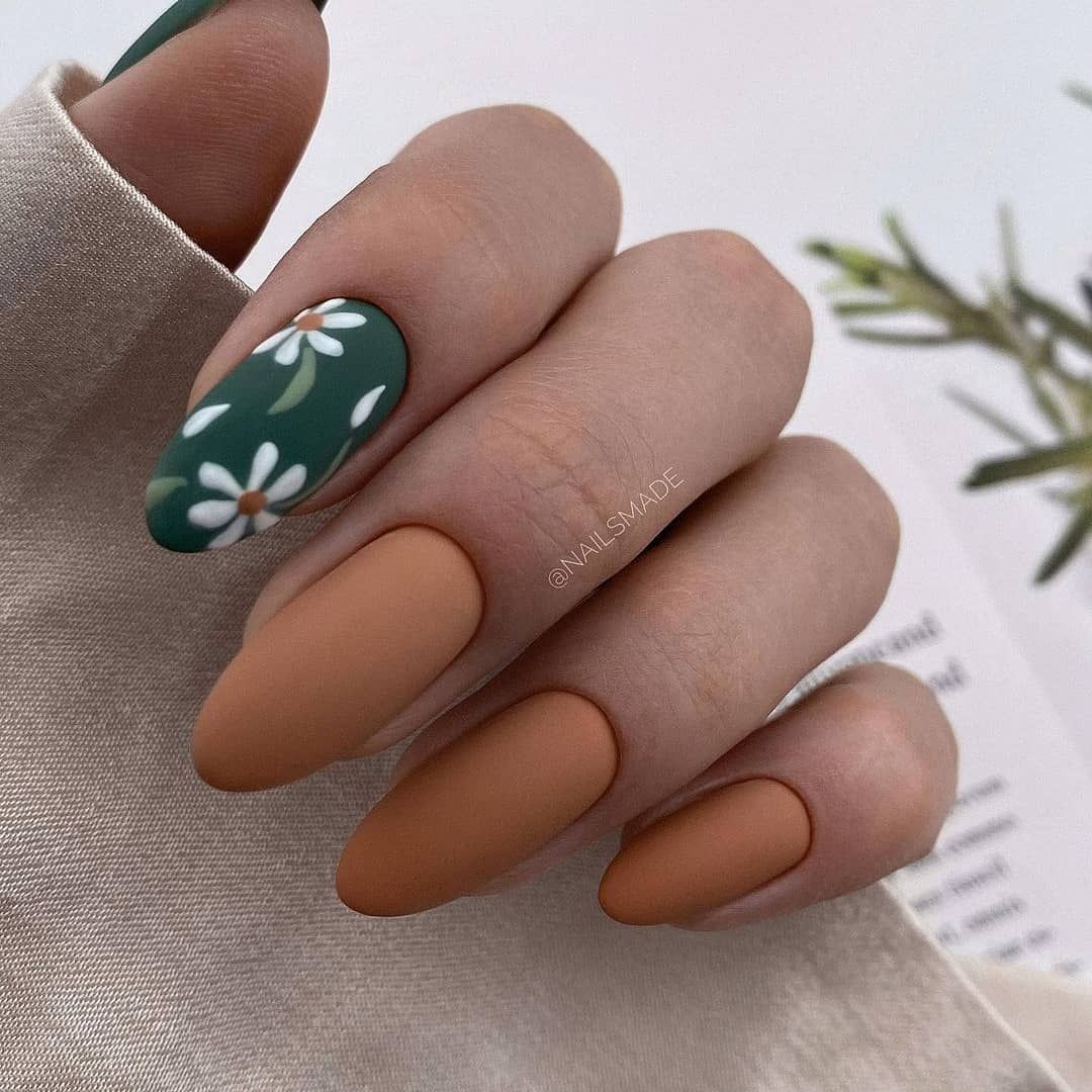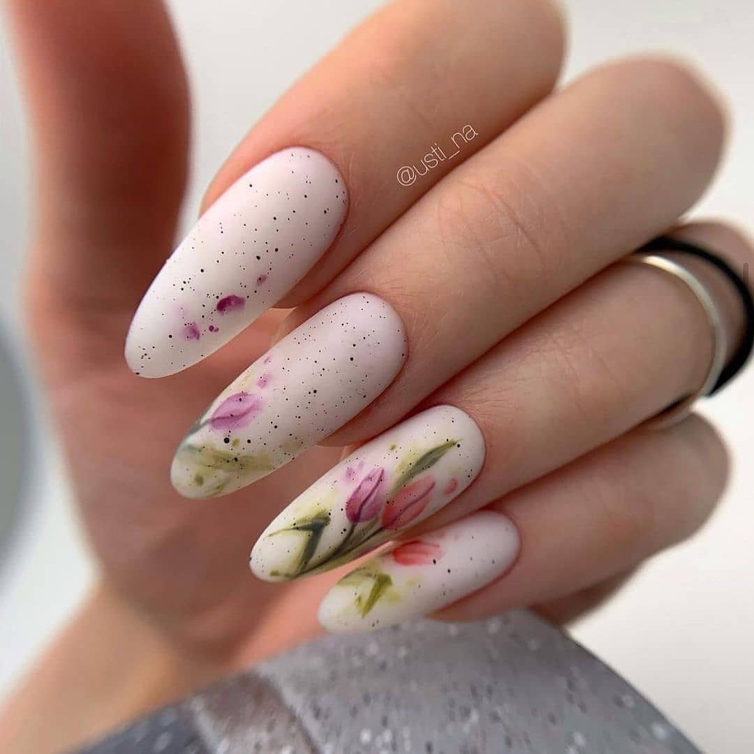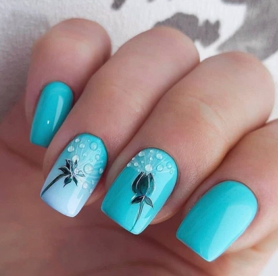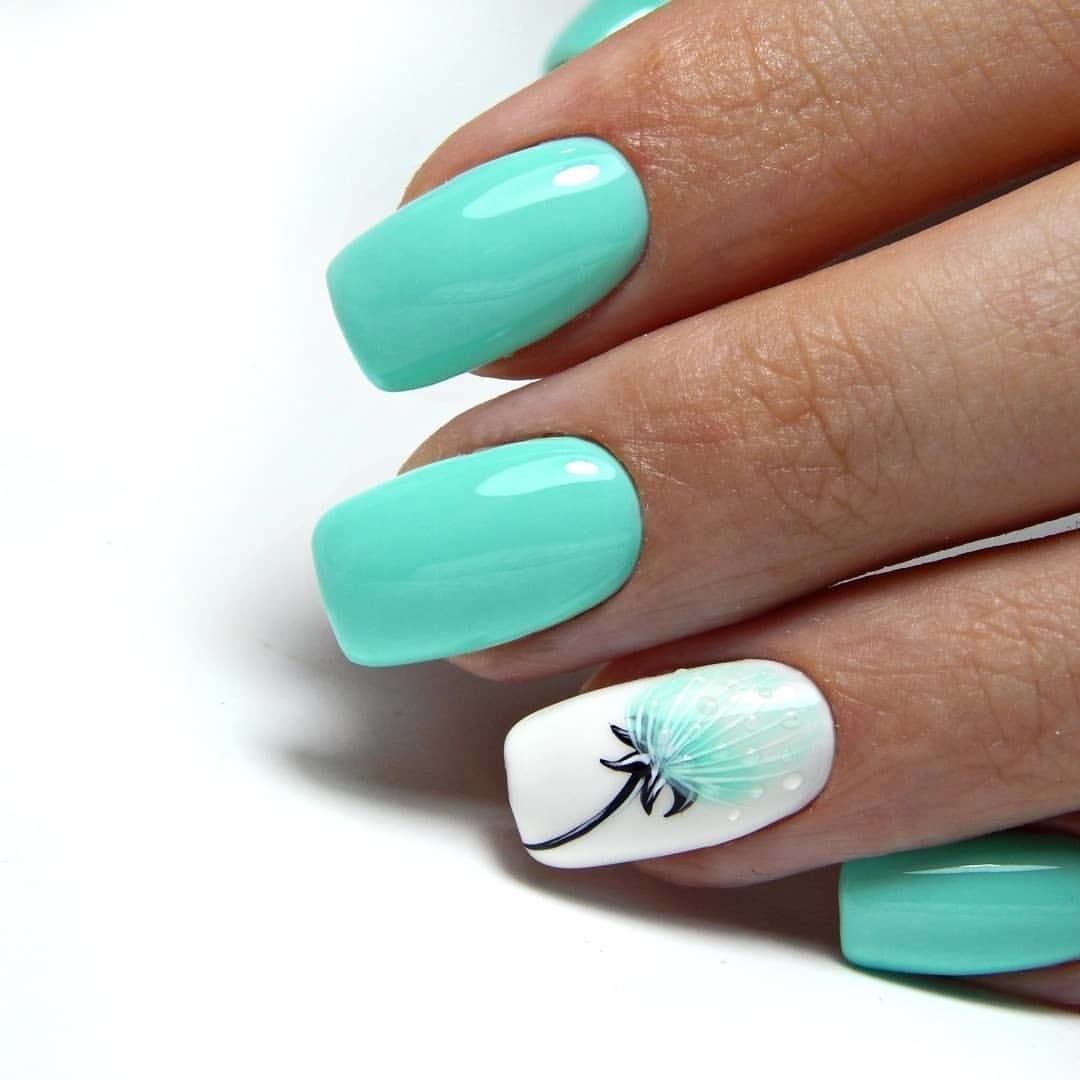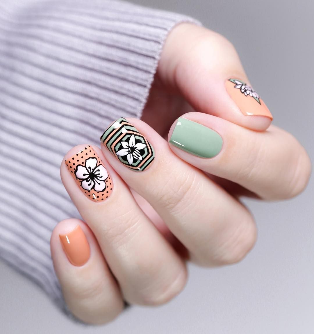 Разве можно обойтись без зеленого в цветочном маникюре? Конечно же, нет.НО зеленый можно использовать не только для декора, но и для базы. Отлично смотрится нежная зелень или техника омбре — от белого к нежному мятному. Обратите внимание на тенденцию сезона к естественности. Для базы можно выбрать оттенок хаки или оливковый. Они очень эффектно смотрятся в матовом исполнении. Для рисунка можно выбрать веточки и цветы оливы, листья клевера или нежные розовые цветы.