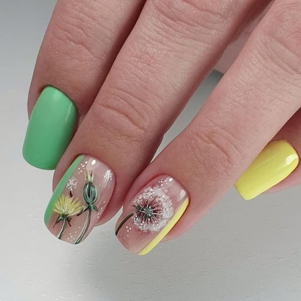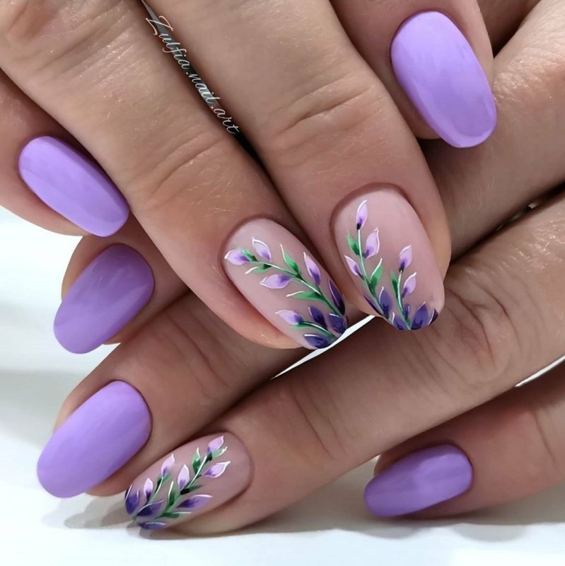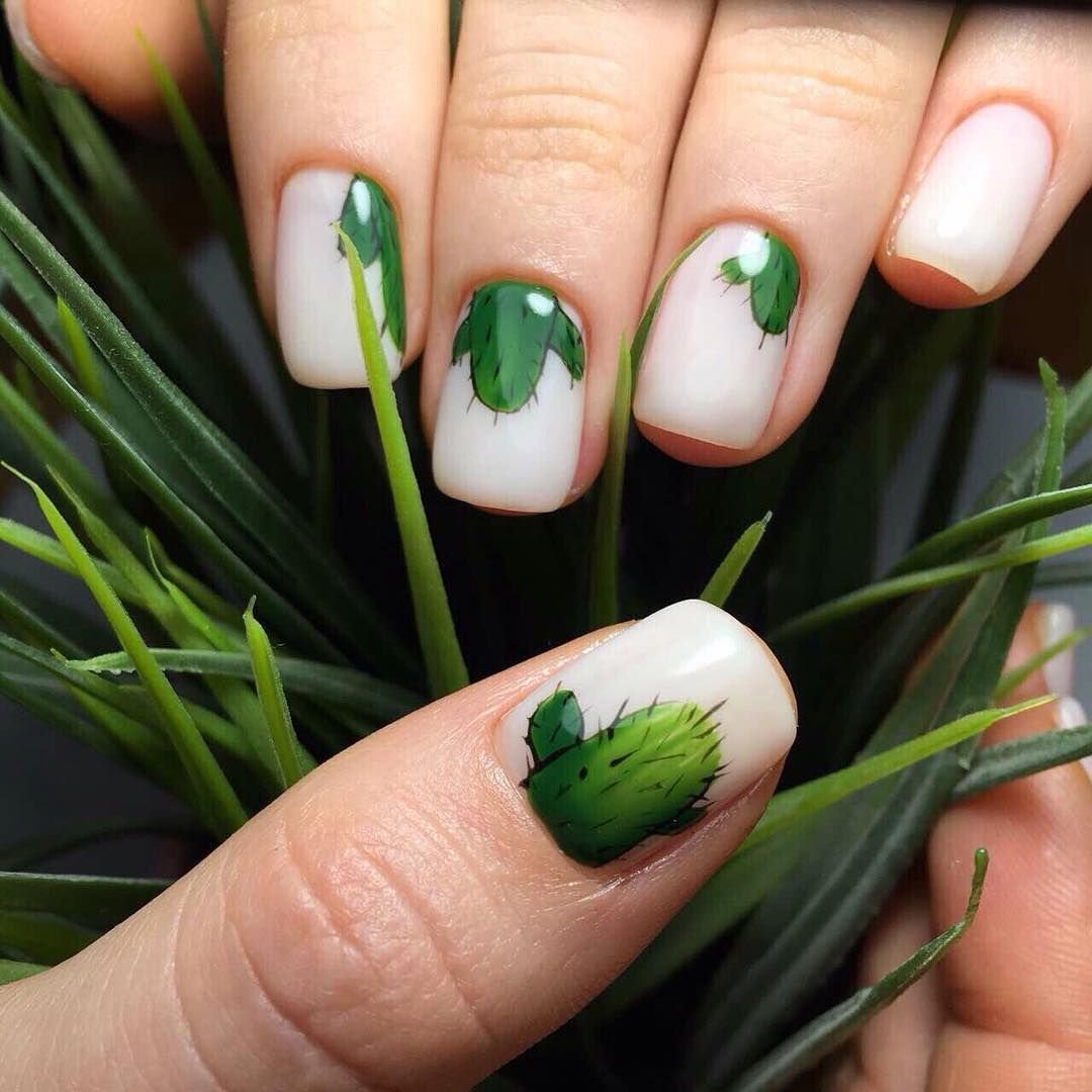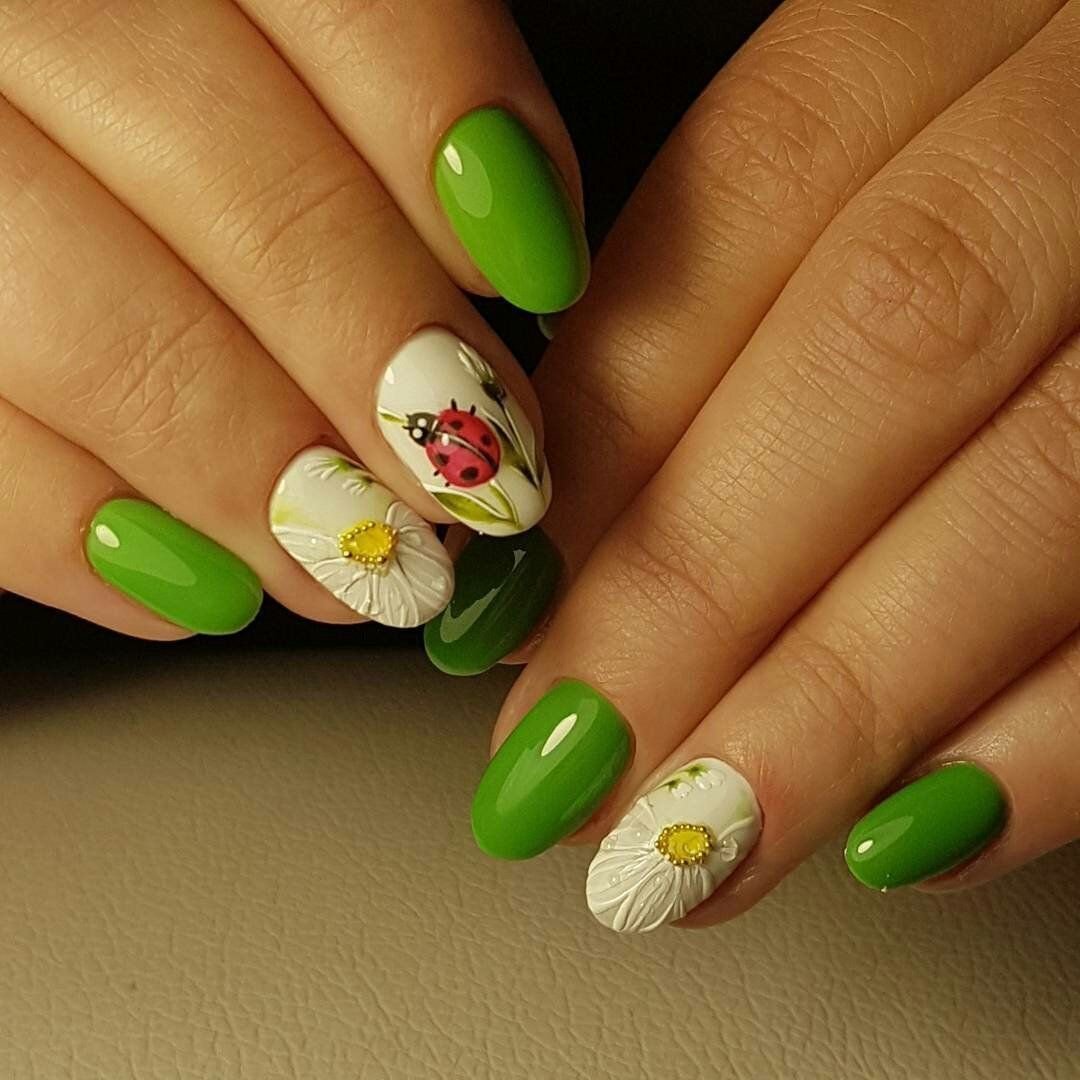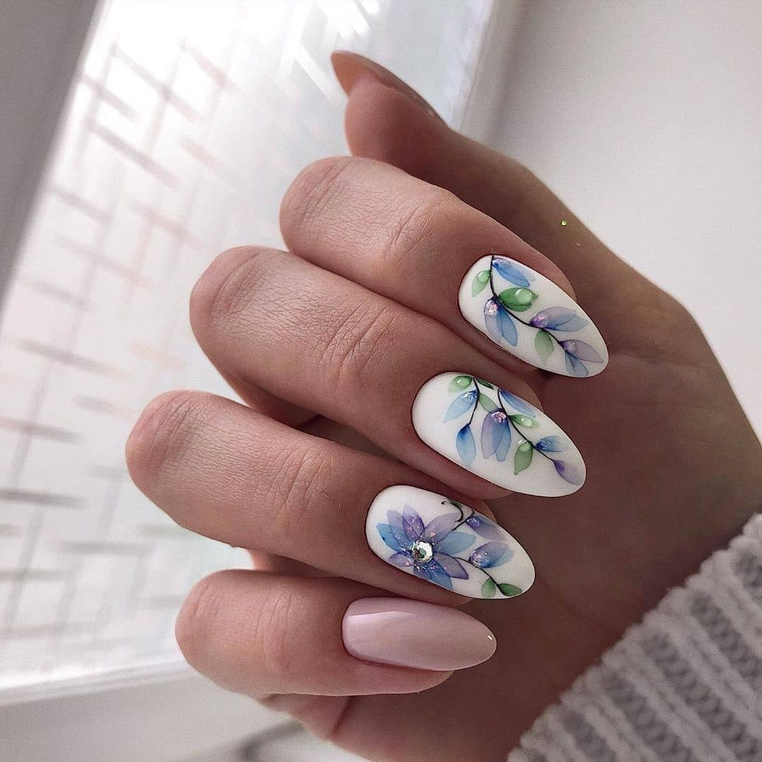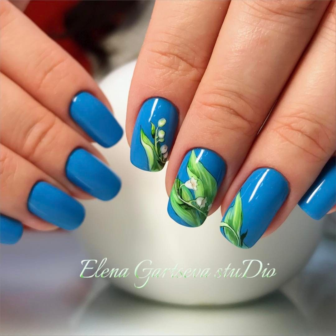 Разве можно обойтись без зеленого в цветочном маникюре? Конечно же, нет.НО зеленый можно использовать не только для декора, но и для базы. Отлично смотрится нежная зелень или техника омбре — от белого к нежному мятному. Обратите внимание на тенденцию сезона к естественности. Для базы можно выбрать оттенок хаки или оливковый. Они очень эффектно смотрятся в матовом исполнении. Для рисунка можно выбрать веточки и цветы оливы, листья клевера или нежные розовые цветы.