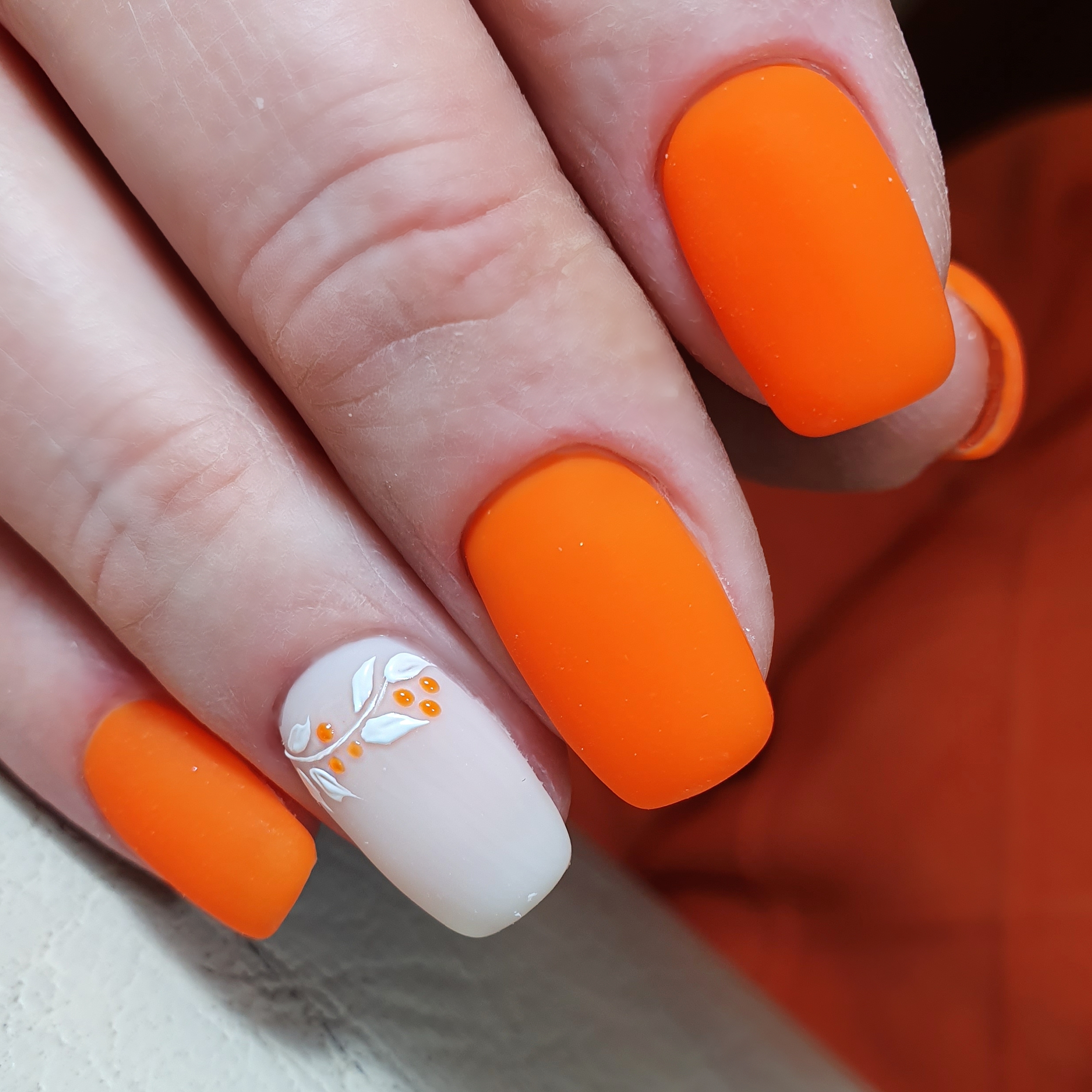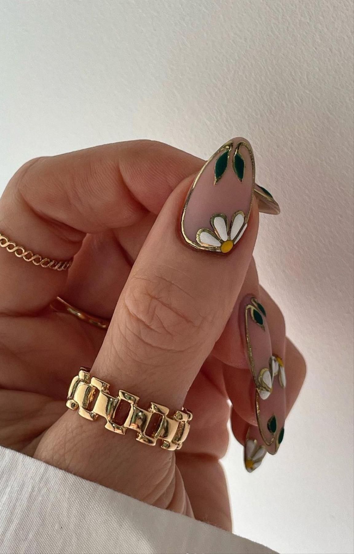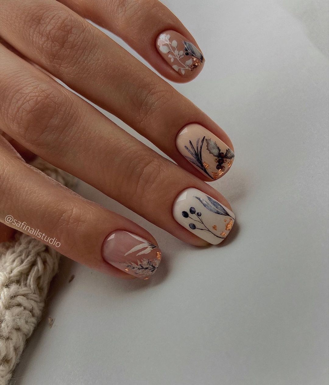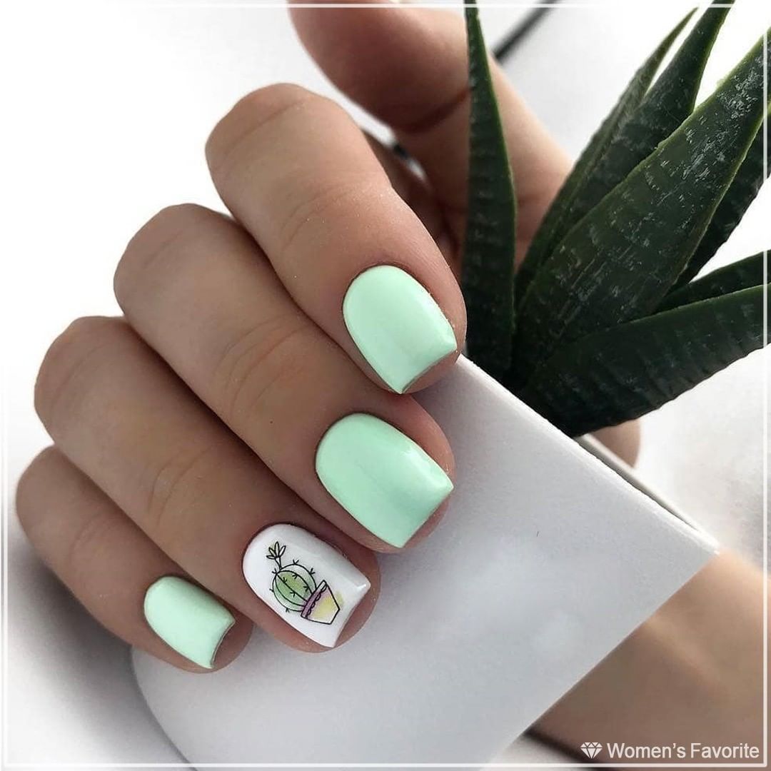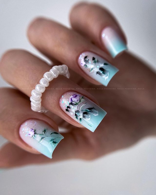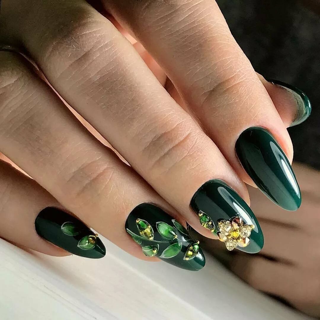 Разве можно обойтись без зеленого в цветочном маникюре? Конечно же, нет.НО зеленый можно использовать не только для декора, но и для базы. Отлично смотрится нежная зелень или техника омбре — от белого к нежному мятному. Обратите внимание на тенденцию сезона к естественности. Для базы можно выбрать оттенок хаки или оливковый. Они очень эффектно смотрятся в матовом исполнении. Для рисунка можно выбрать веточки и цветы оливы, листья клевера или нежные розовые цветы.