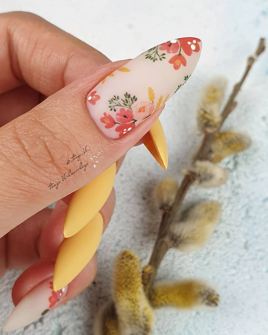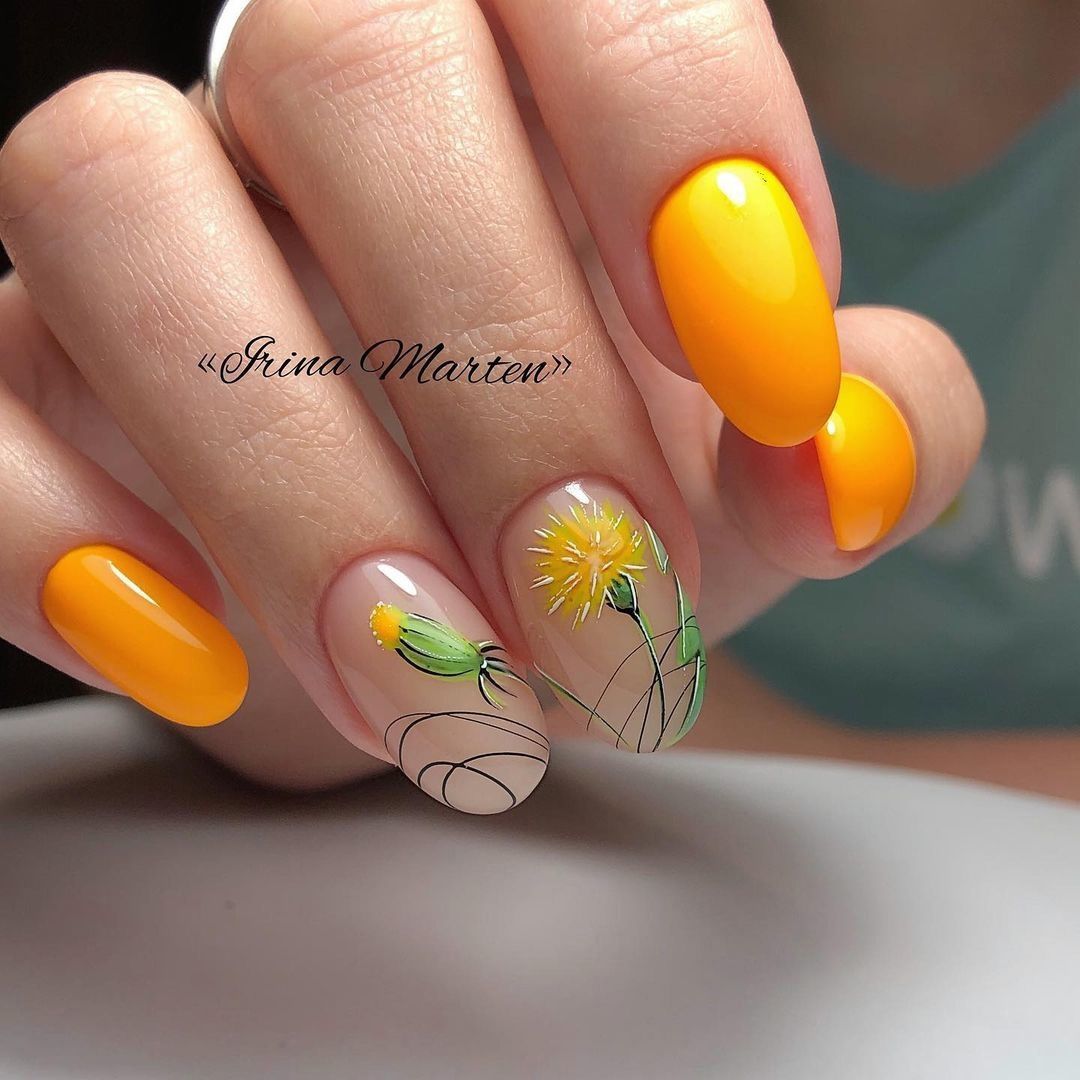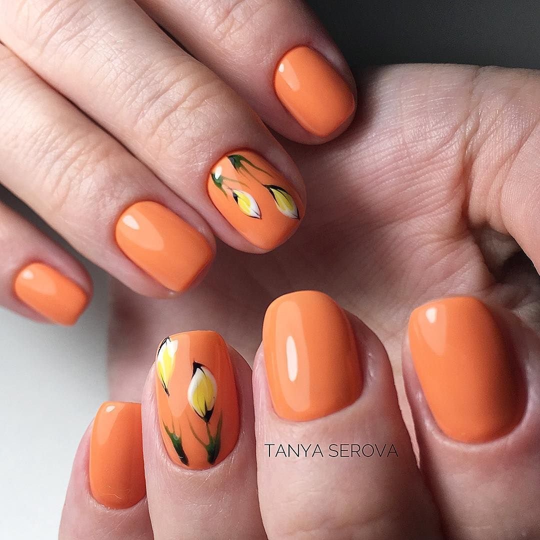 Весна и лето — сезоны, когда хочется максимум цвета и яркости в образе. Это тот период, когда ноготки можно окрасить в желтый или оранжевый и добавить им романтики, нарисовав нежные цветы — пионы, ландыши, тюльпаны и др.