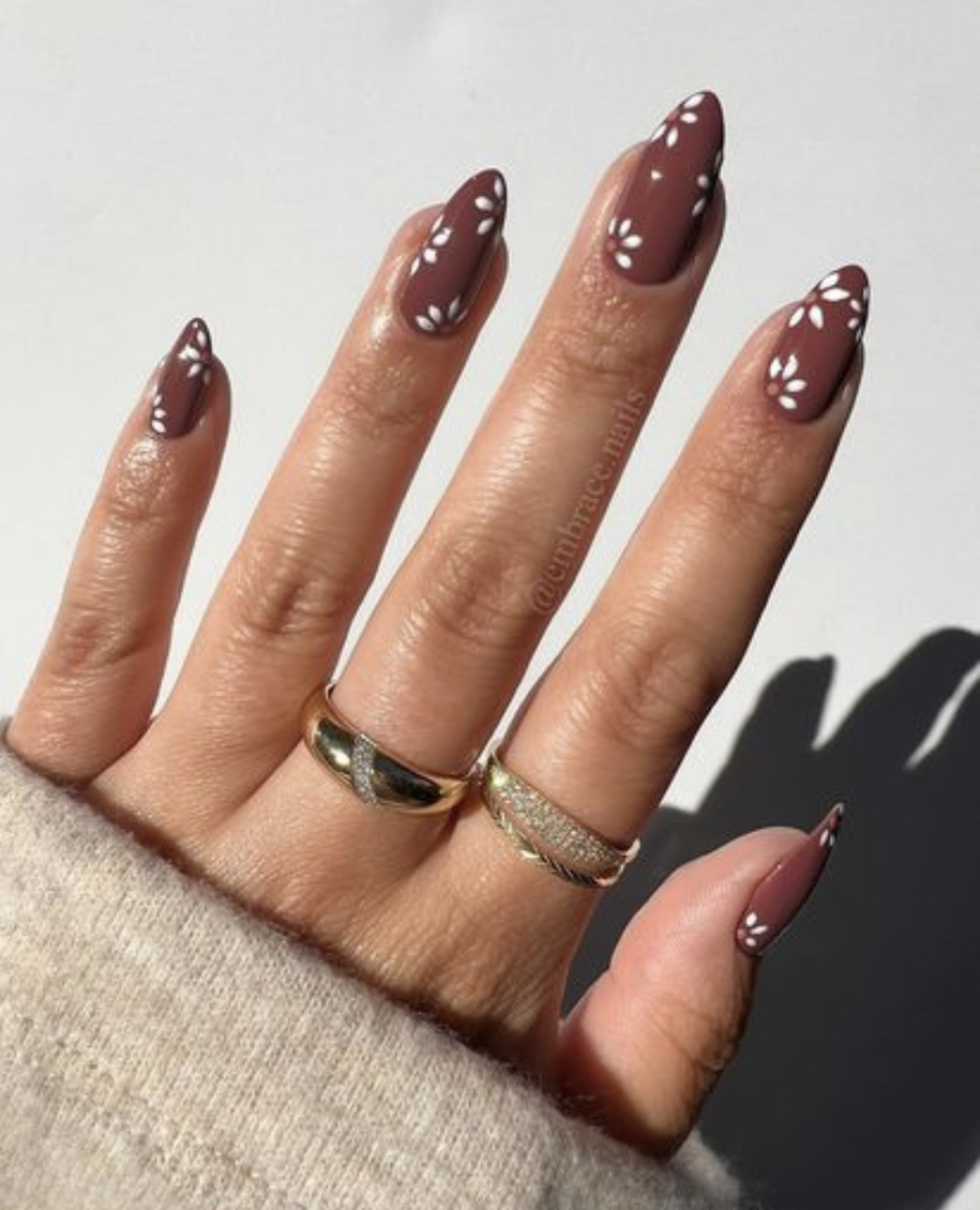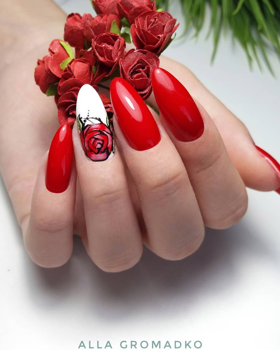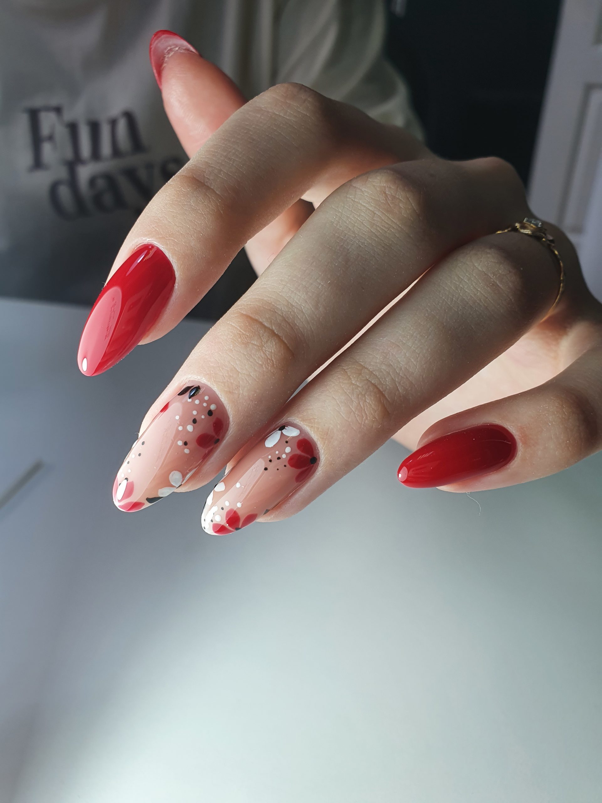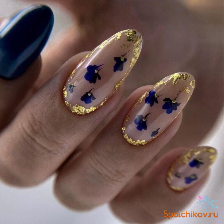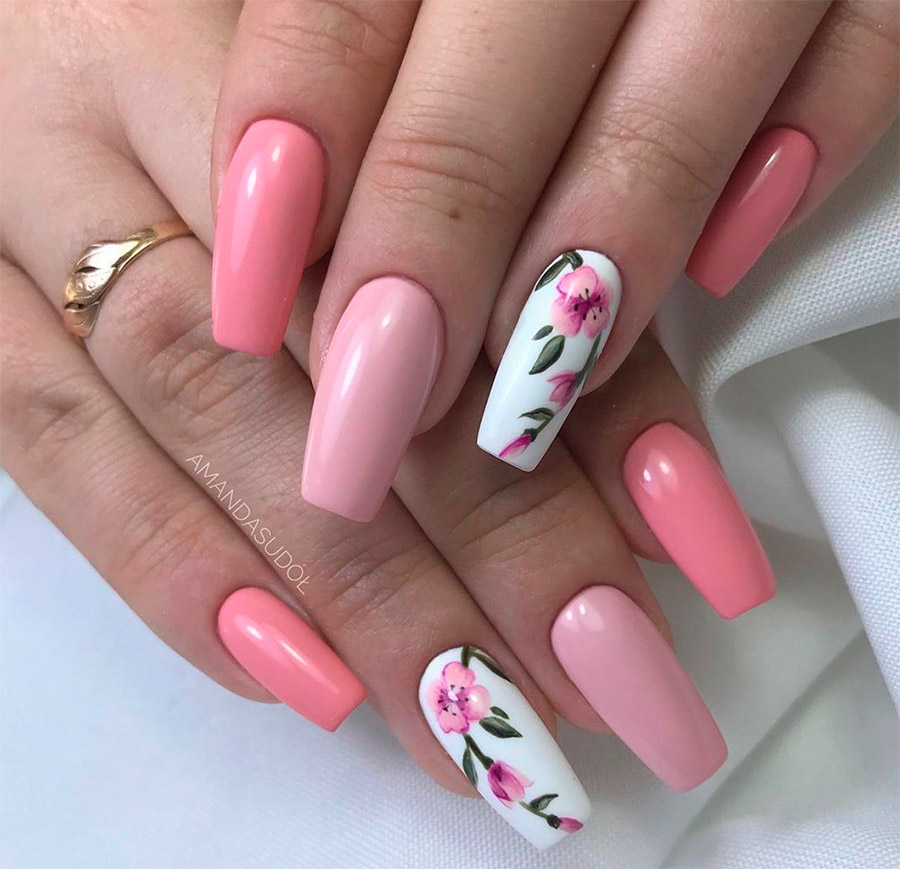 Совет: если вы решили разукрасить длинные ногти рисунками мелких цветочков, не частите. Промежутки между рисунками должны быть больше, чем при короткой длине. Если хотите усыпать пластину цветками, используйте прием — выбирайте акцентный пальчик и тщательно раскрашивайте его цветами.