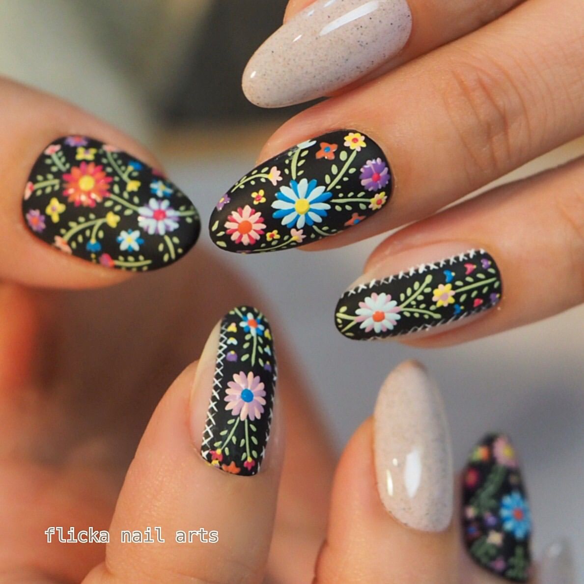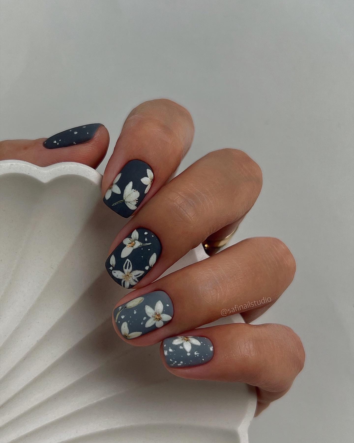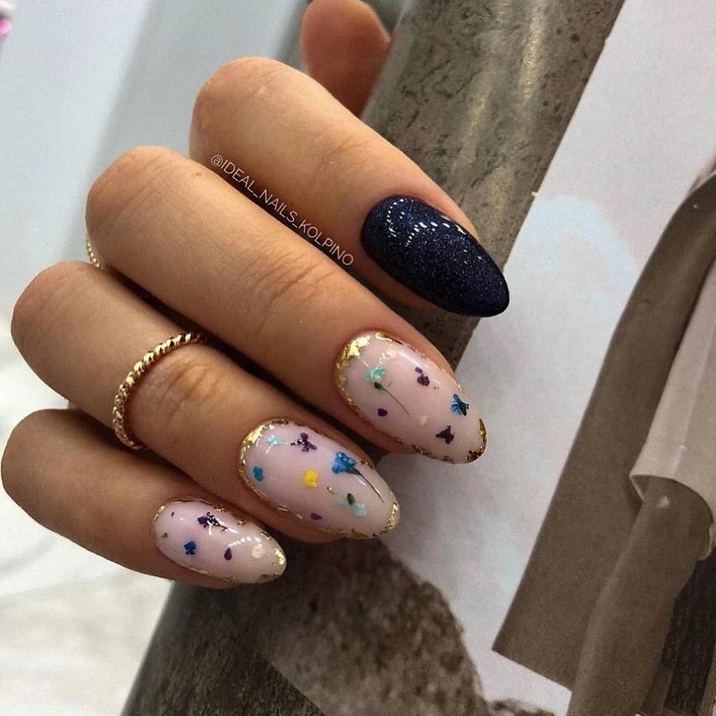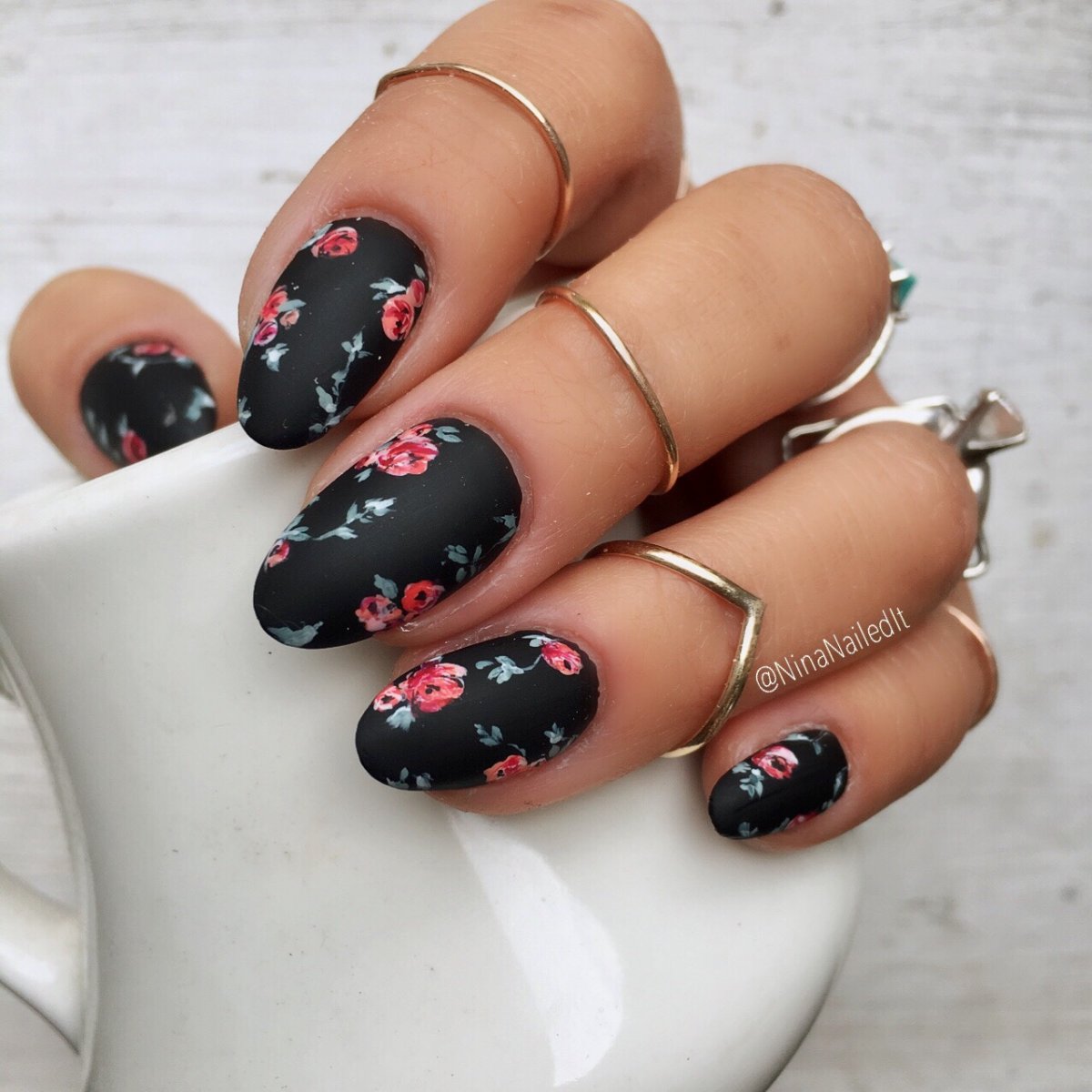 При большой длине стоит обратить внимание на то, что крупные цветы могут сделать и без того длинную пластину еще более длинной. Кстати, для таких ноготков тоже подходит актуальный тренд на мелкие цветочки. Интересно смотрится дизайн, когда для базы используют матовый темный гель-лак.
