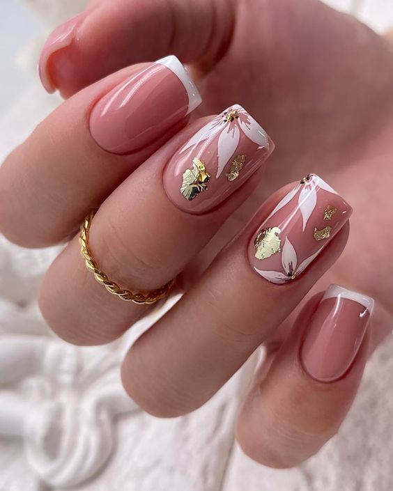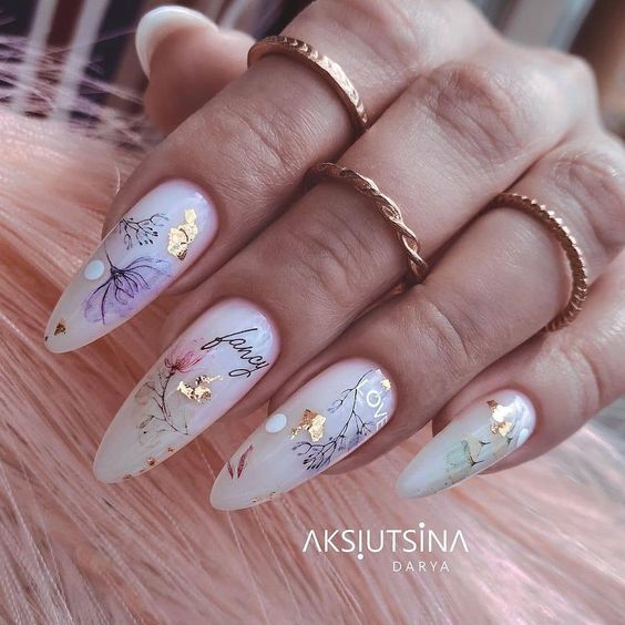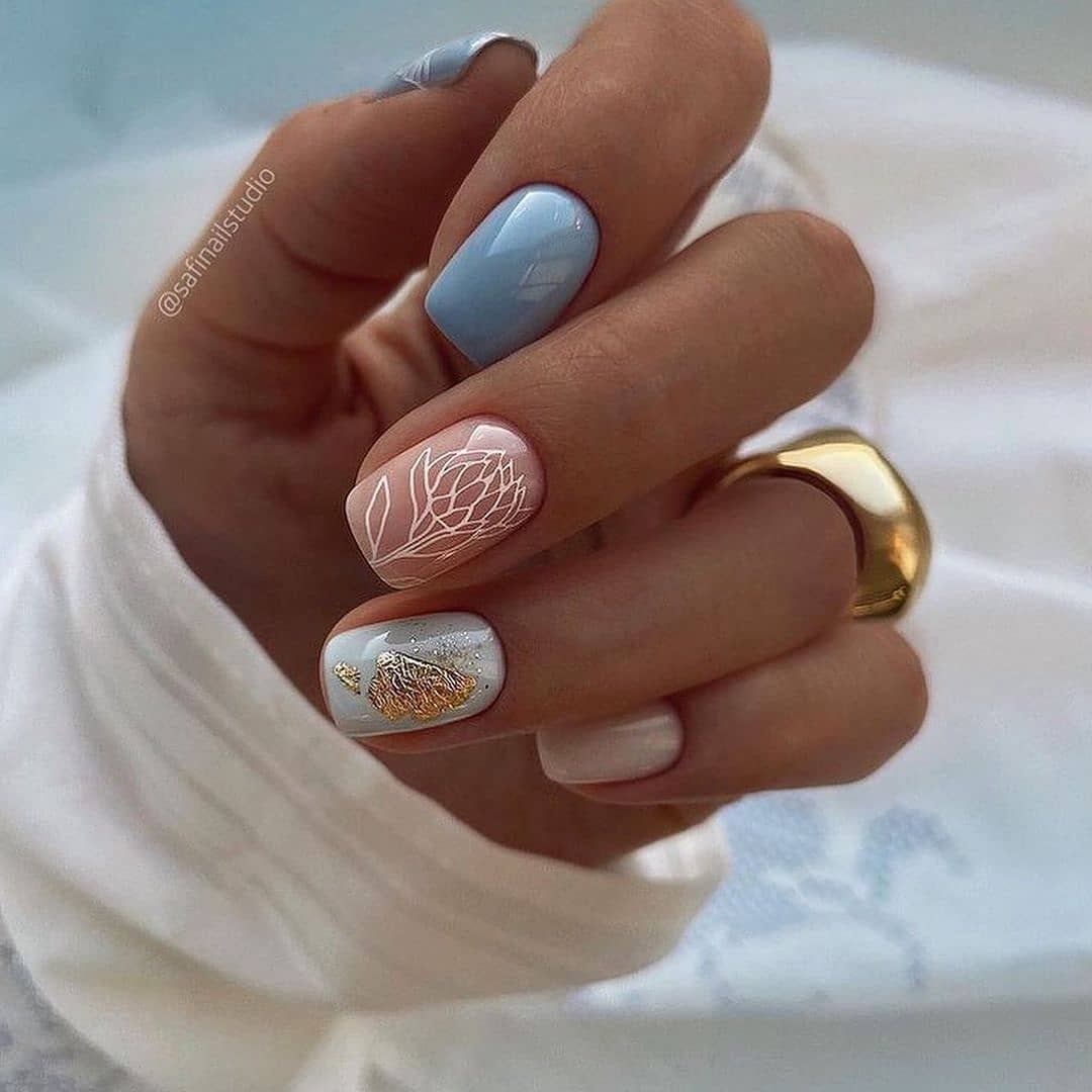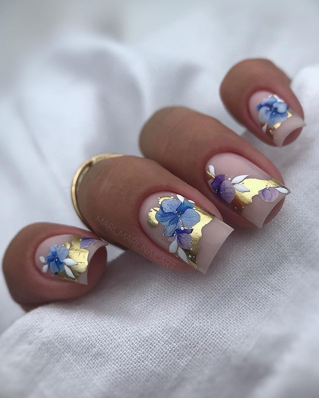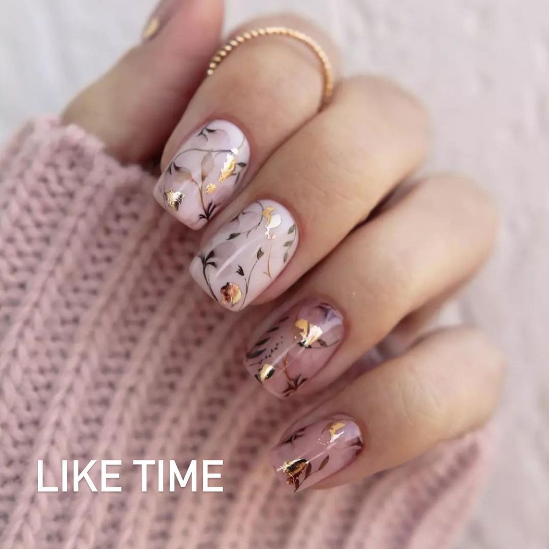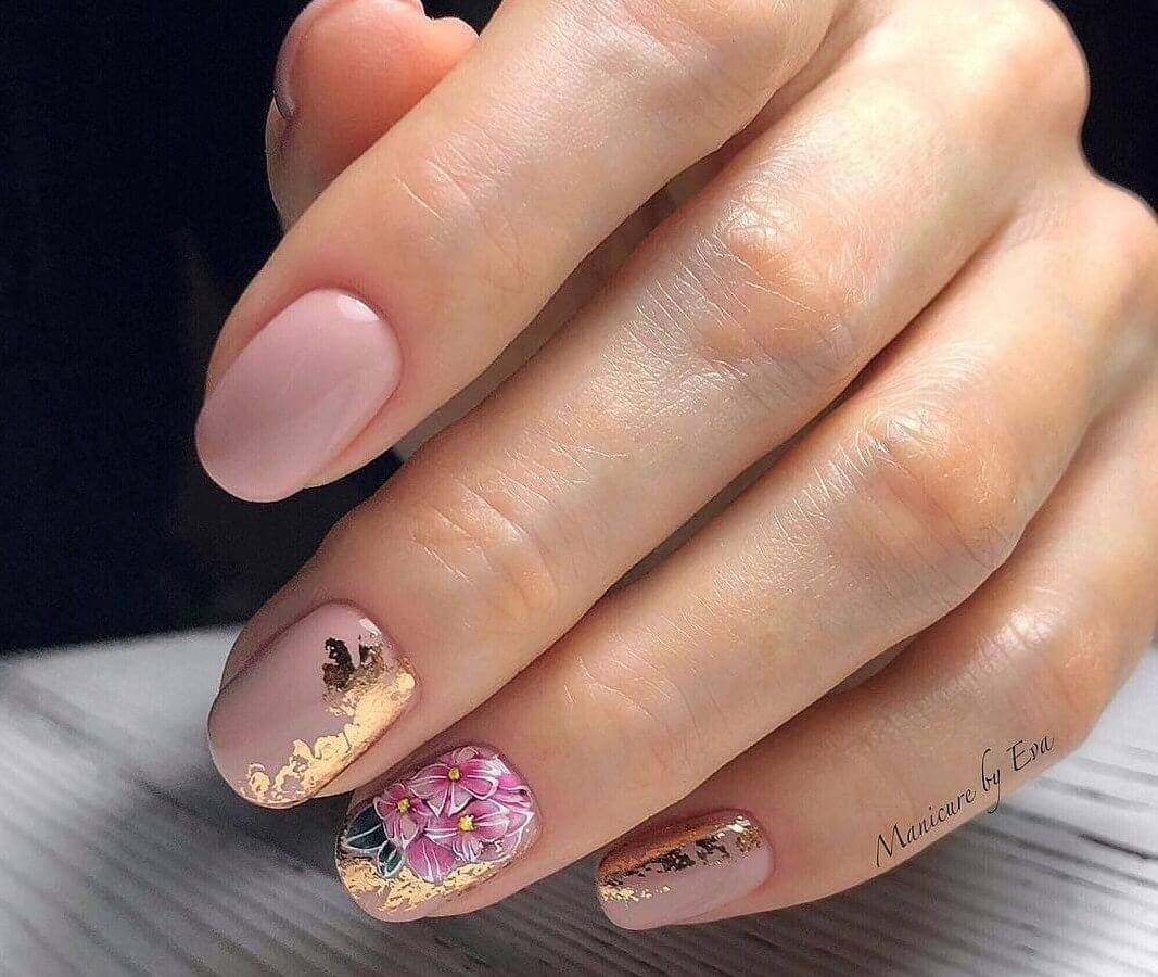 Еще один вариант декора, который сделает маникюр с цветами более глубоким и интересным. С помощью фольги можно заполнить пустоты на пластине, сделать яркую блестящую подложку. Фольга одинаково эффектно смотрится как на молочной или другой светлой базе, так и на темном фоне с матовой текстурой.