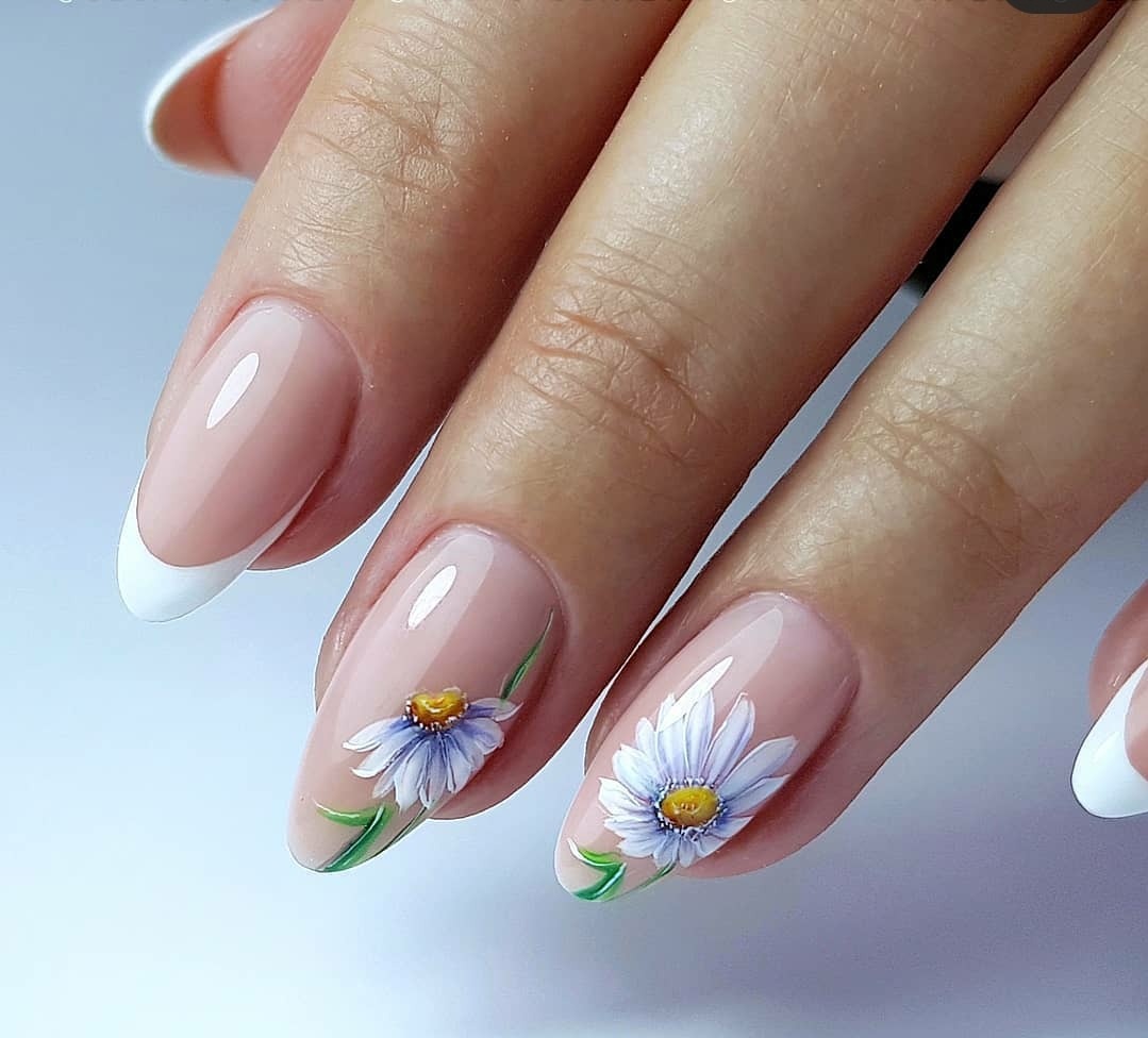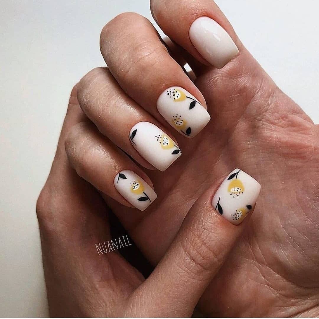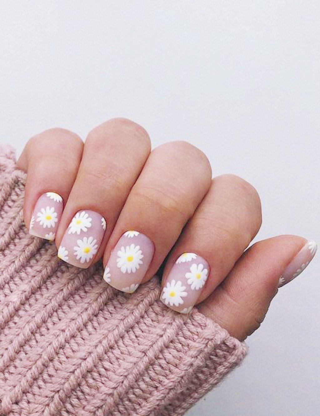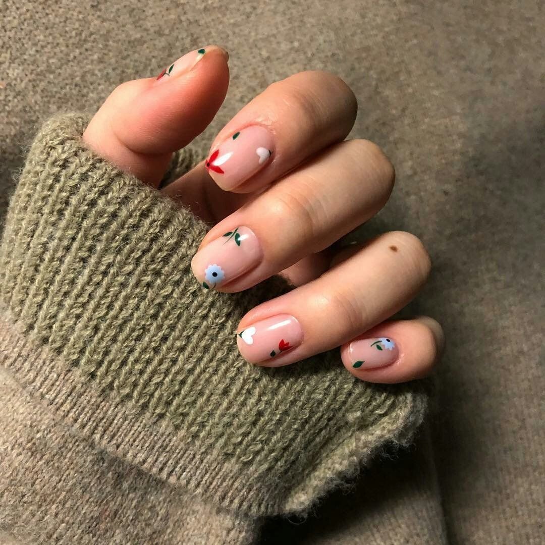 Для коротких ногтей лучше использовать рисунок мелких полевых цветов. Крупные варианты не подходят. Исключение — вы решили сделать акцент на единственном ноготке. Обратите внимание на тренд сезона 2026 — мелкие полевые цветочки без листочков на коротких ногтях. Для базы лучше выбрать прозрачный лак, молочный или нюдовый оттенок. Цветы рисуют схематично, словно к рисунку приложил руку ребенок. Например, ромашки с помощью самой маленькой насадки дотса.