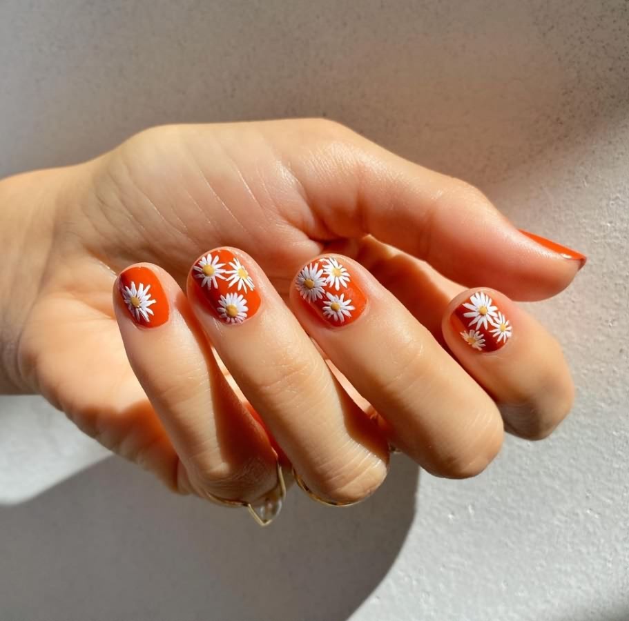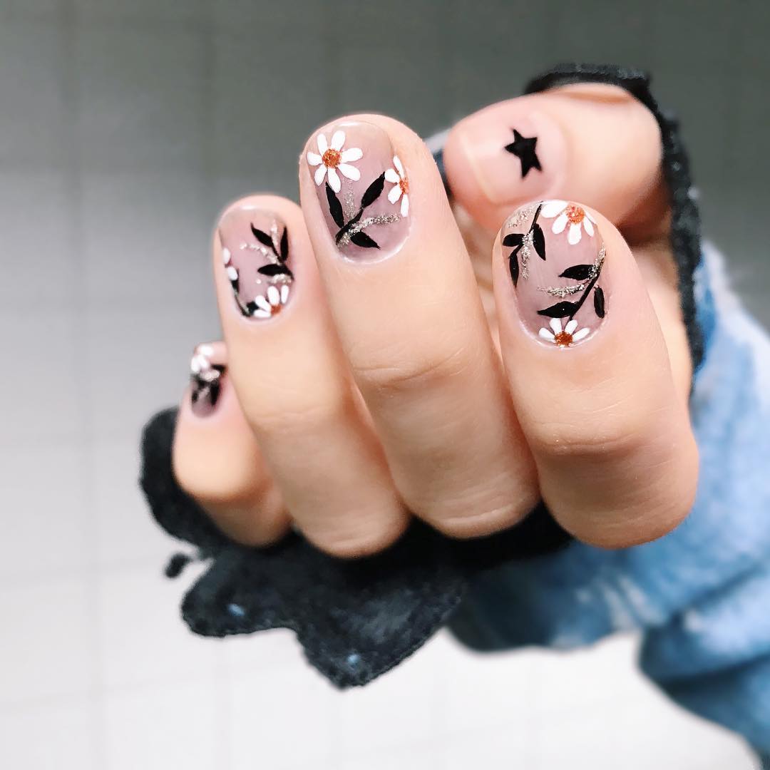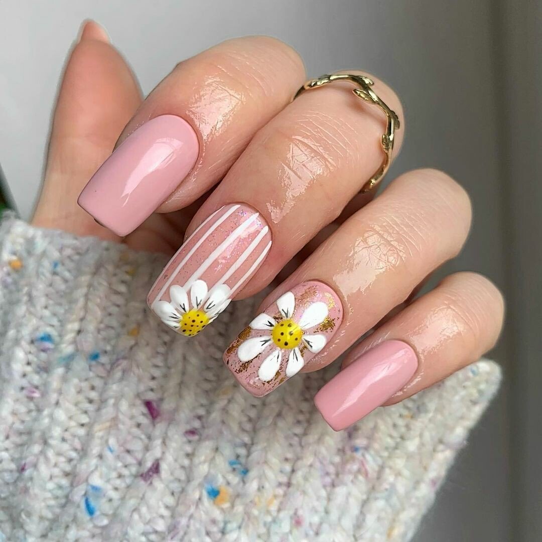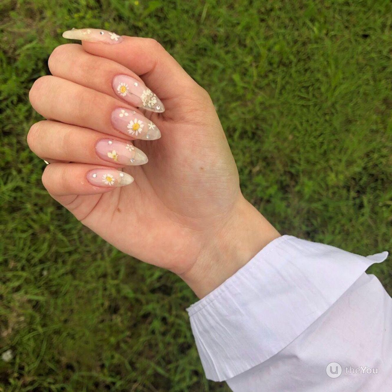 Для коротких ногтей лучше использовать рисунок мелких полевых цветов. Крупные варианты не подходят. Исключение — вы решили сделать акцент на единственном ноготке. Обратите внимание на тренд сезона 2026 — мелкие полевые цветочки без листочков на коротких ногтях. Для базы лучше выбрать прозрачный лак, молочный или нюдовый оттенок. Цветы рисуют схематично, словно к рисунку приложил руку ребенок. Например, ромашки с помощью самой маленькой насадки дотса.