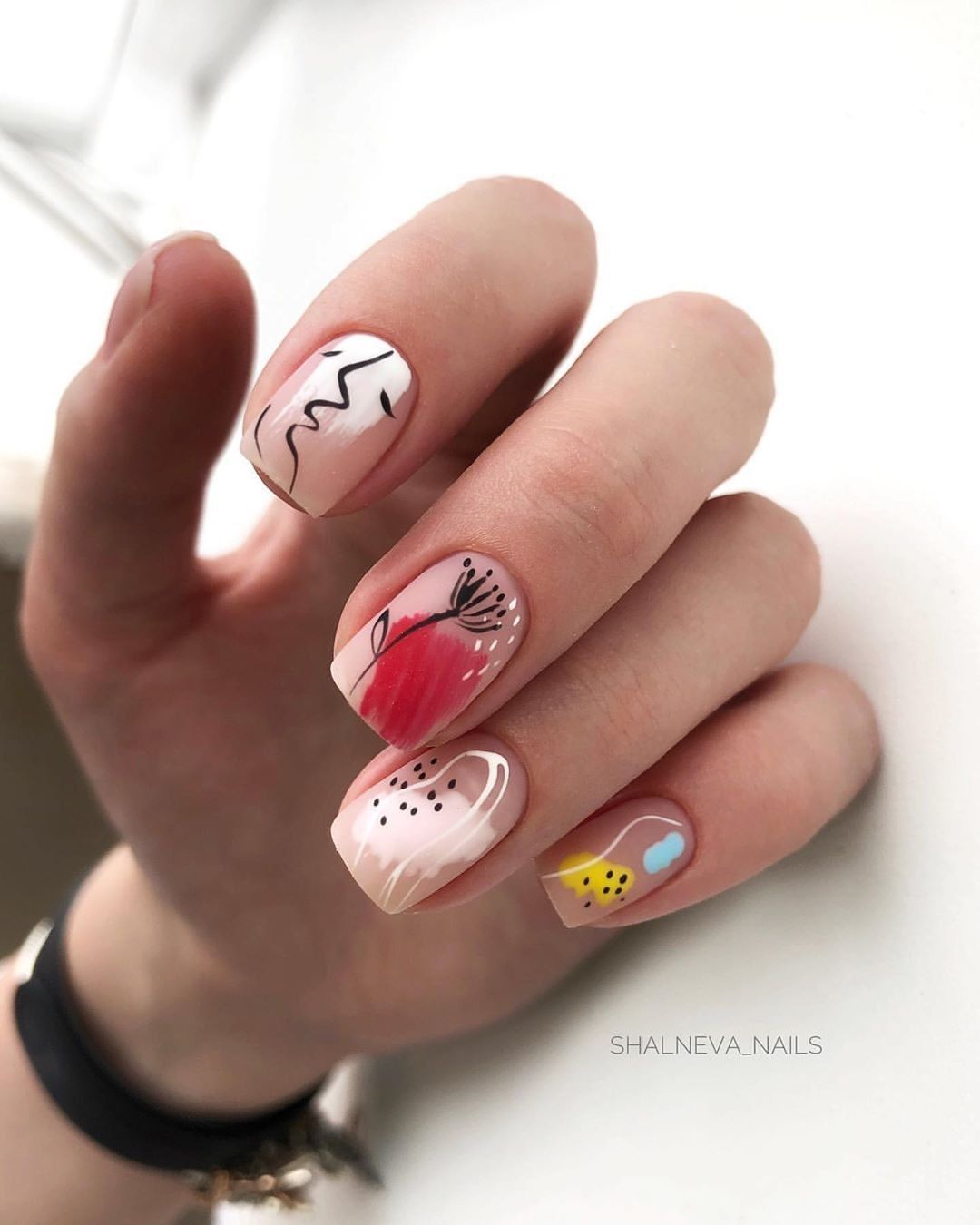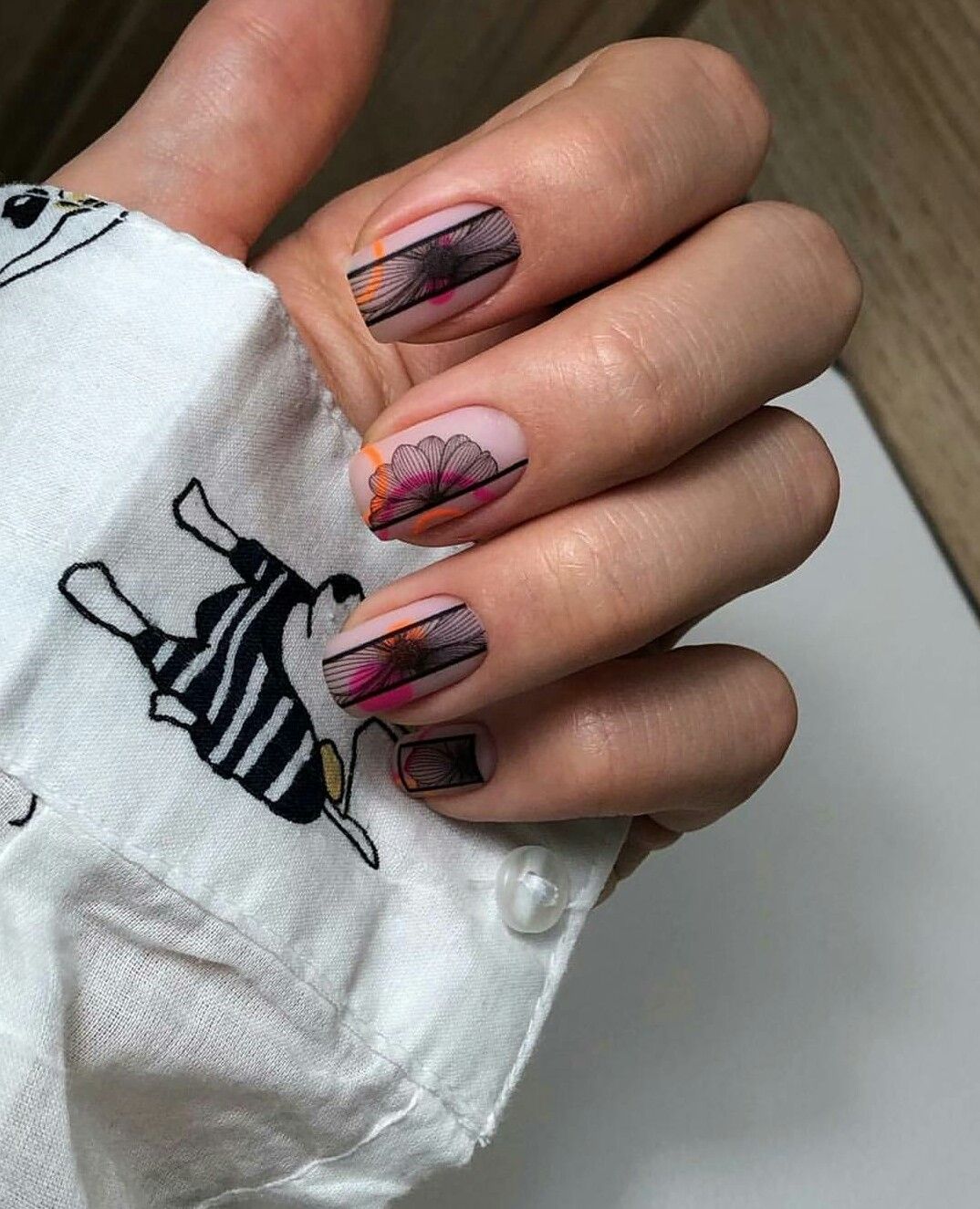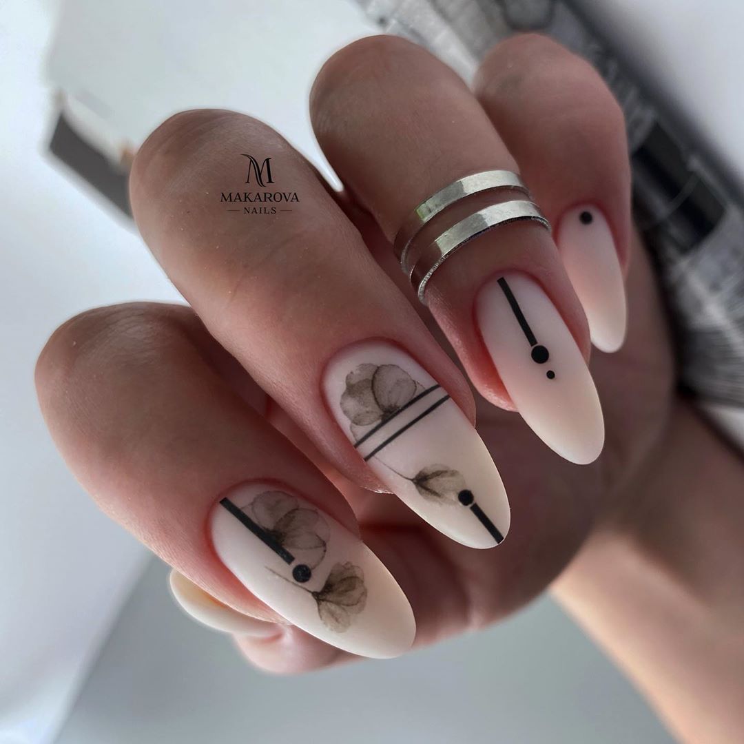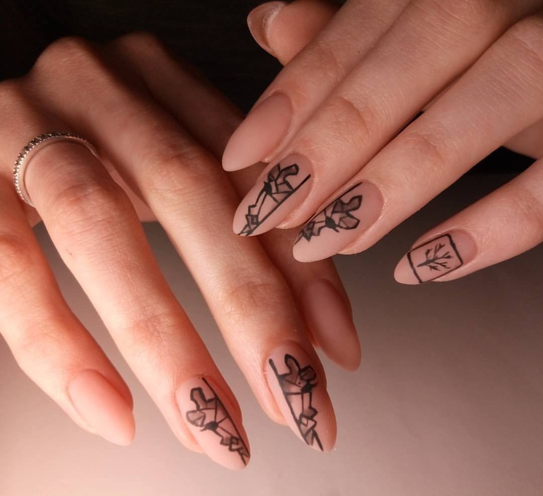 Что это за оттенок? Это бежевый или телесный, близкий к розовому. Максимально естественный. Создается впечатление, что маникюр вообще не имеет окраски. На таком фоне отлично смотрятся как нежные акварельные цветы, так и рисунки с четкими линиями в технике колор блок.