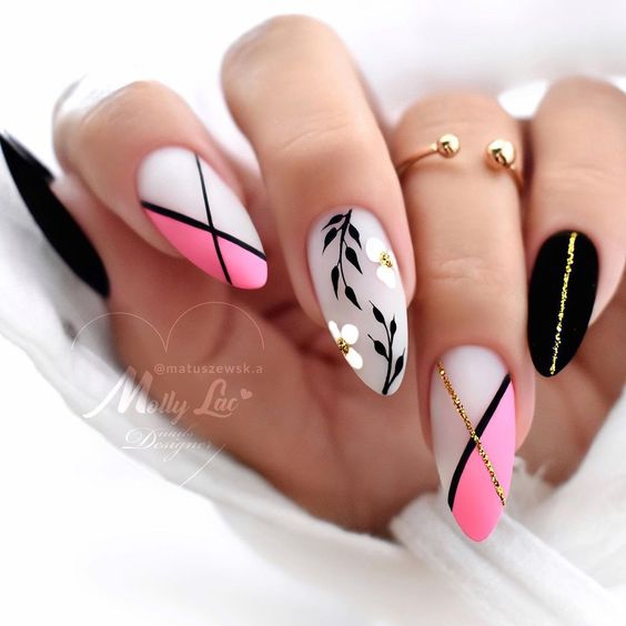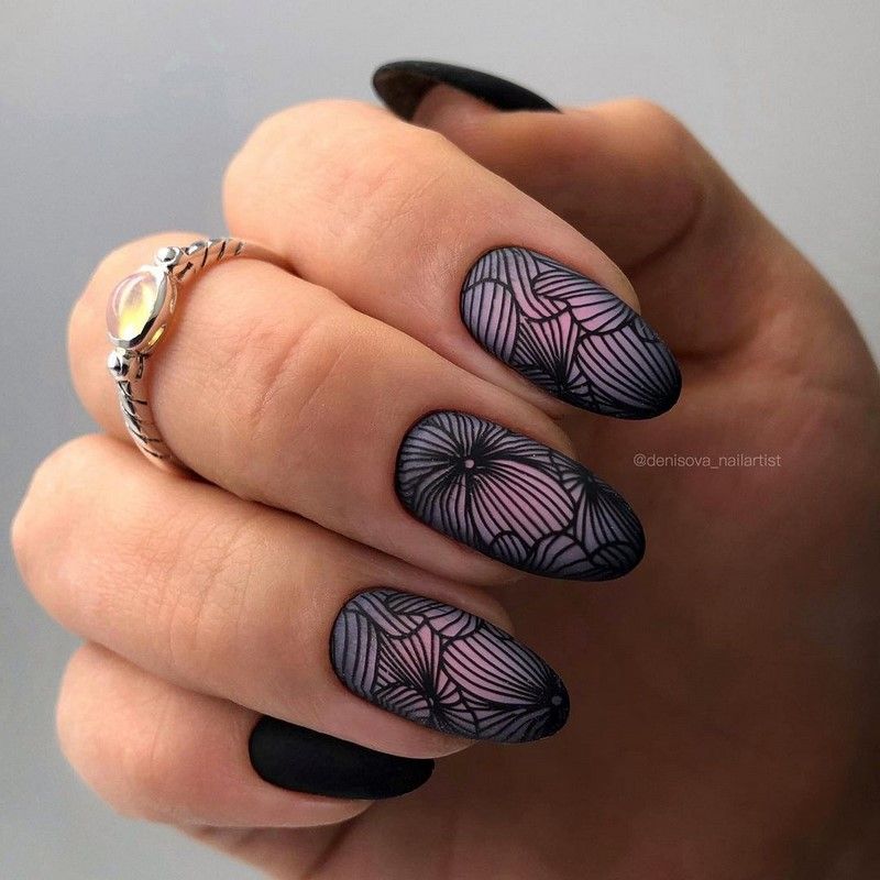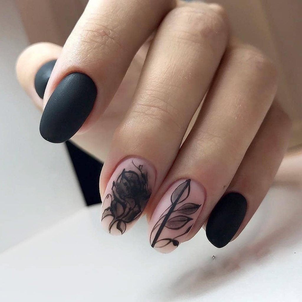 Черный маникюр уже очень давно перестал быть мрачным и безликим. Современный нейл-арт находит его стильным и универсальным. Очень стильно смотрится на черном матовом фоне маникюр в стиле Свит блум, минимализм или абстракция. Попробуйте создать на таком темном фоне акварельный дизайн или использовать стемпинг.