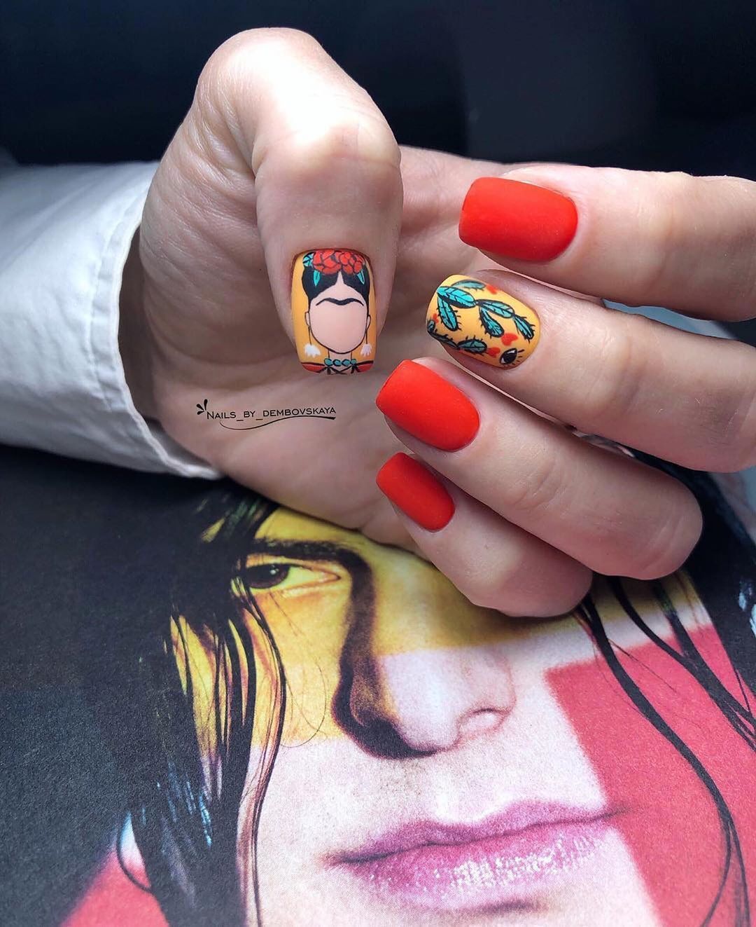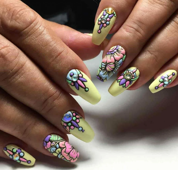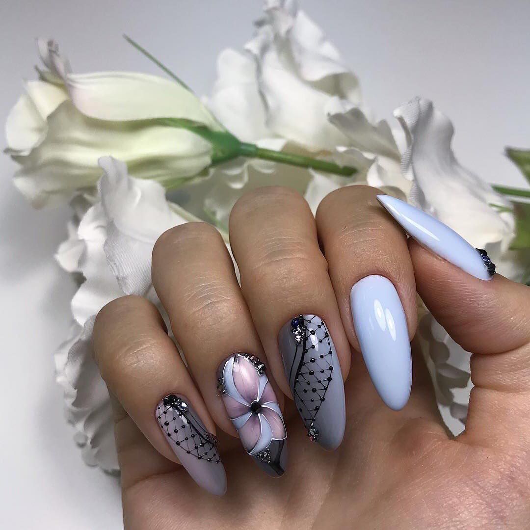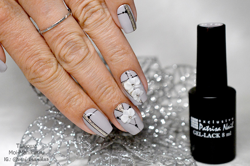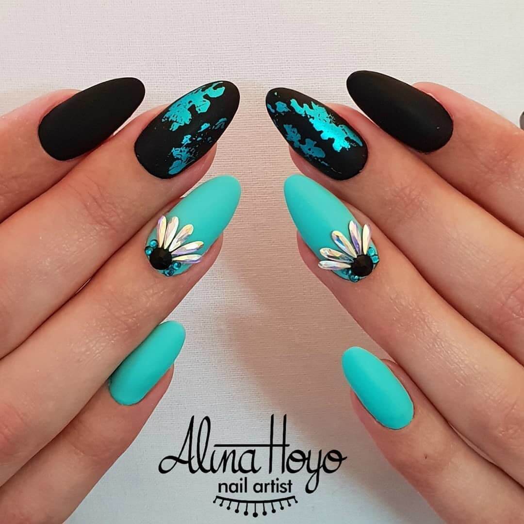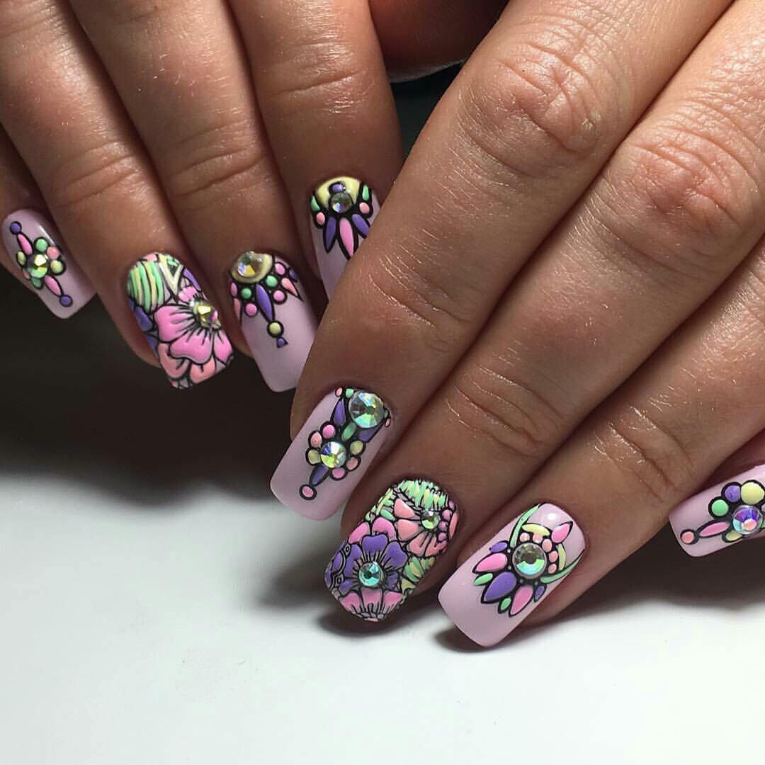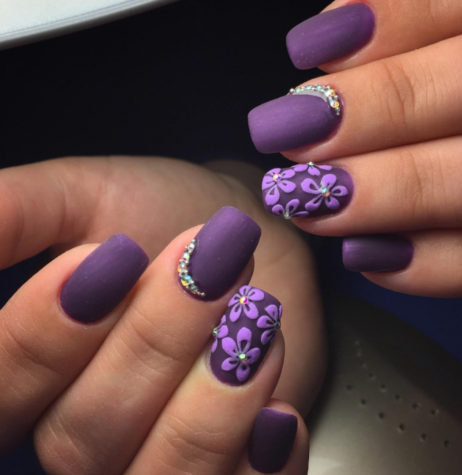 Матовая текстура дает возможность создавать самые разные дизайны — от активного с темным лаком и яркими цветами до нежного нюдового. Для рисования цветов можно выбрать глянцевый лак или фольгированные наклейки. Отлично смотрятся и 3д рисунки. Только не усердствуйте с таким дизайном. Слишком тяжелые и большие 3д цветы будет неудобно носить, да и выглядят они порой слишком вычурно.