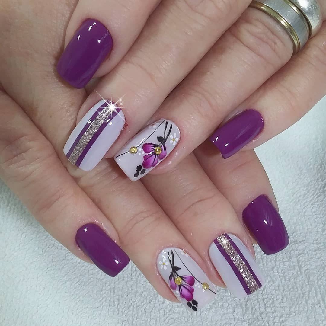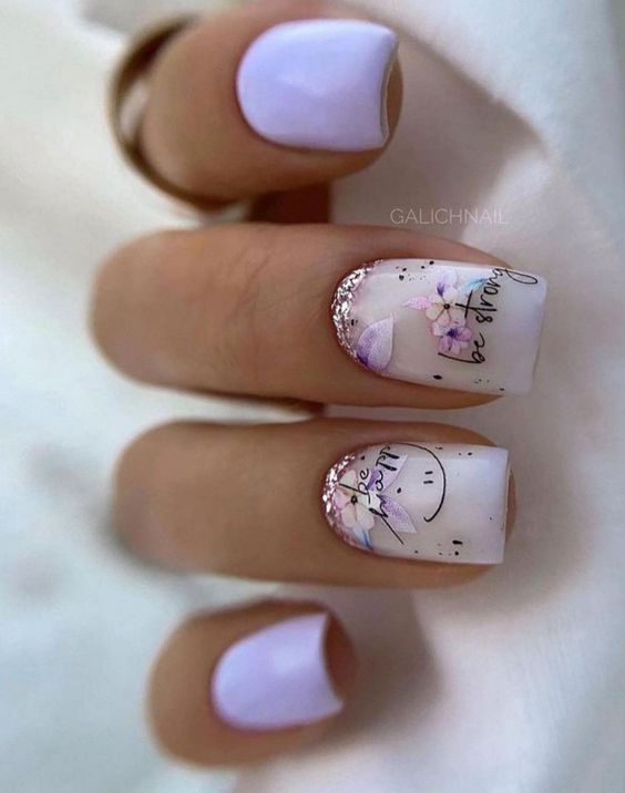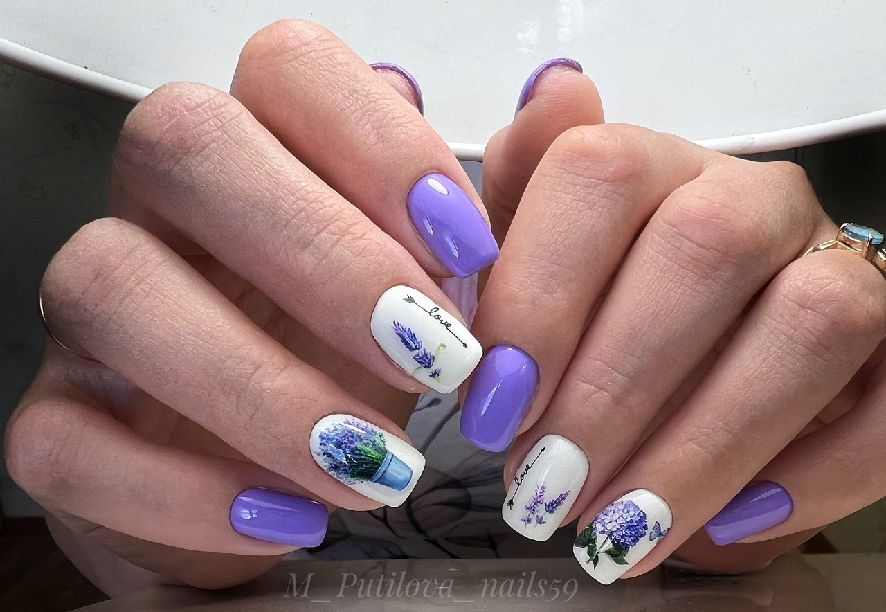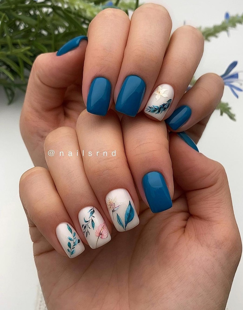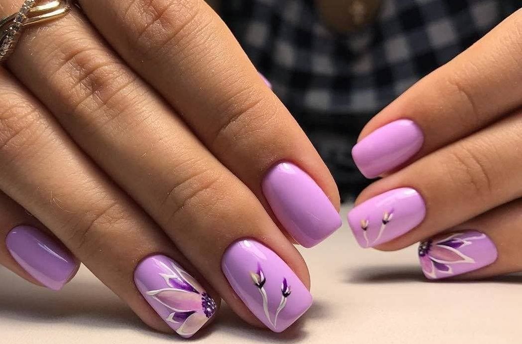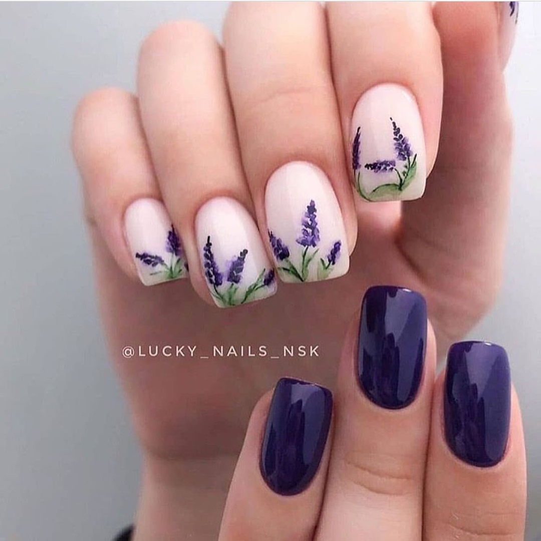 Цветочный маникюр на форму квадрат имеет свои нюансы. Это довольно активная форма, которую выбирают деловые и решительные дамы. Многим кажется, что романтический дизайн плохо монтируется с острыми уголками и широкой пластиной. Это не так. Цветы отлично подходят для такой формы. Но лучше выбирать тщательно прорисованные четкие линии. Например, маникюр с веточками лаванды на молочной базе, мелкие анютины глазки на матовом топе или яркие ромашки на зеленом глянцевом покрытии.