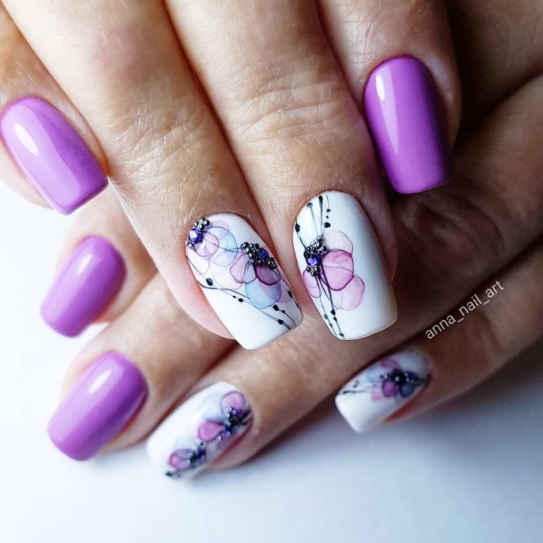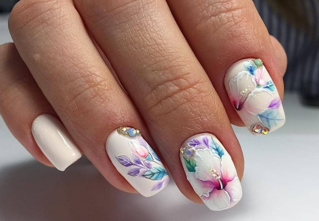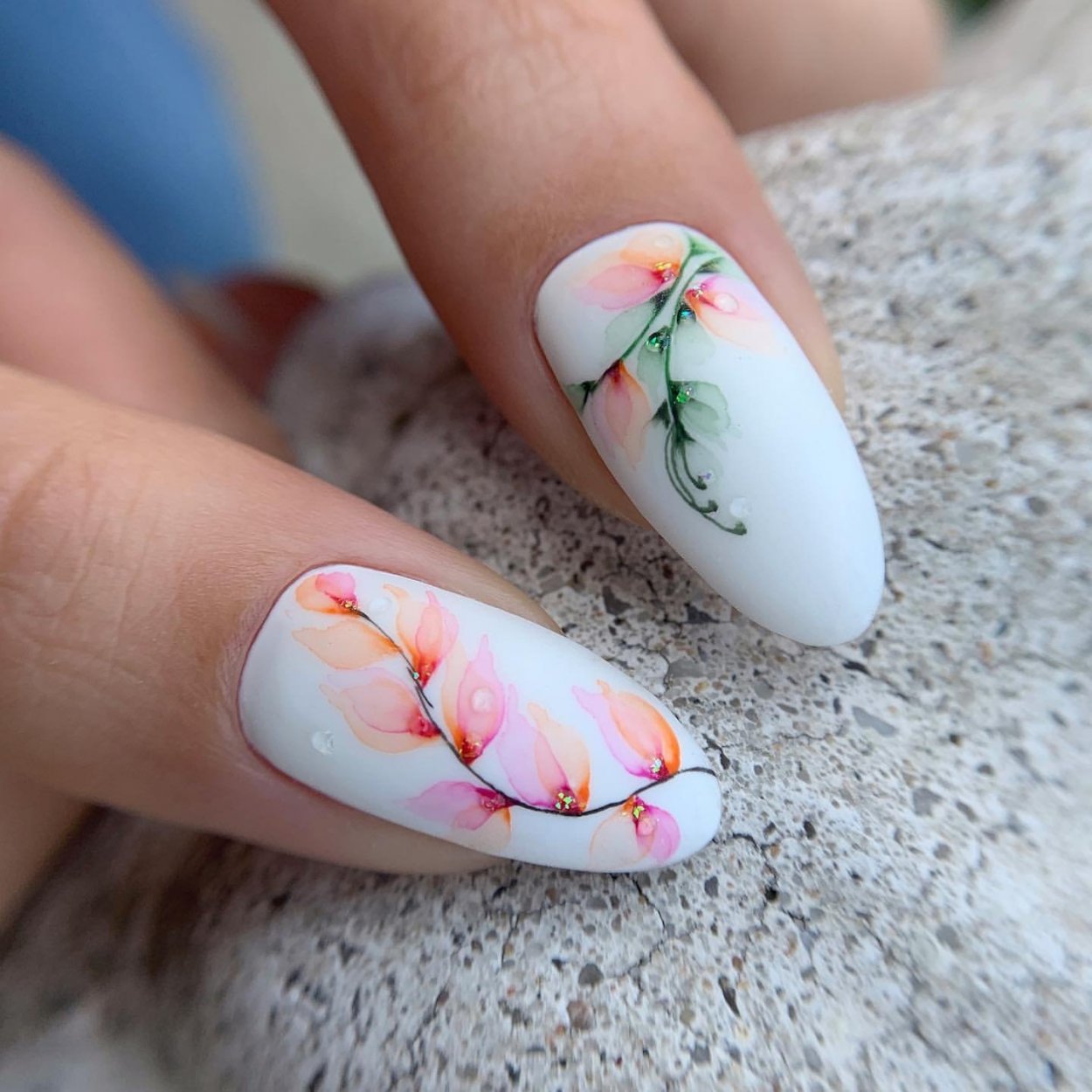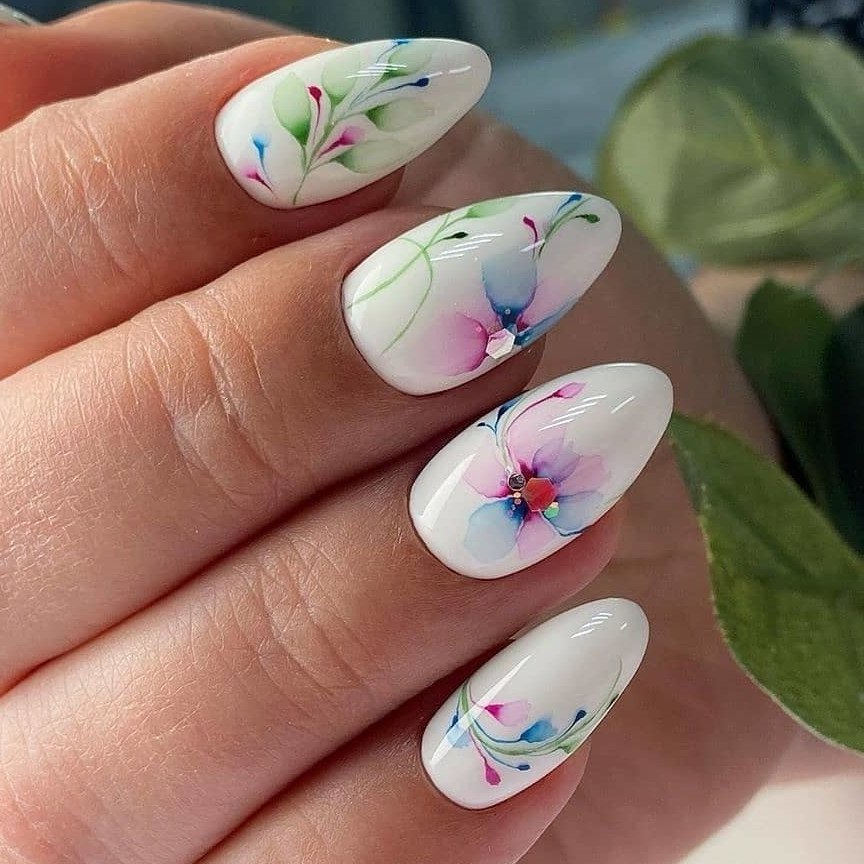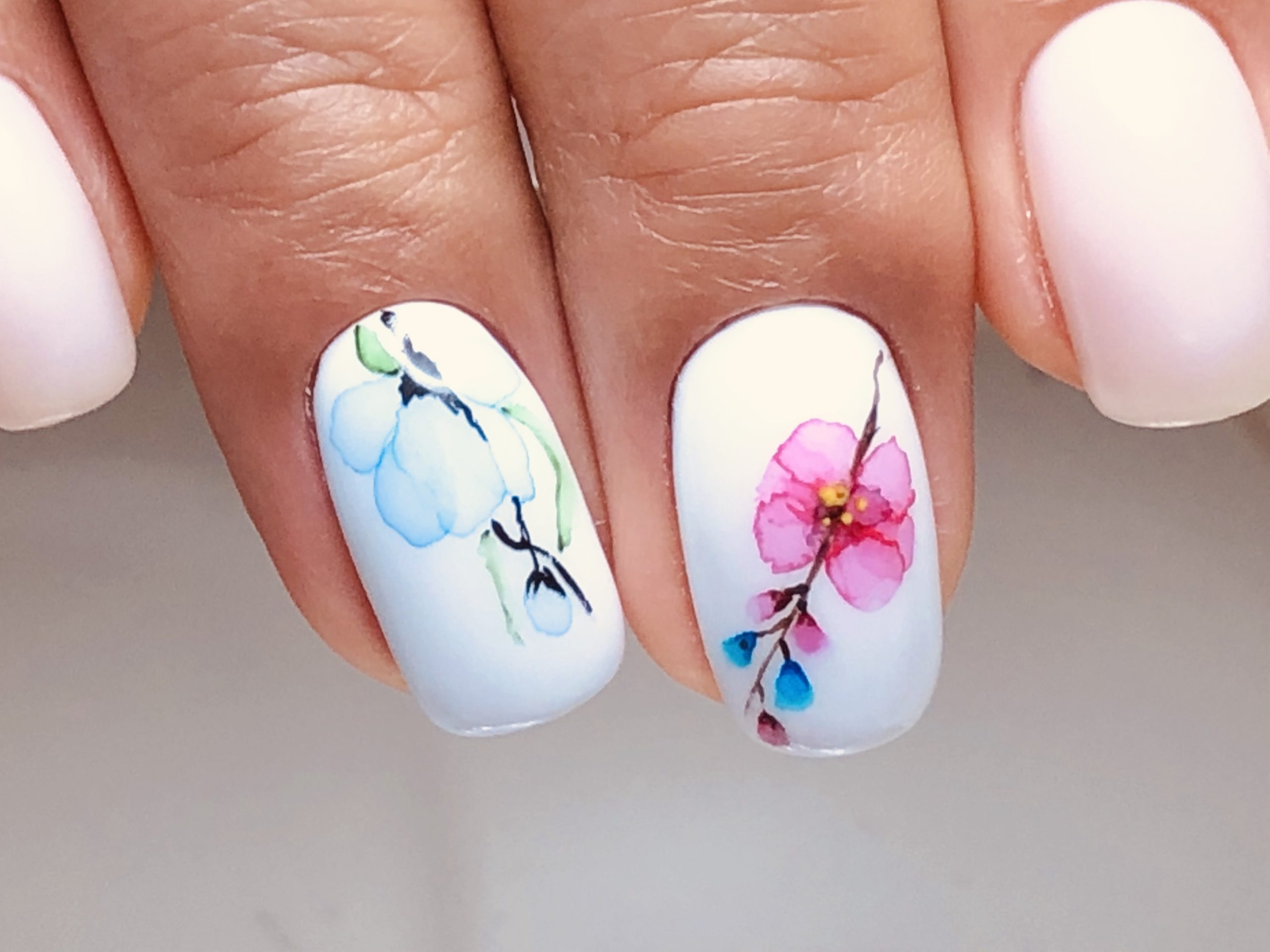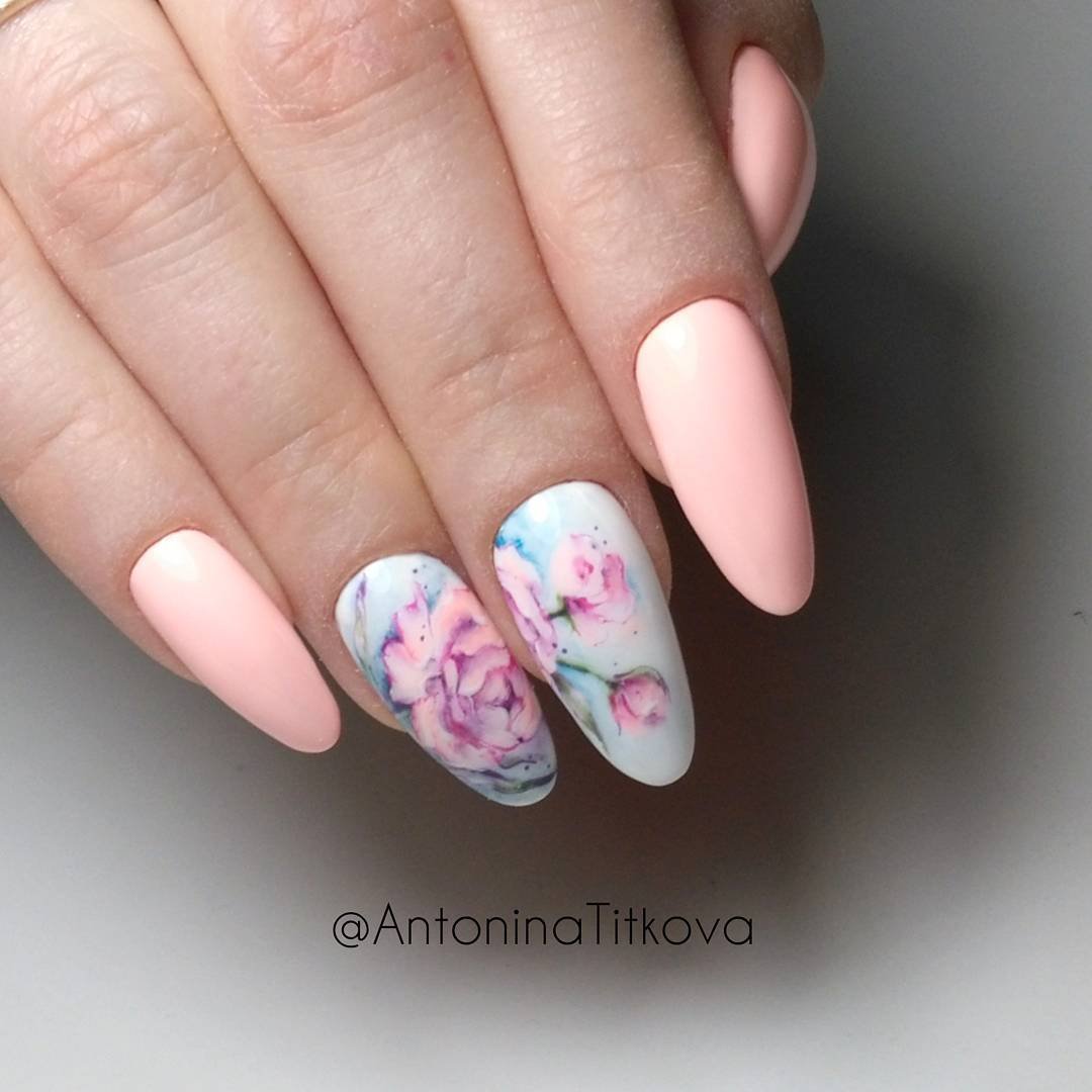 Акварельные рисунки — это мило, нежно и стильно. Недостатком такого дизайна является сложность исполнения. Если вы решите обратиться за таким маникюром в салон, обязательно посмотрите портфолио мастера. От его мастерства и художественного чутья напрямую зависит то, насколько аккуратным и красивым будет итог. Нарисовать акварельные цветы самостоятельно довольно сложно, но если у вас есть навыки художника — то вполне реально.