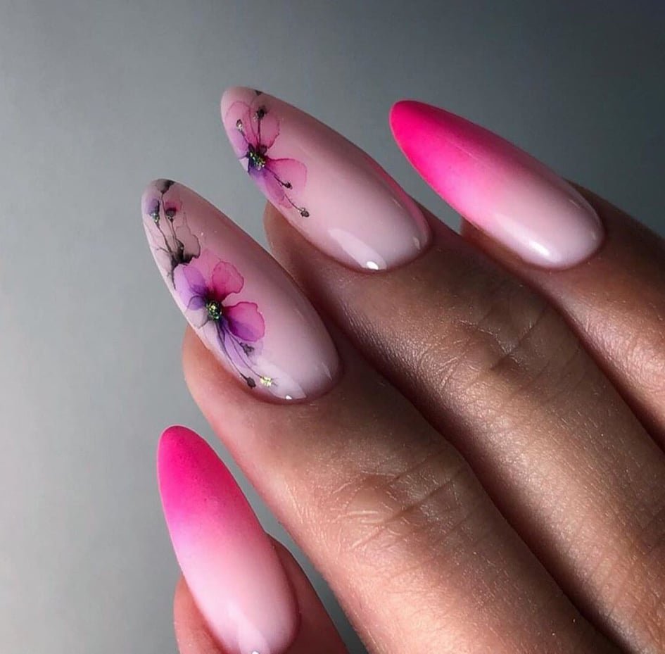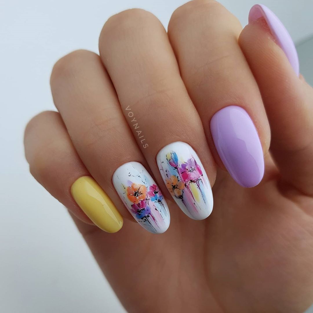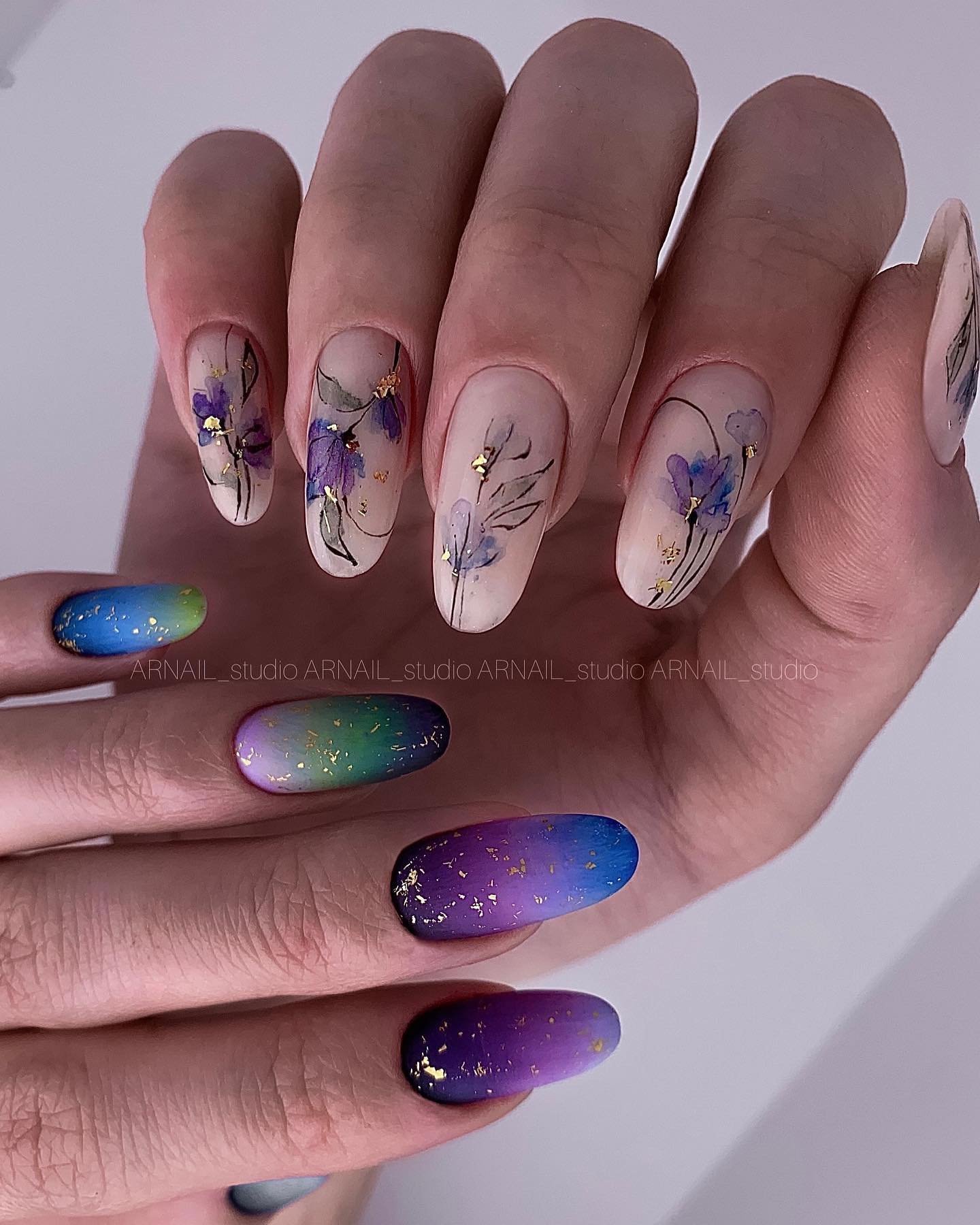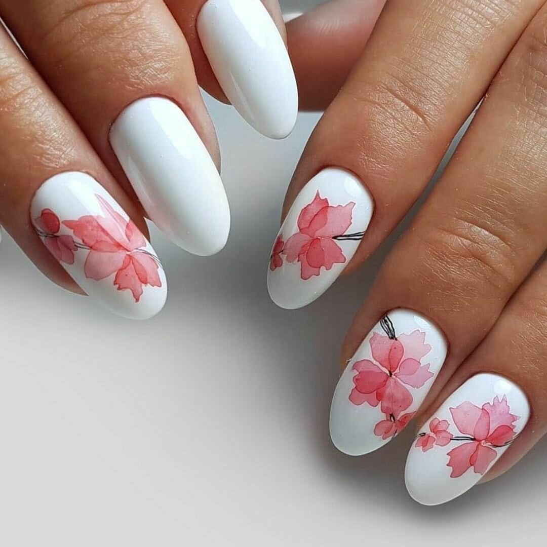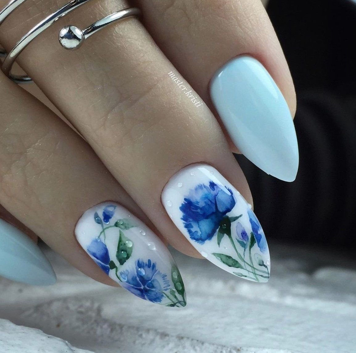 Акварельные рисунки — это мило, нежно и стильно. Недостатком такого дизайна является сложность исполнения. Если вы решите обратиться за таким маникюром в салон, обязательно посмотрите портфолио мастера. От его мастерства и художественного чутья напрямую зависит то, насколько аккуратным и красивым будет итог. Нарисовать акварельные цветы самостоятельно довольно сложно, но если у вас есть навыки художника — то вполне реально.