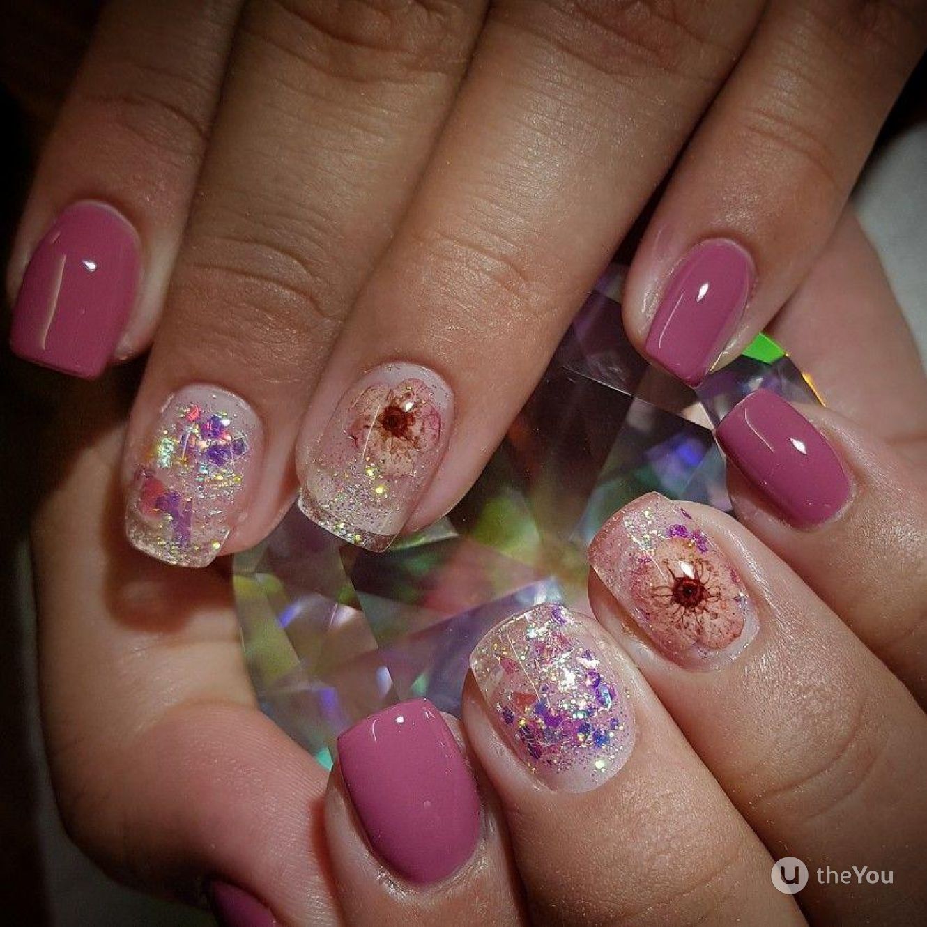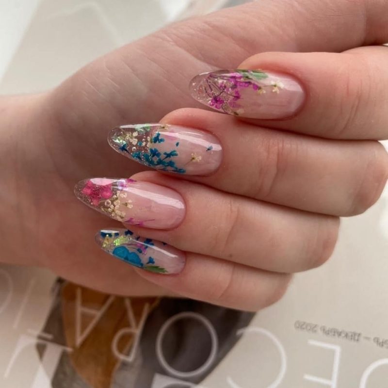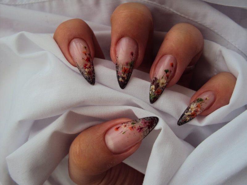 Что такое аквариумный маникюр? Это особая техника, при которой украшение ноготка происходит одновременно с его наращиванием. Дизайн создается послойно, закрепляется несколькими слоями прозрачного лака. Чаще всего для украшения используют блестки или разного рода декоративные элементы, создавая эффект аквариума. Несколько сезонов подряд в моде цветочный аквариумный маникюр. Только речь идет не о рисунках, а о сухоцветах. Тонкие веточки сушеных цветов словно плавают в прозрачном аквариуме.