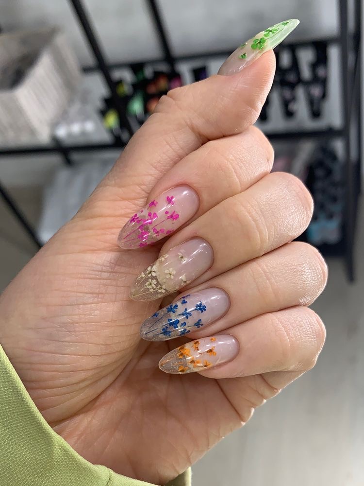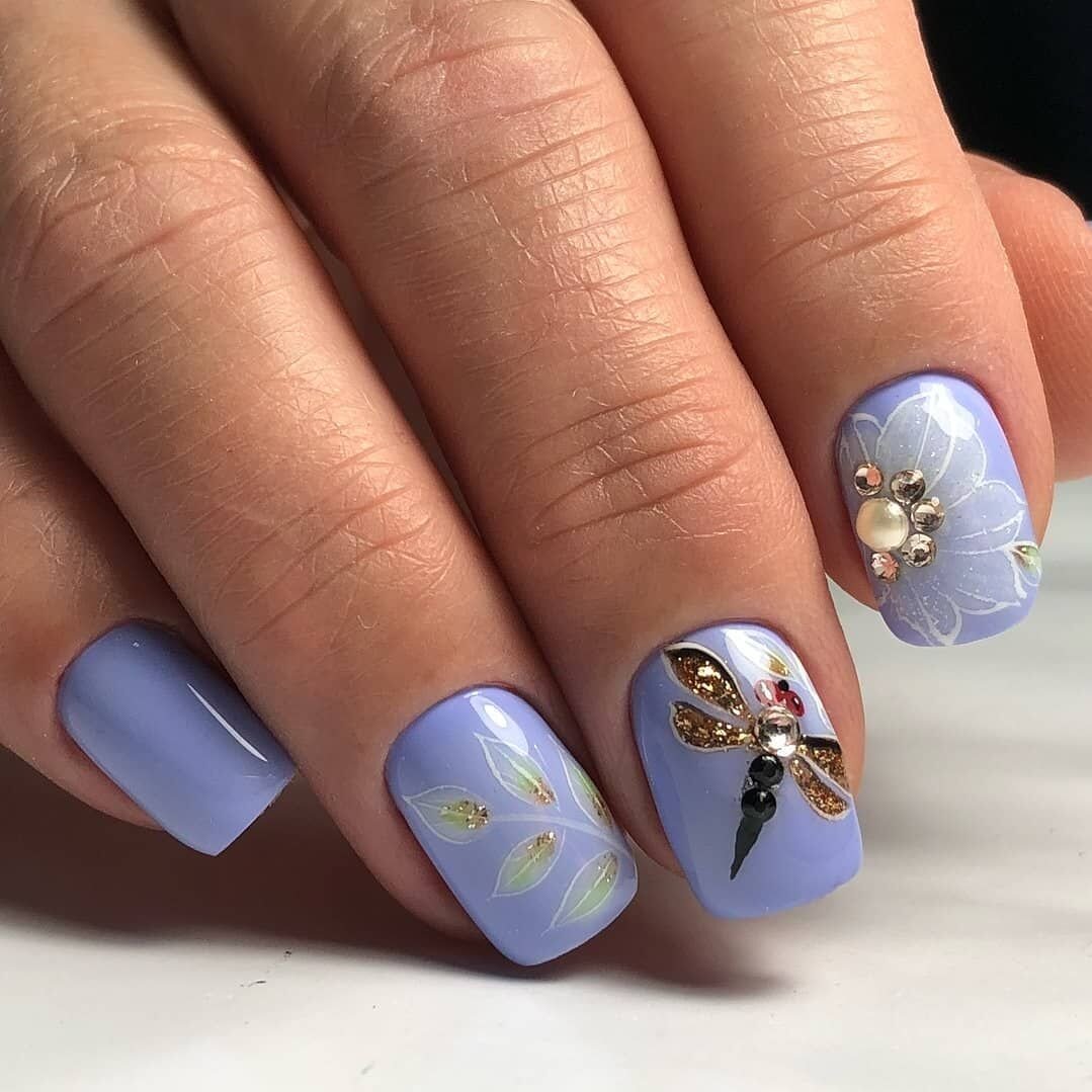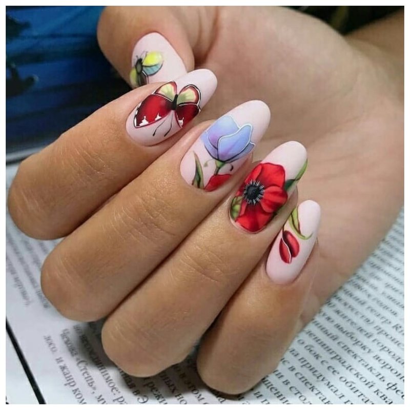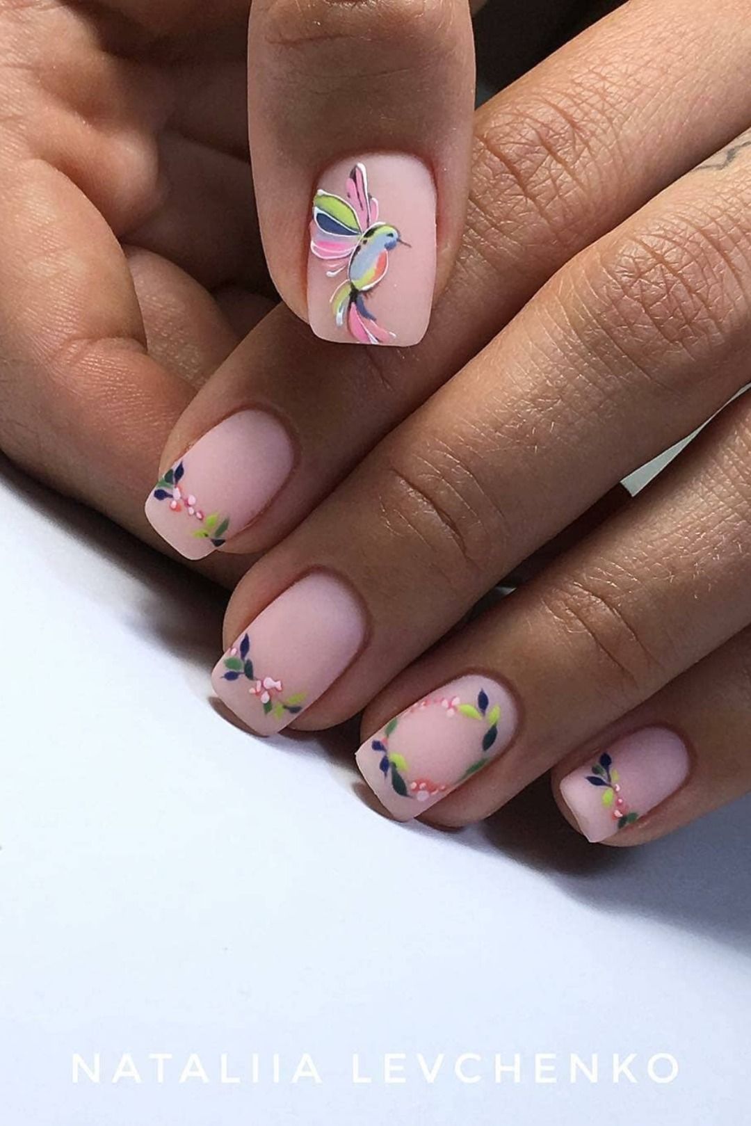 Чтобы разнообразить цветочный маникюр, добавьте в него немного фауны. Например, симпатичные мини птички — колибри или насекомые.