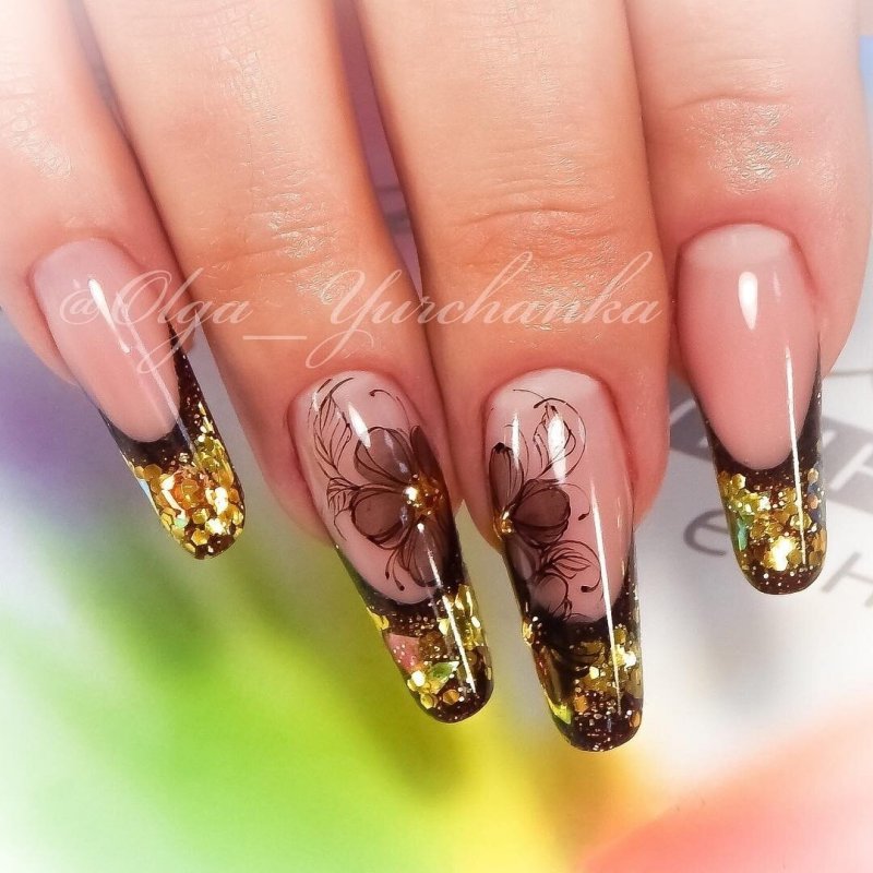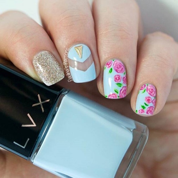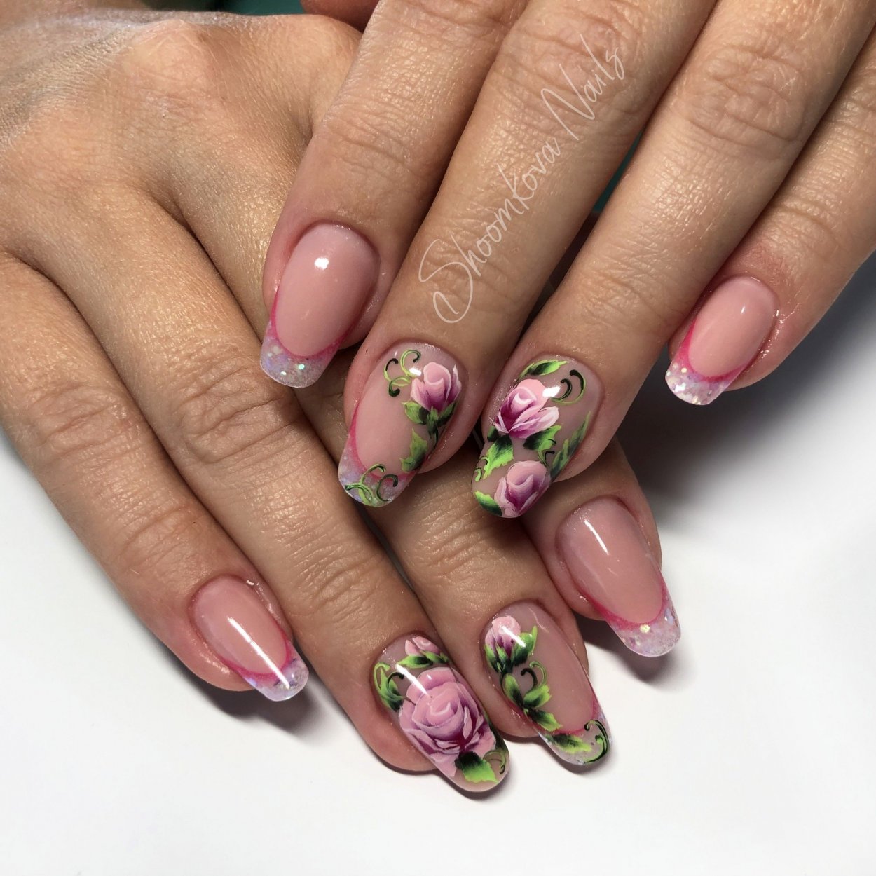Мы уже отмечали, что цветочный маникюр подходит для разной длины ноготков. Но стоит учесть некоторые нюансы, чтобы не сделать дизайн чрезмерным. Особенно это касается ситуаций, когда нейл-мастер или модница сочетают несколько техник. Например, рисунок цветов и стразы, блестки и др.