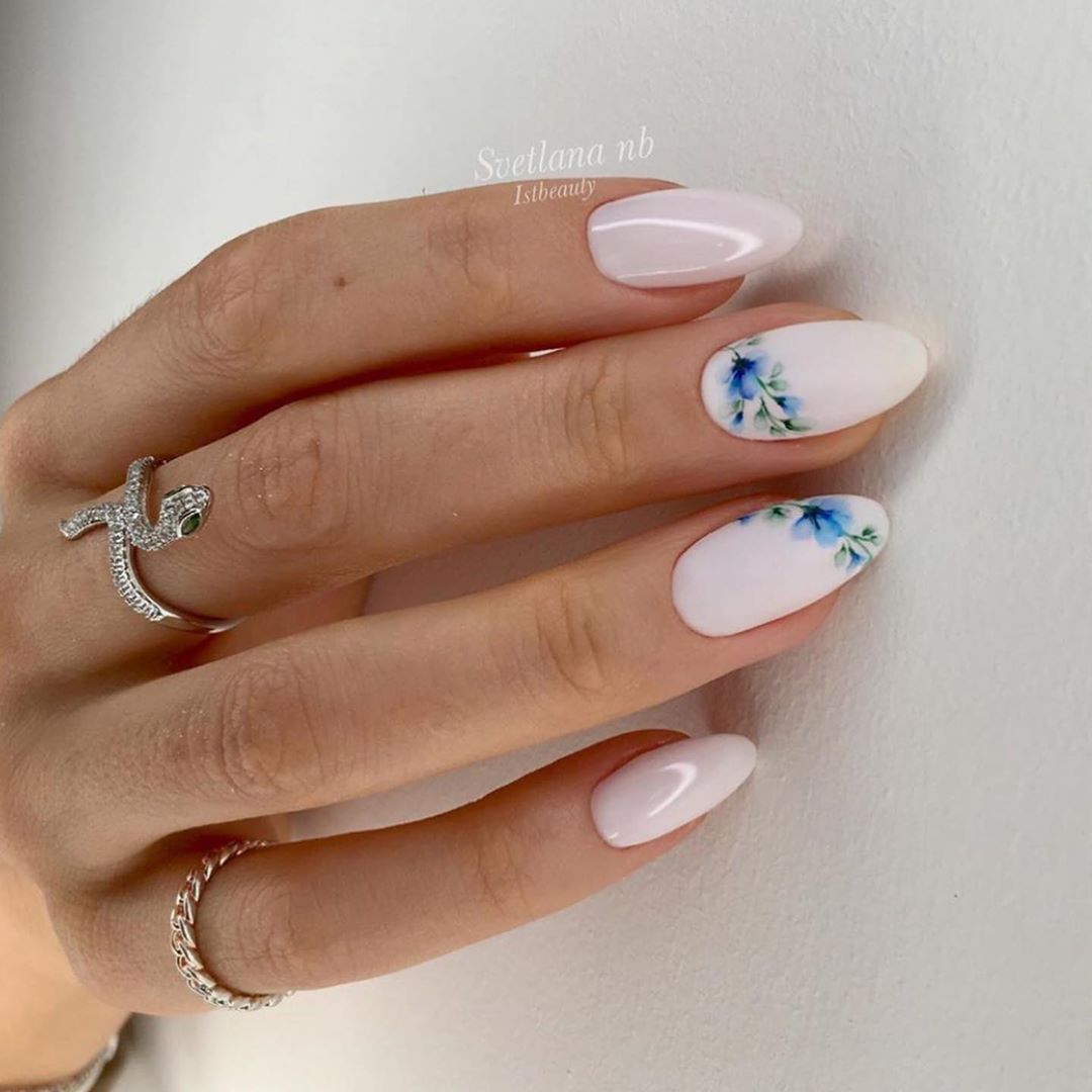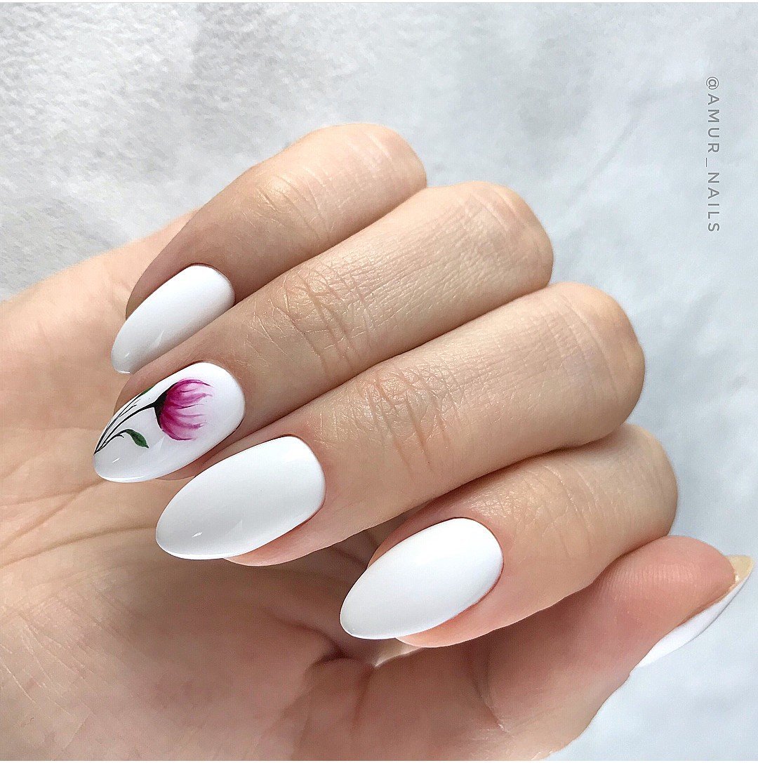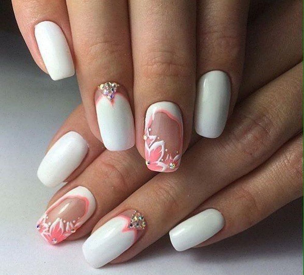 Это отличная база для цветочного маникюра. На белом фоне можно создавать цветы самых разных оттенков. Кстати, такая база способна уравновесить самый активный дизайн. Смело украшайте рисунки стразами, блестками или фольгой. Если белый цвет кажется вам слишком активным, замените его на молочную базу.